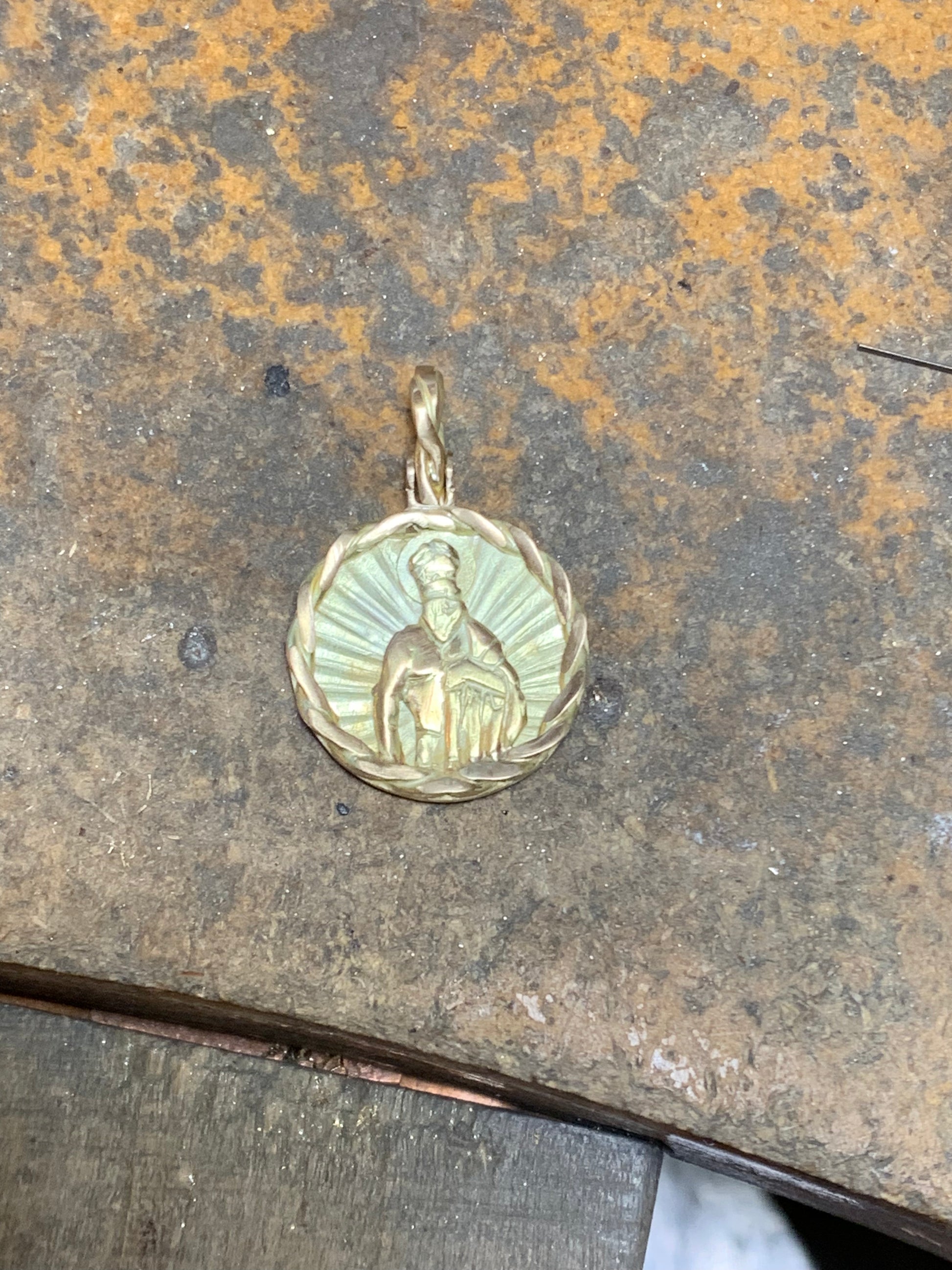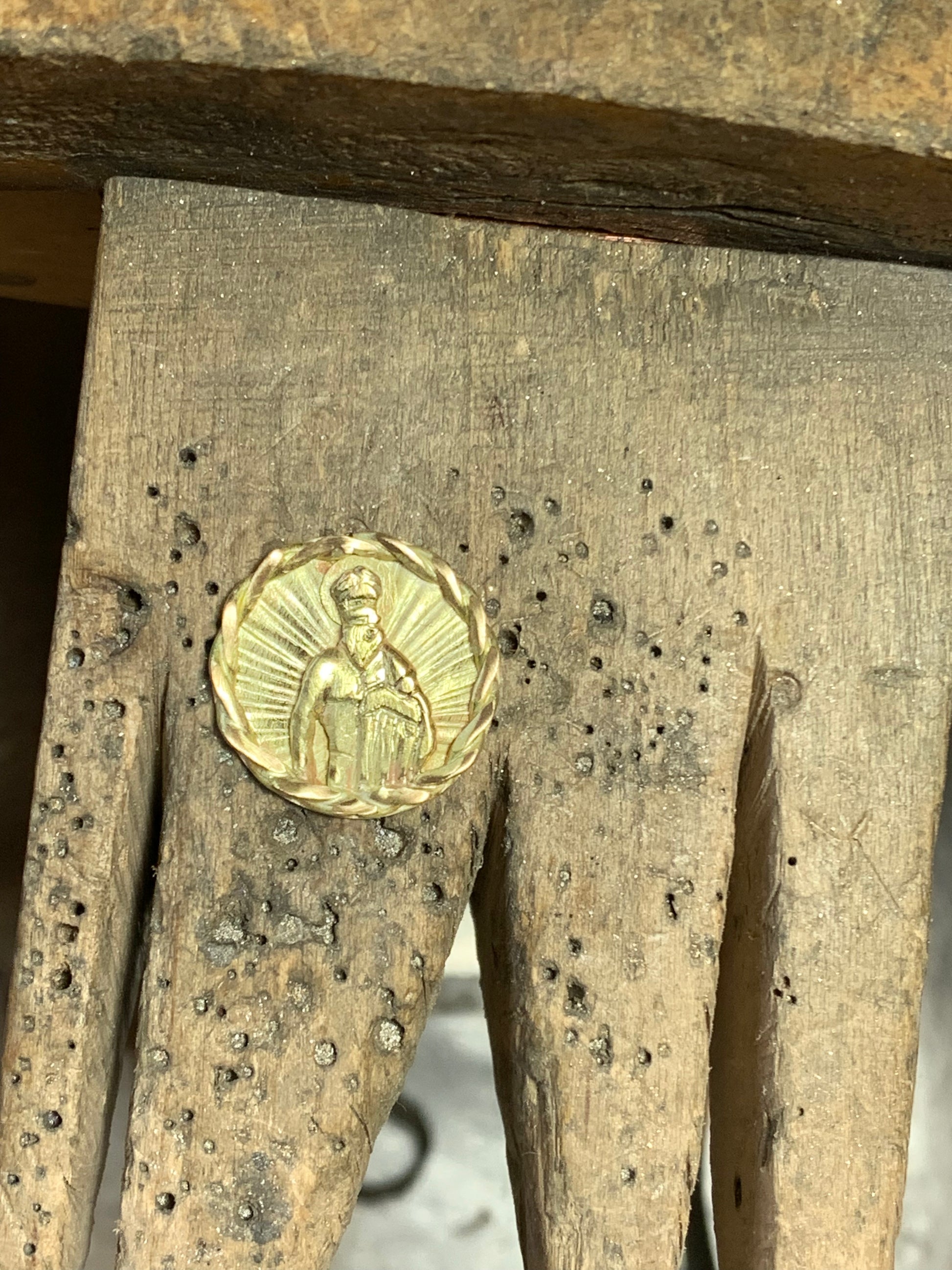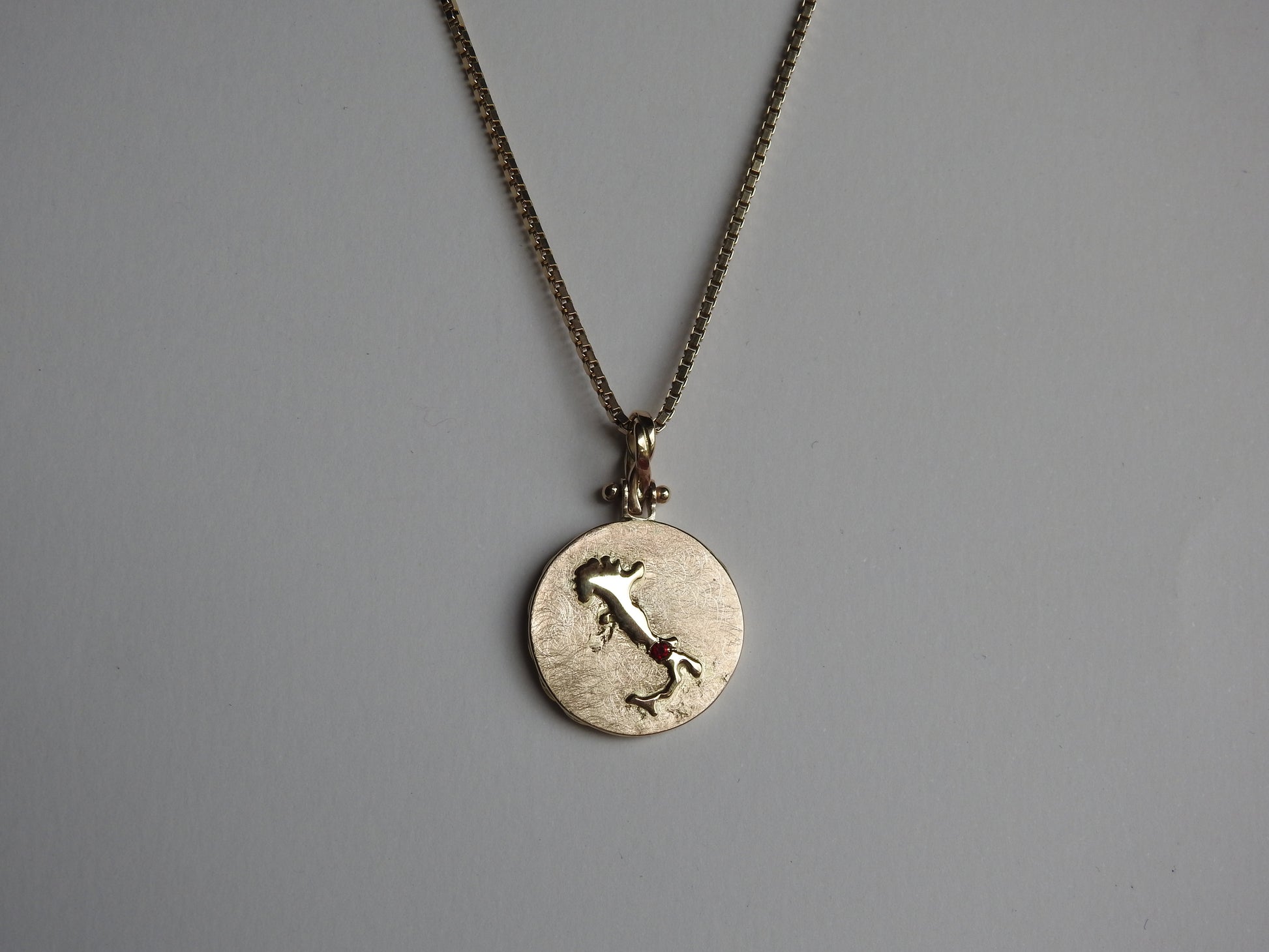 Bespoke Saint Bartholomew/Italy pendant: Re-working gold form Ben's grandparent's jewellery to create this unique ZEALmetal design. On the map of Italy is set a ruby from Ben's fathers ring in the location where his grandparent's were born.