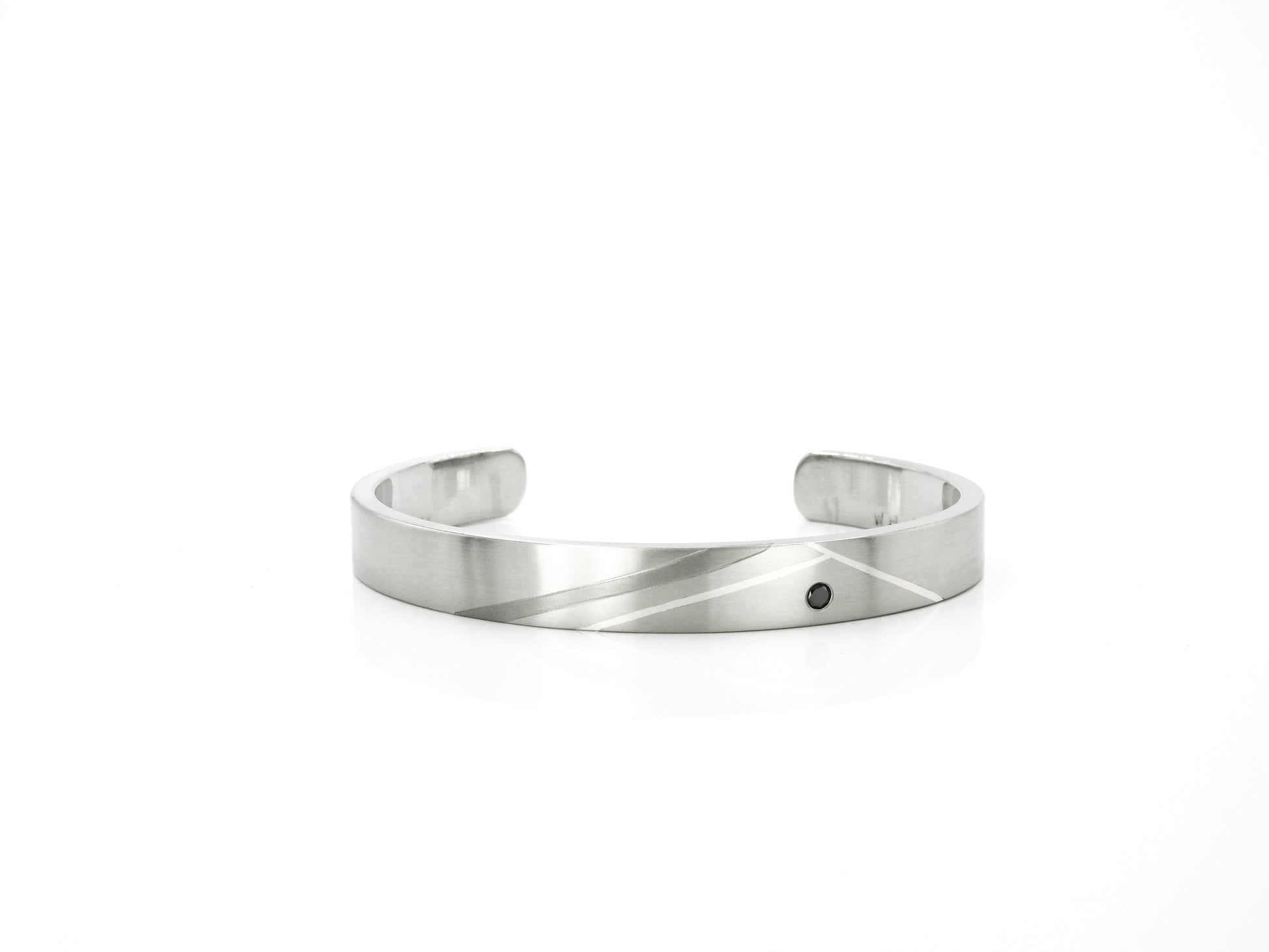 Handmade men's black diamond cuff in white gold, Tantalum inlay, sterling silver inlay and a .10 pt round facetted diamond.