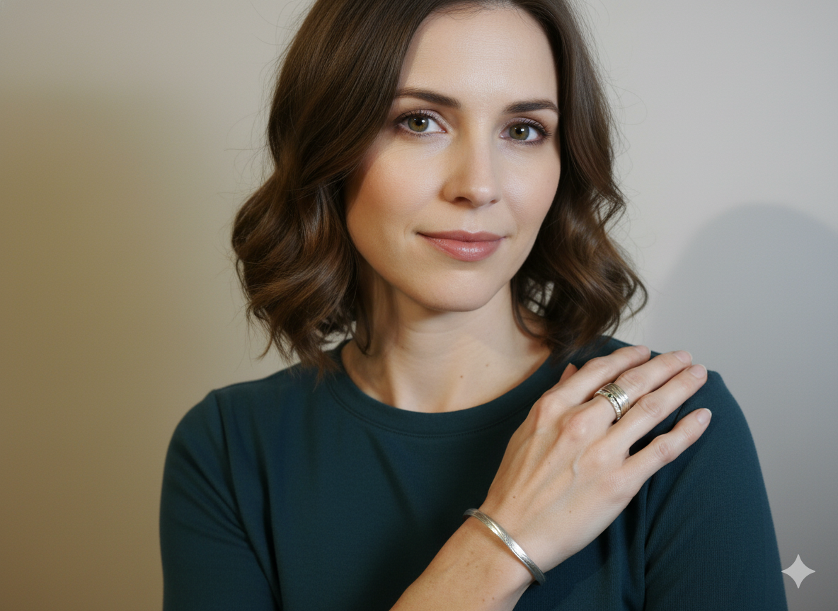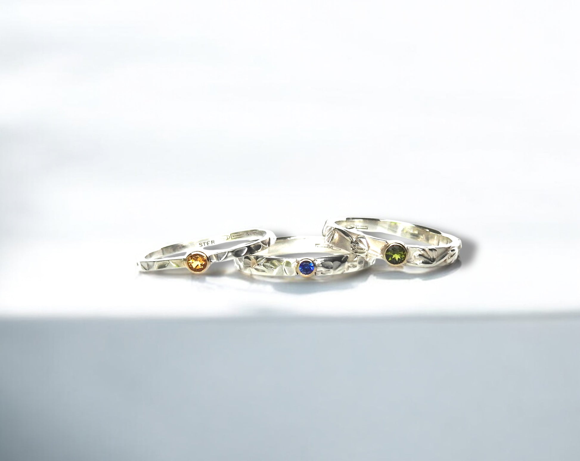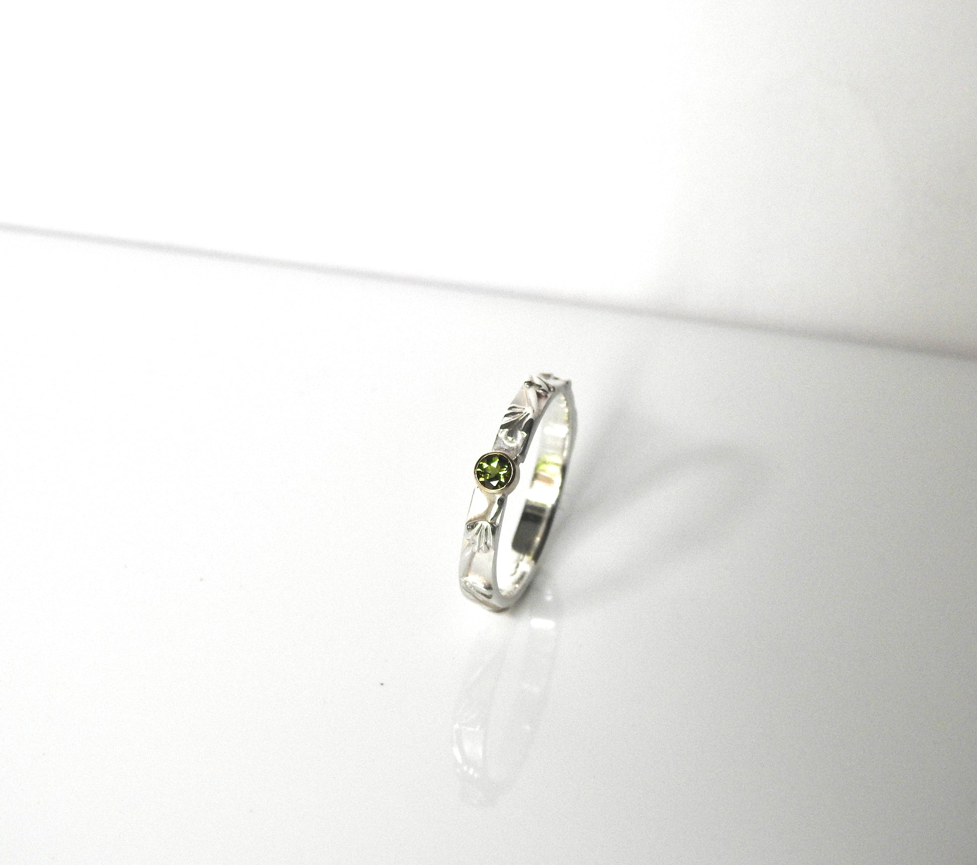 3mm blossom carved band with blossom raised designs with 14kt yellow gold bezel and 3mm round facetted green tourmaline.