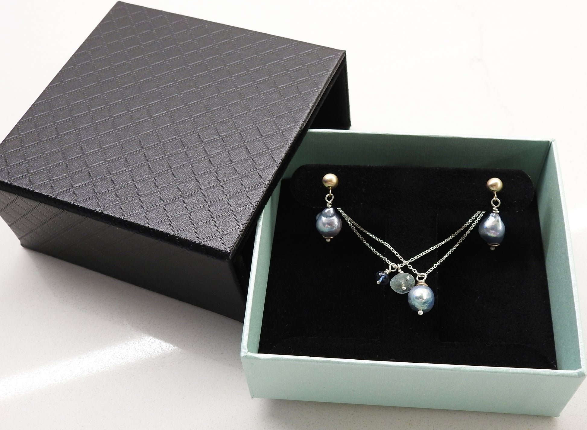 Double strand cut cable chain in sterling silver with grey baroque drop, aquamarine facetted drop and small tourmaline facetted drop.