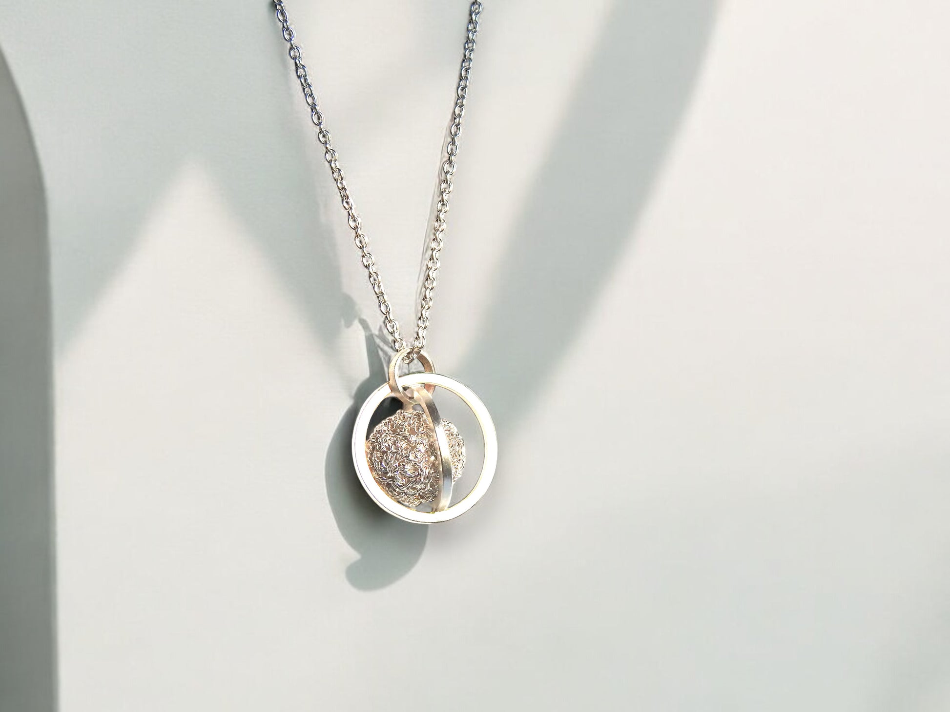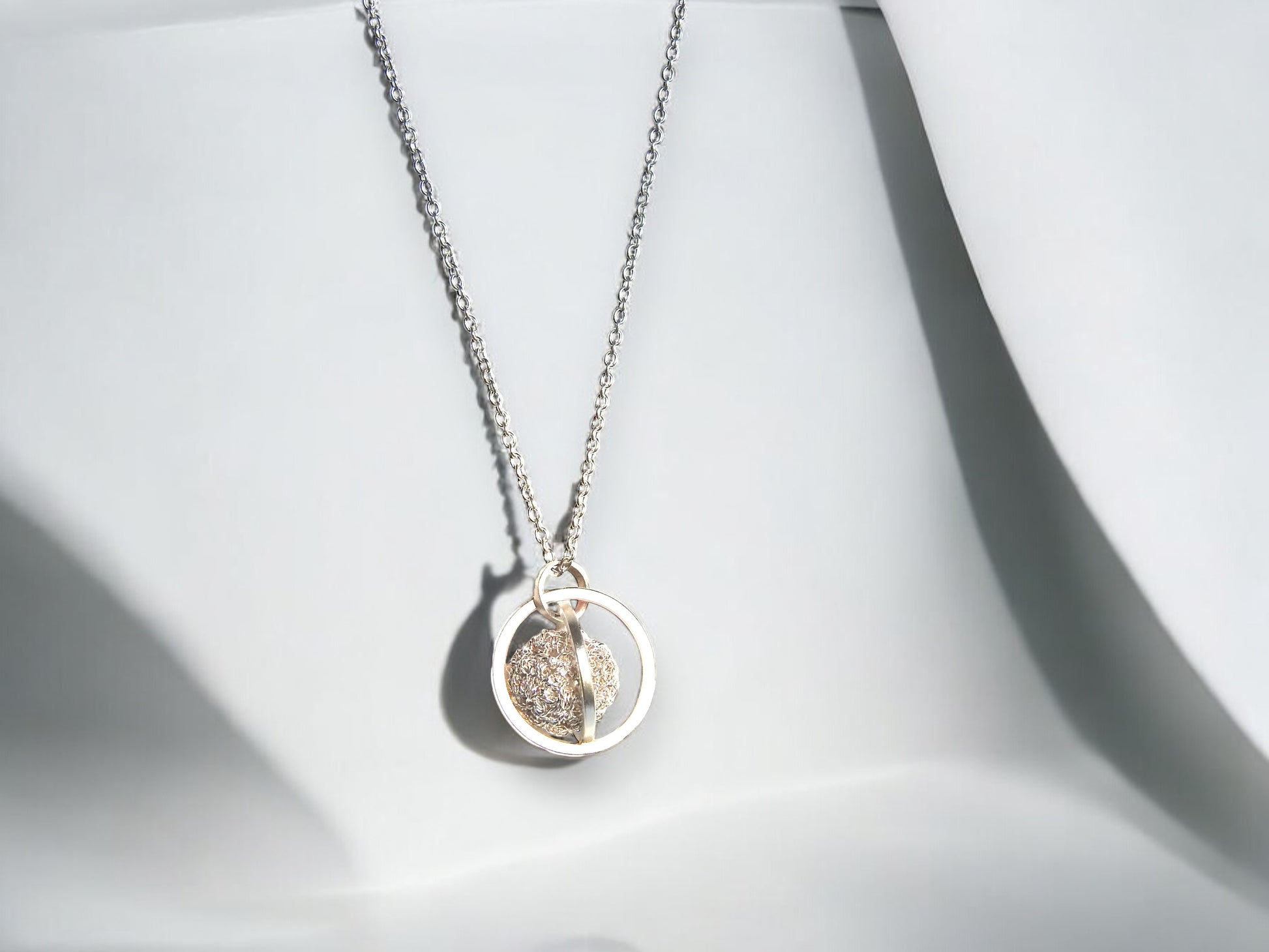 Free floating crocheted ball with cultured freshwater pearl within, circular frame in sterling silver hanging on 18" sterling silver cable chain.