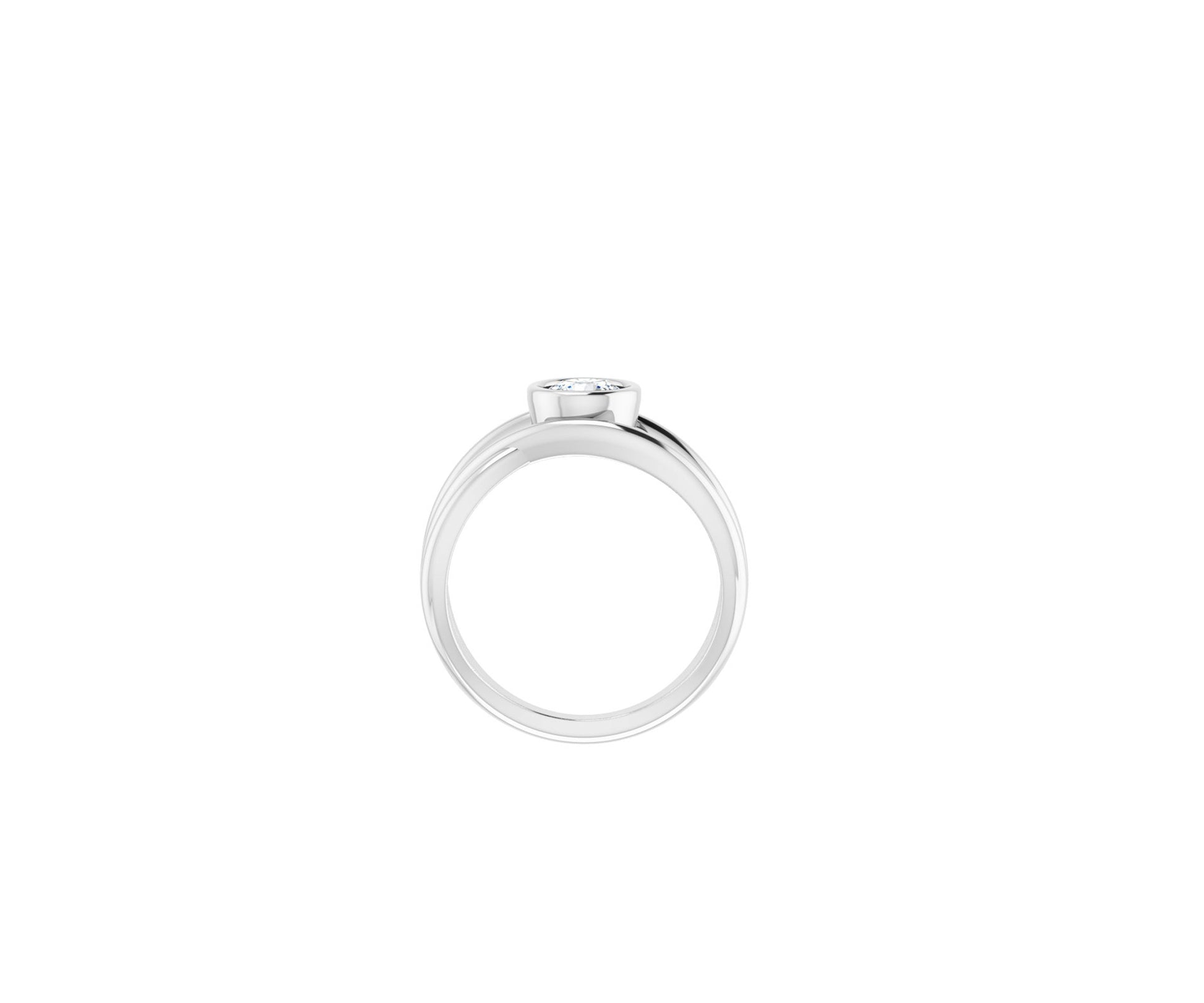 Classic simple flowing, crossing, rounded wires with a tapered back, and clean protective bezel showing with .60 ct CANADAMARK brilliant cut diamond.