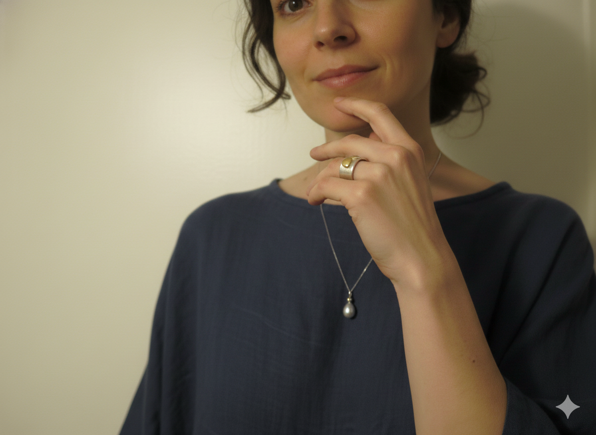 Organic yellow gold pendant with gypsy set diamond and beautiful soft iridescent pear pearl, on 1mm 14kt white gold cable chain 18' length