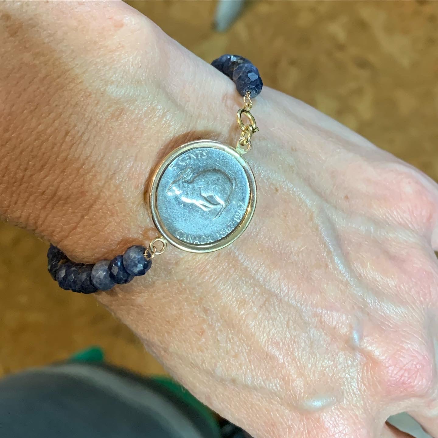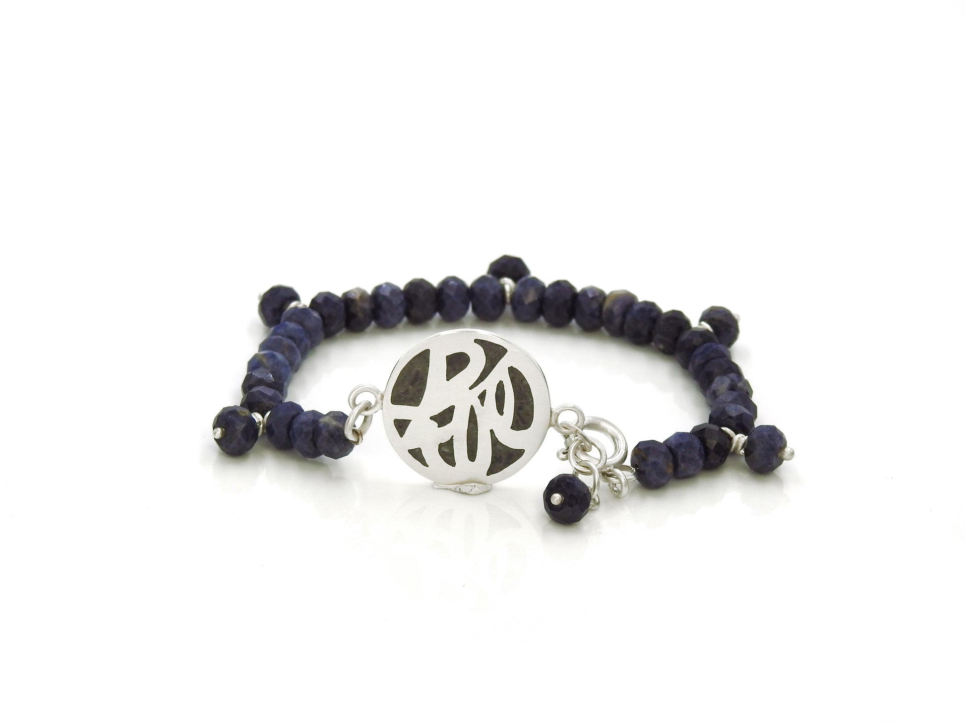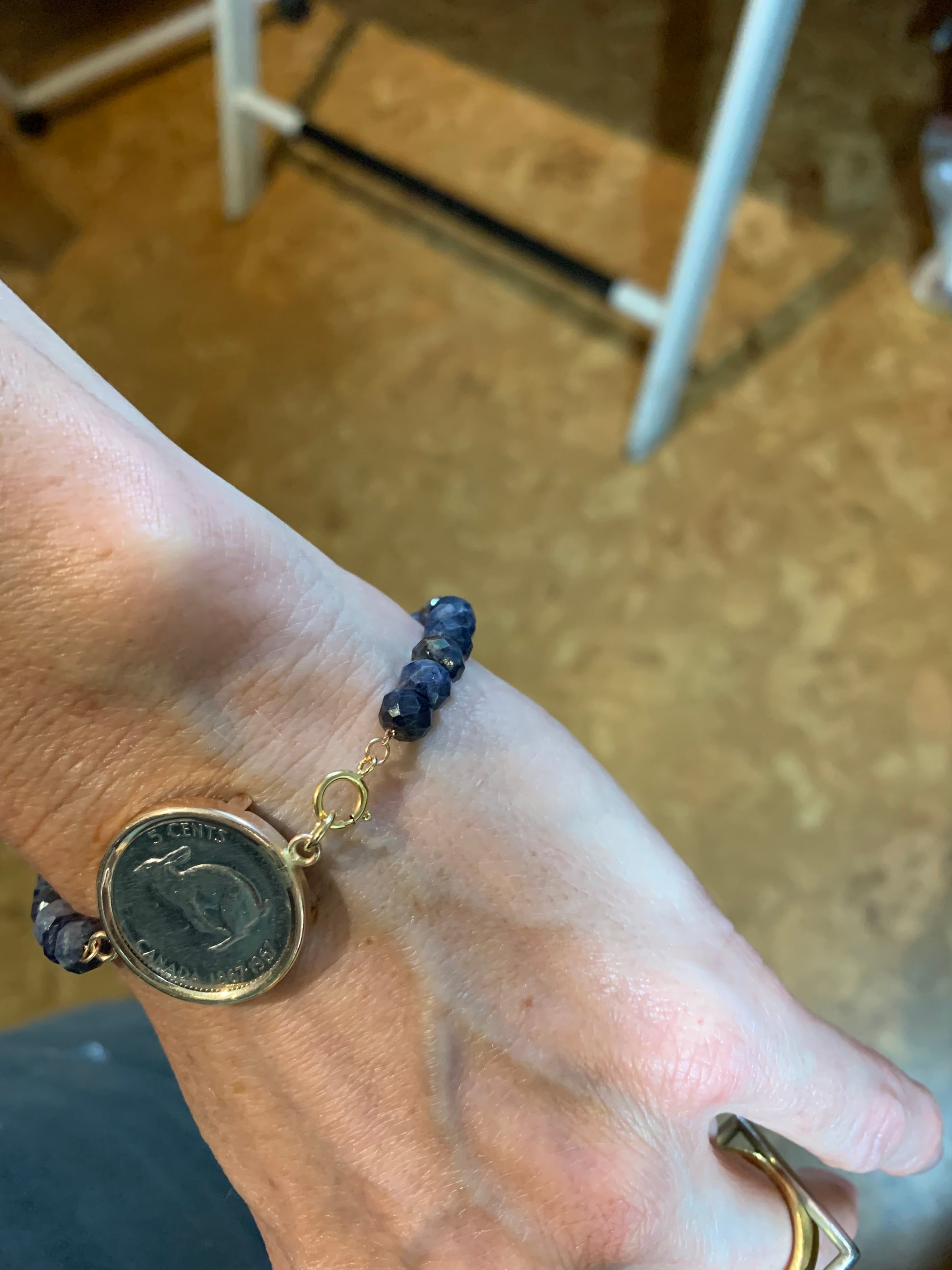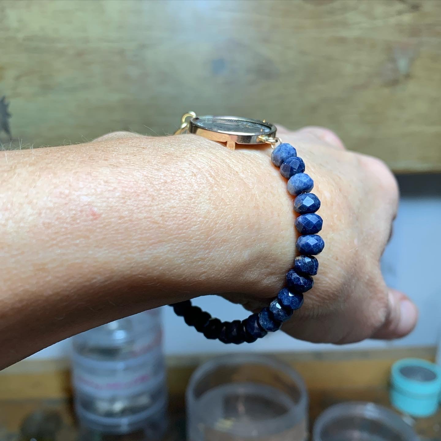 This design is available to be tailored for you. Disc style bracelet with denim blue coloured, faceted 4x6mm rondelle shape sapphire beads with spring ring clasp at the side for easy wear.