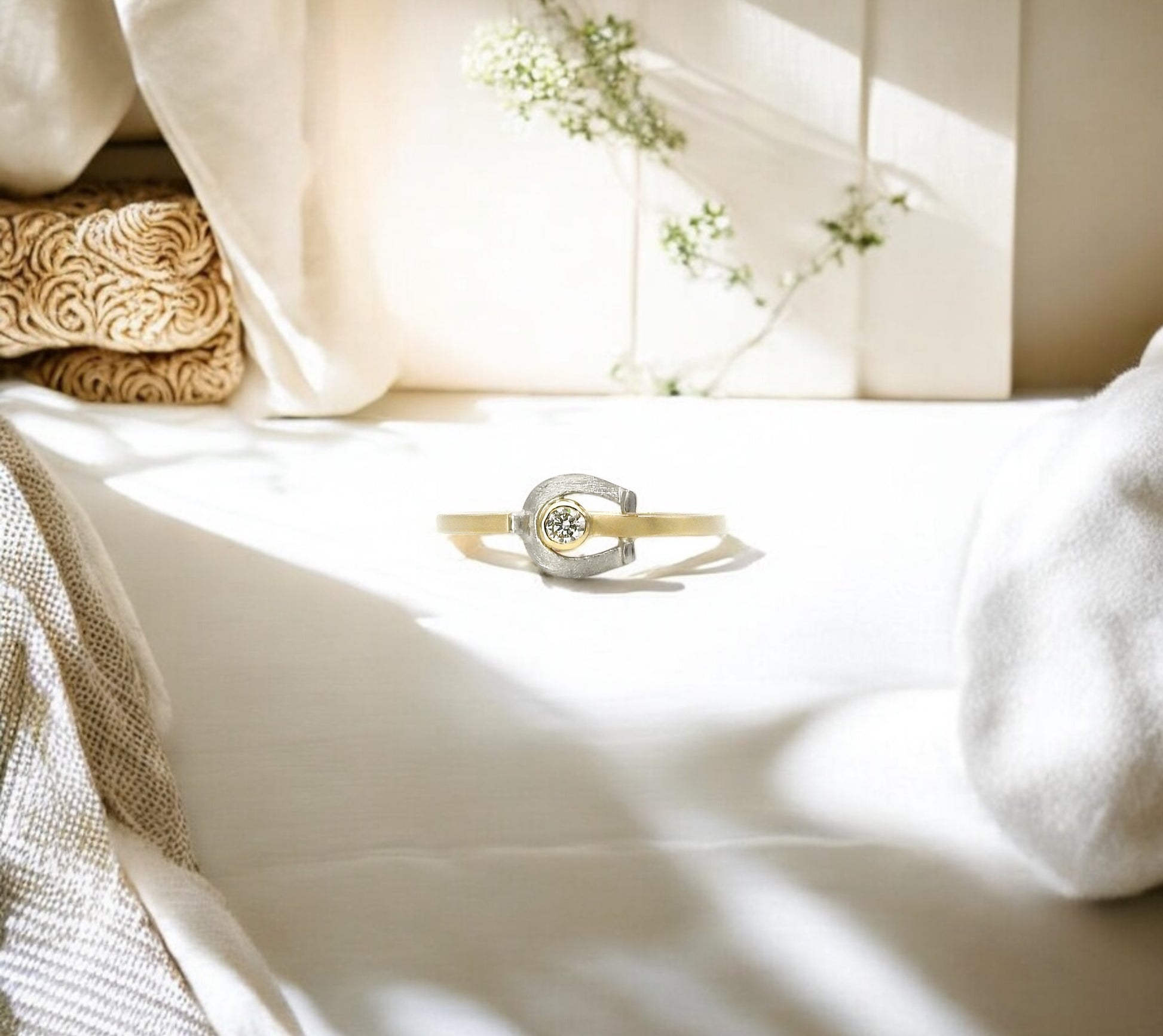 Enjoy the ride ~ 14kt yellow gold 1.5mm band with palladium horseshoe ( not worried about luck just facing the flow.) With .10ct round brilliant cut diamond.