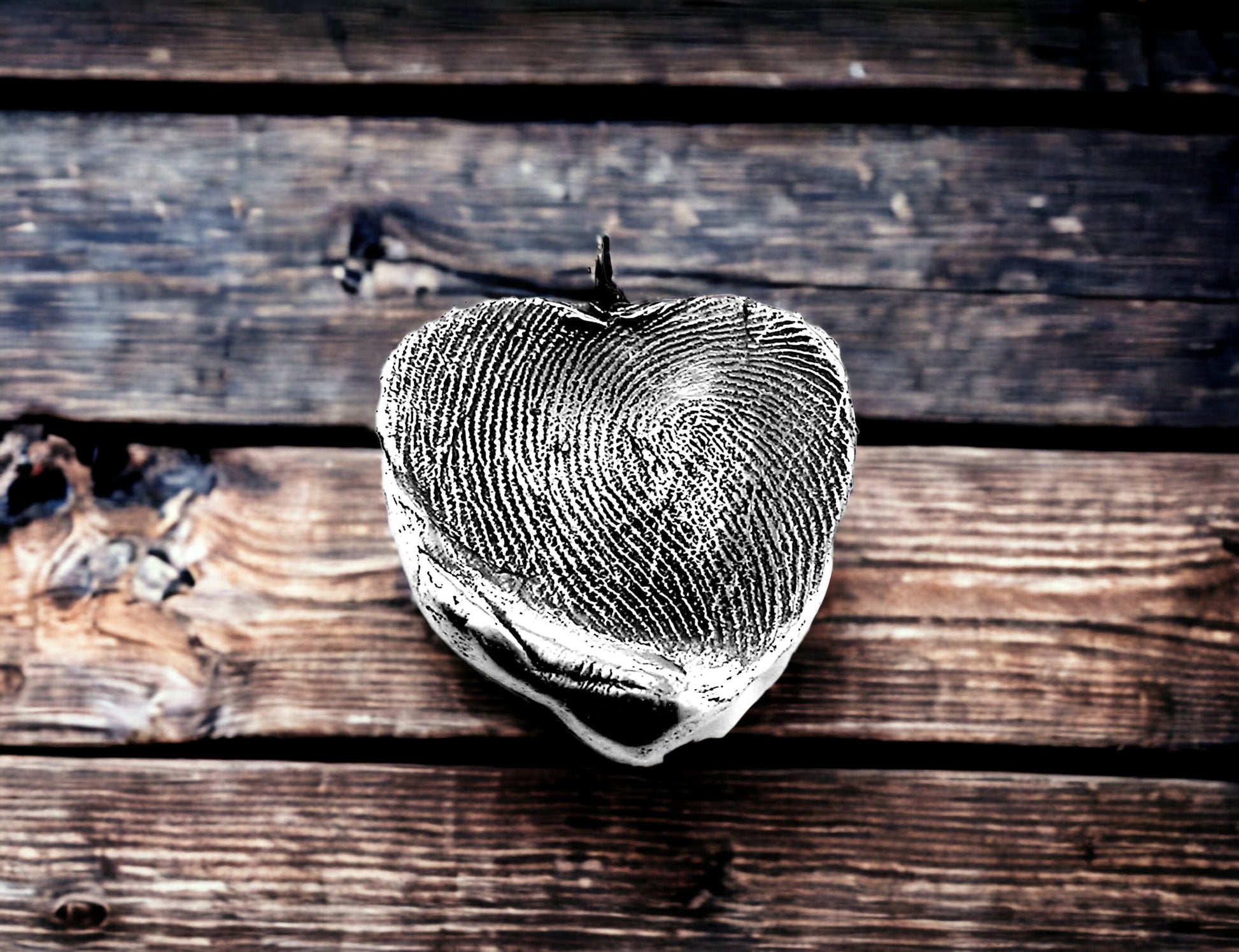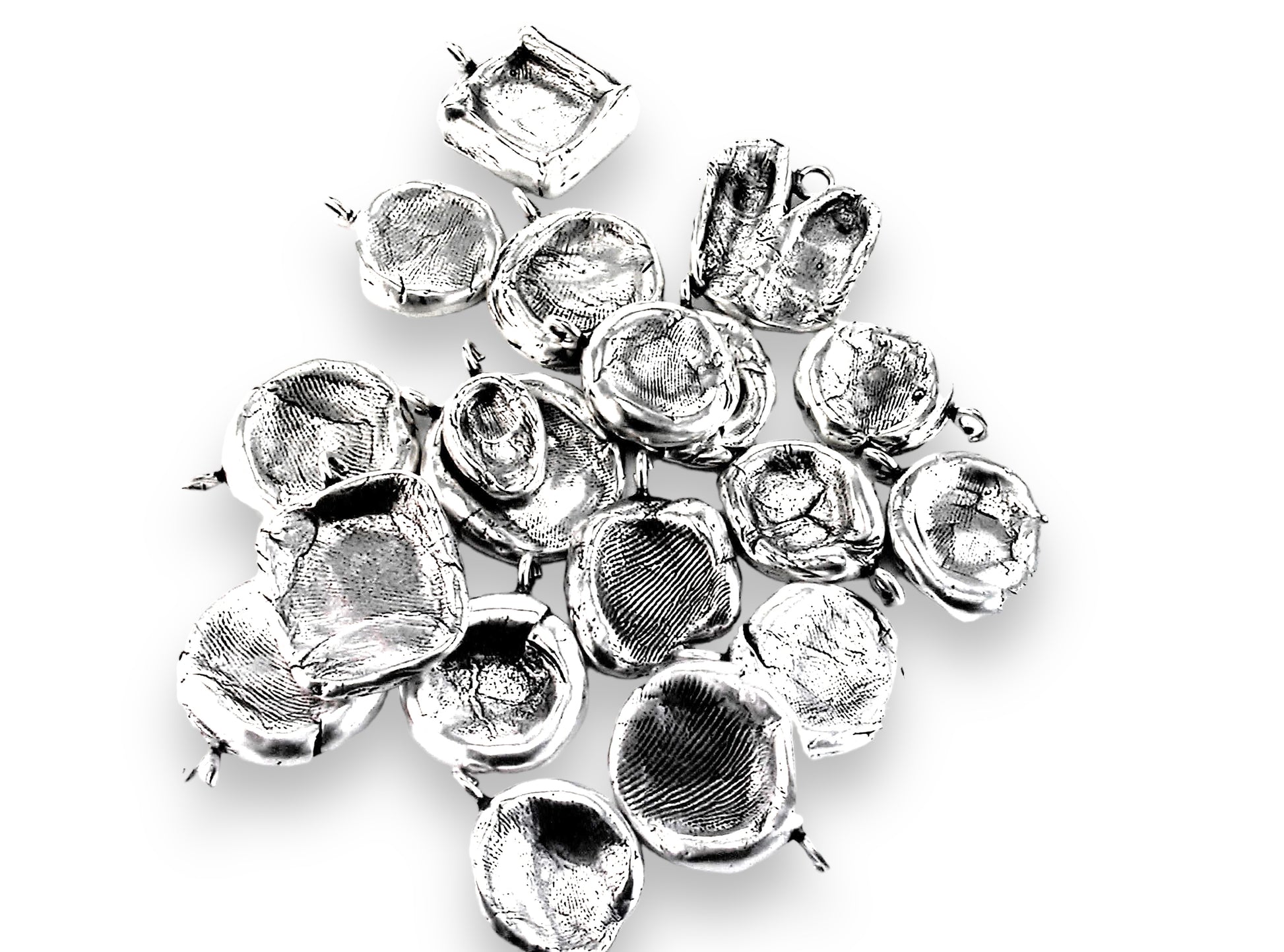 Organic fingerprint jewellery available in individual pendants, multiples, bracelets, rings, cufflinks, and tie tacks. (If you prefer not to have the print but just the impression that is available too.)