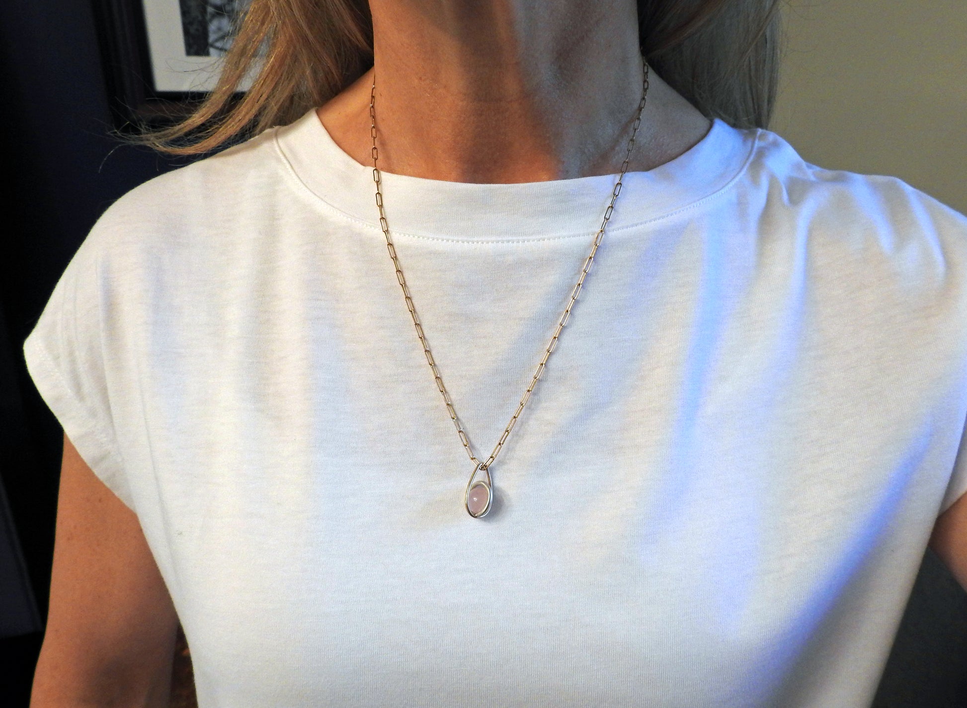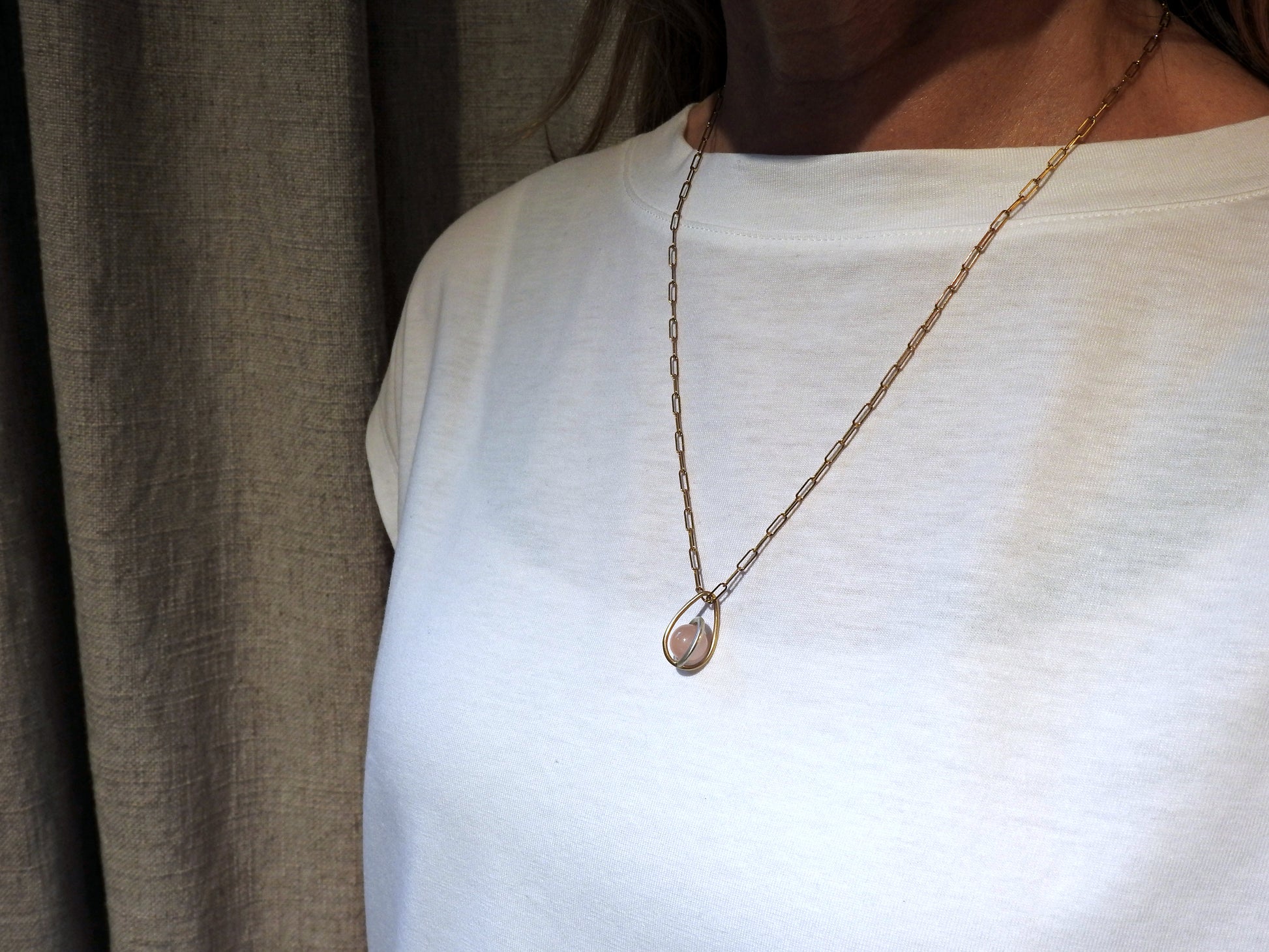 Gold drop shape link, sterling silver centre round link gently holding an un-drilled 8.5 mm rose quartz stone, free floating emphasizing space and freedom, infinite invisible.