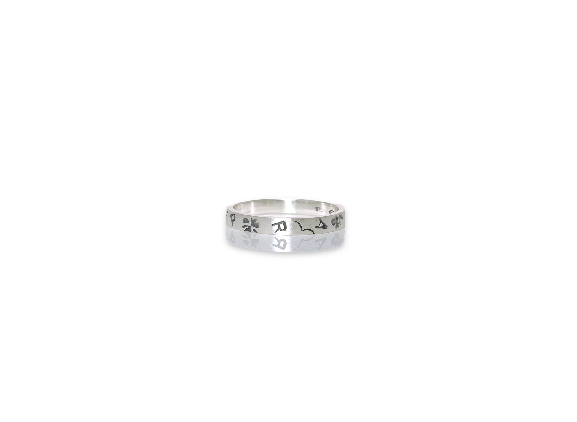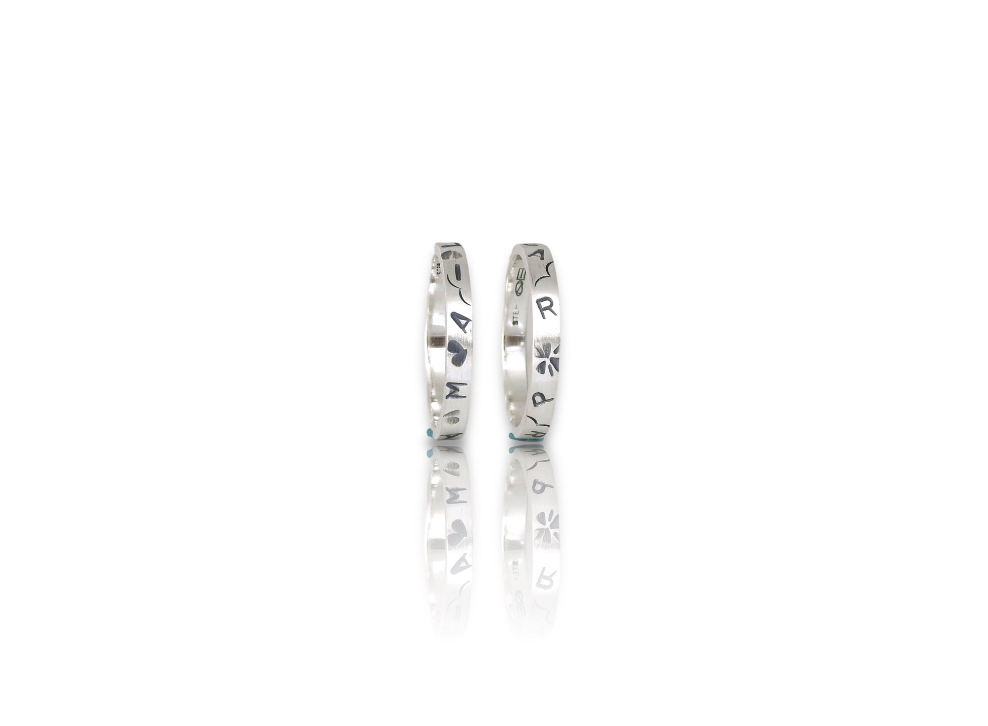 Graffiti Family ring stackers ~ Joyfully, randomly, spiralling letters, children's names favourite word, family initials unlimited potential to celebrate Life! The idea behind the stamping was to create more of a pattern look to the ring, you know what it is, but from a distance it simply look's patterned and is pointing more to space, to formlessness, defocusing from the word from form, and recognizing the space.