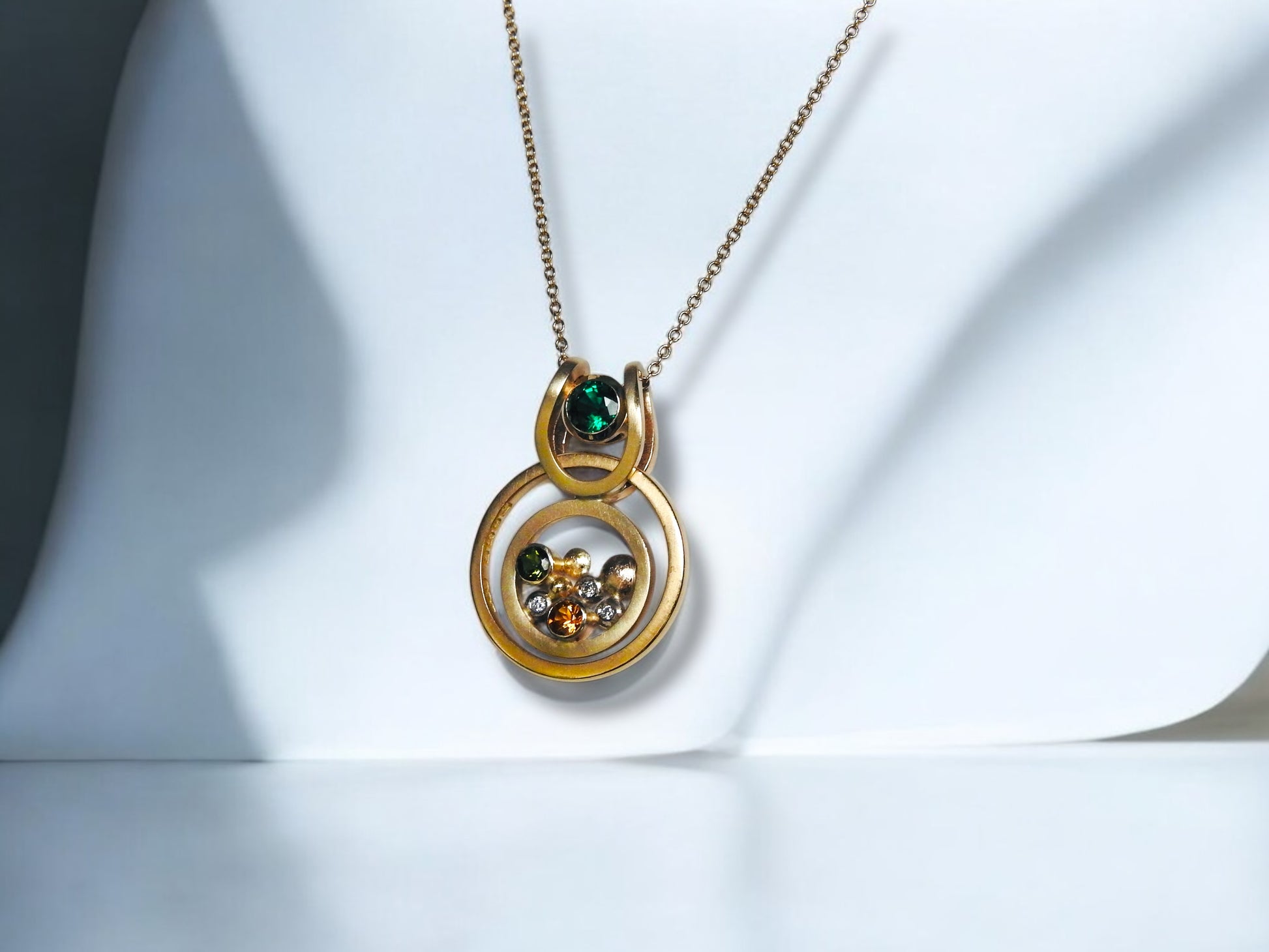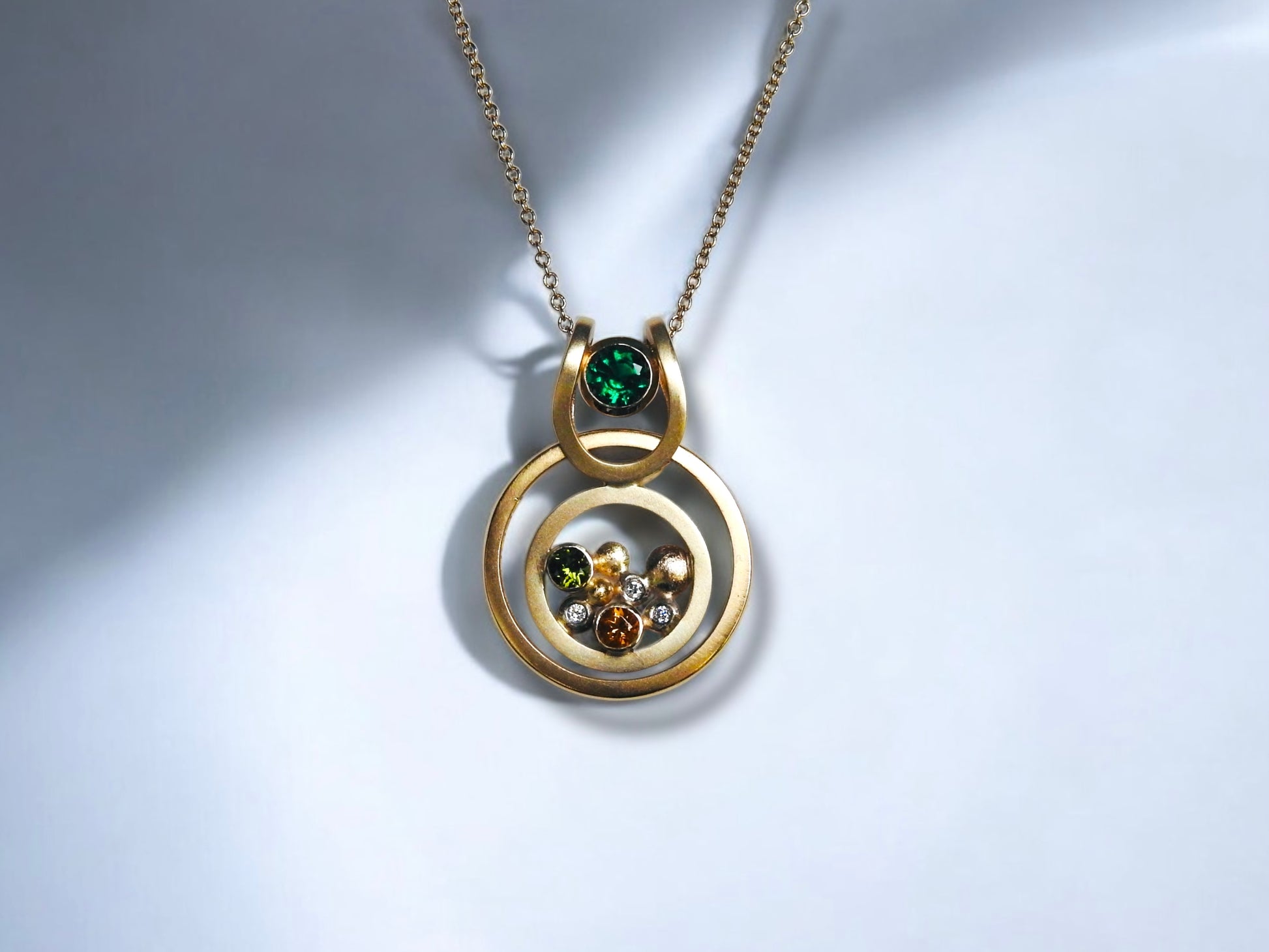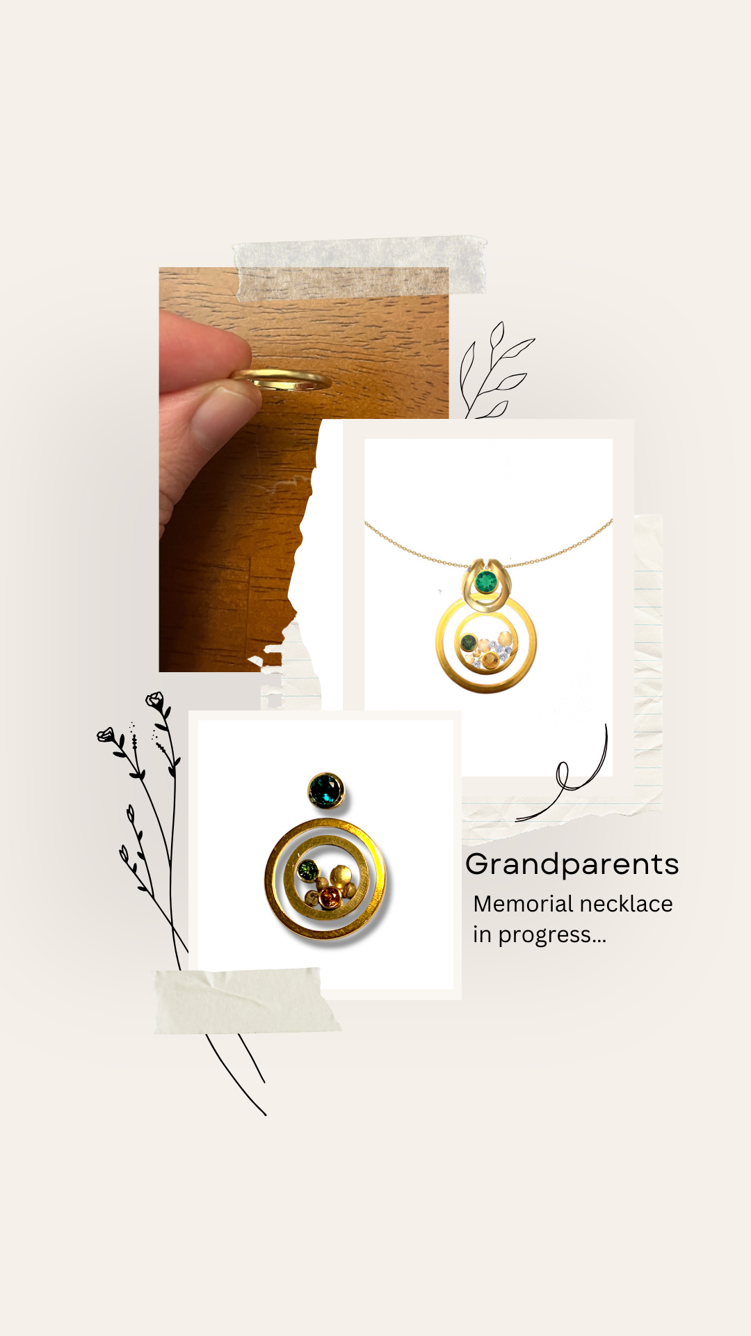 Bespoke Grandparents memorial necklace: Incorporating Laura's Grandmothers wedding band which floats un-touched or altered, and frames the design. In the centre is both her grandparents birthstones within the pebble design along with some diamond sparkle. At the top centre of the design is a lab-grown emerald floater which is Laura's birthstone in, 14kt yellow gold that can be worn on it's own or within the design.