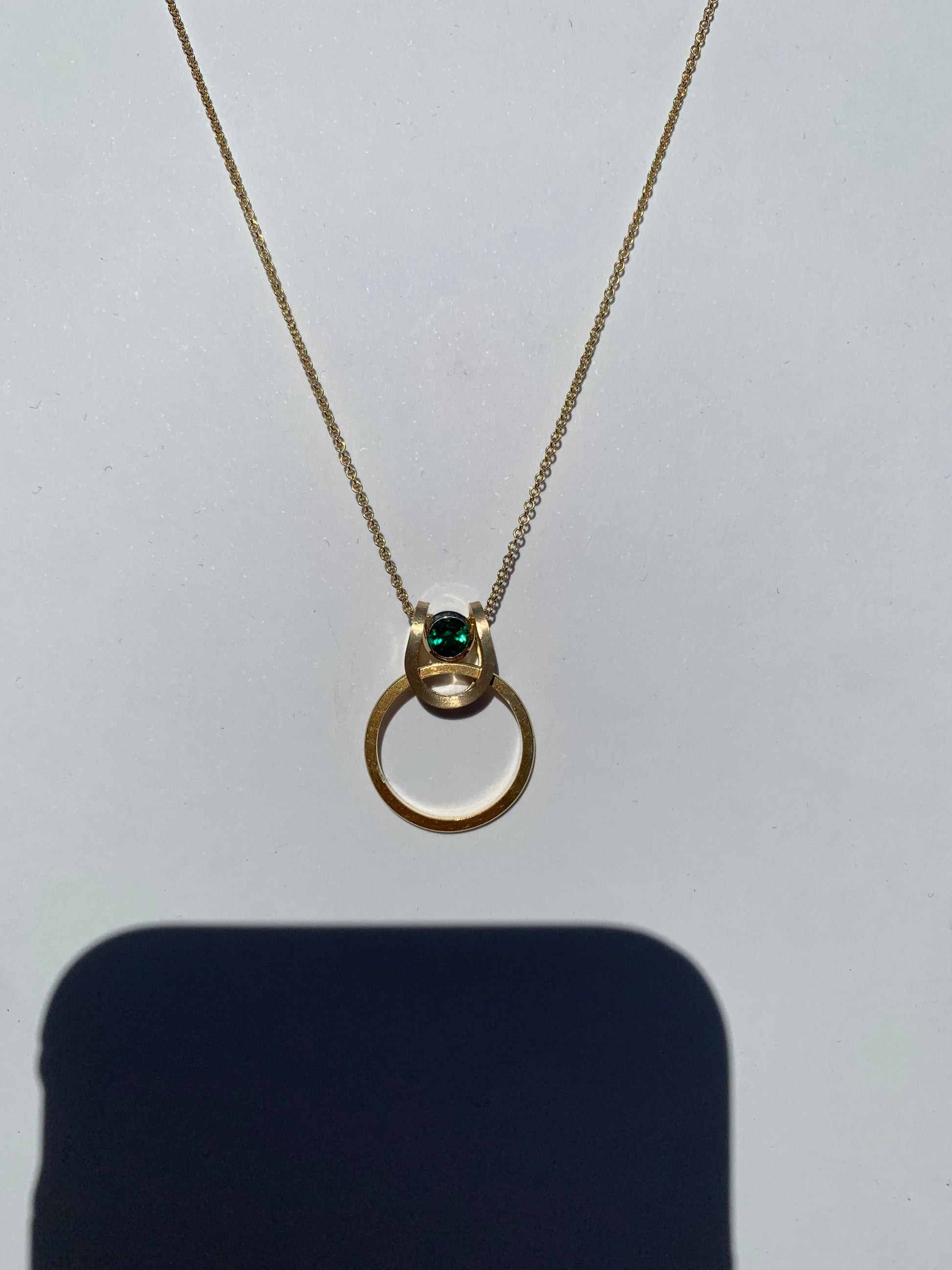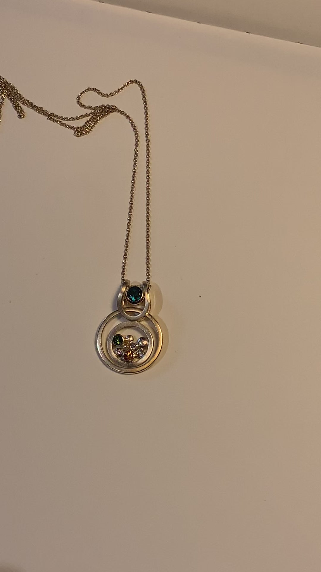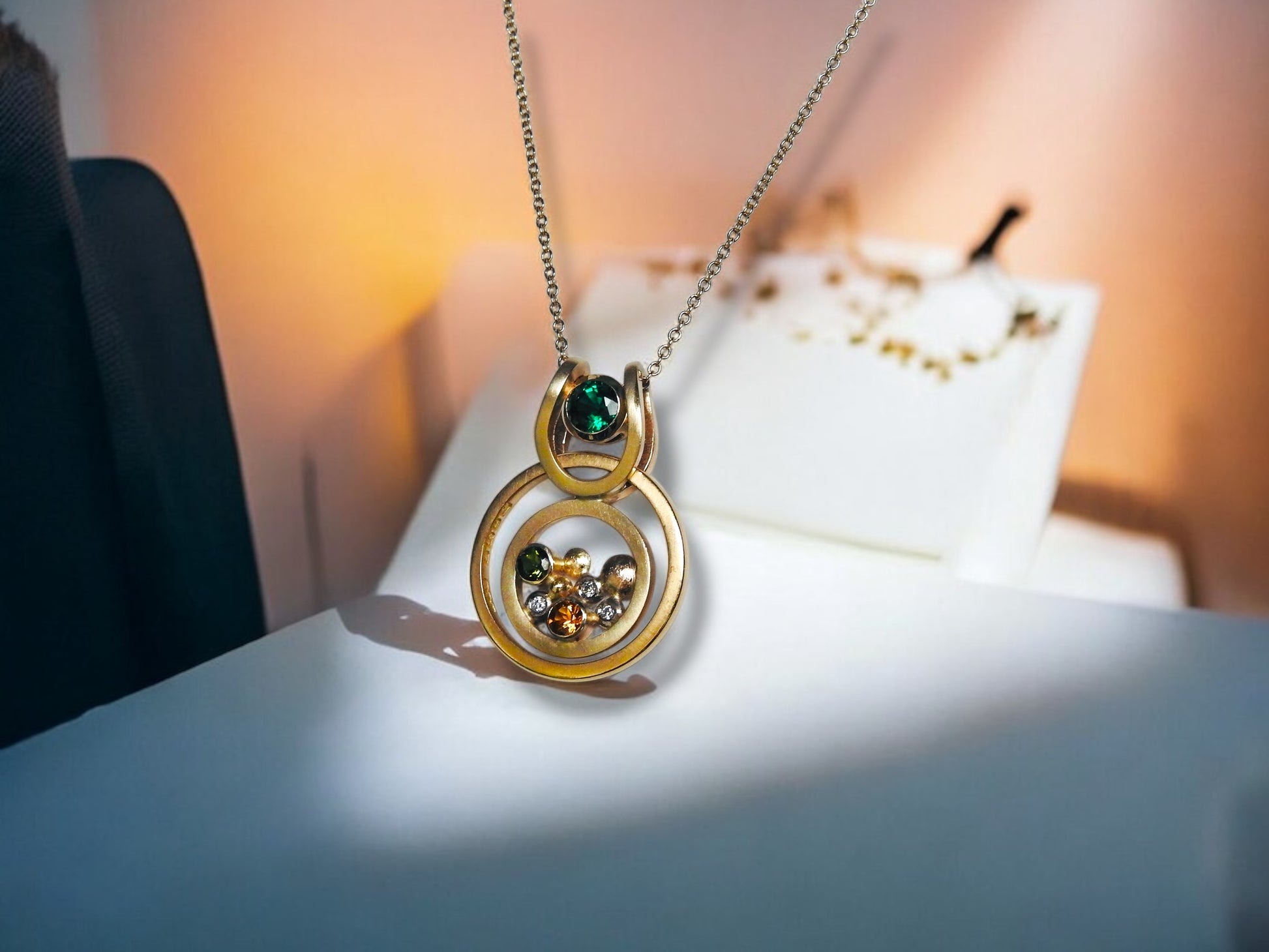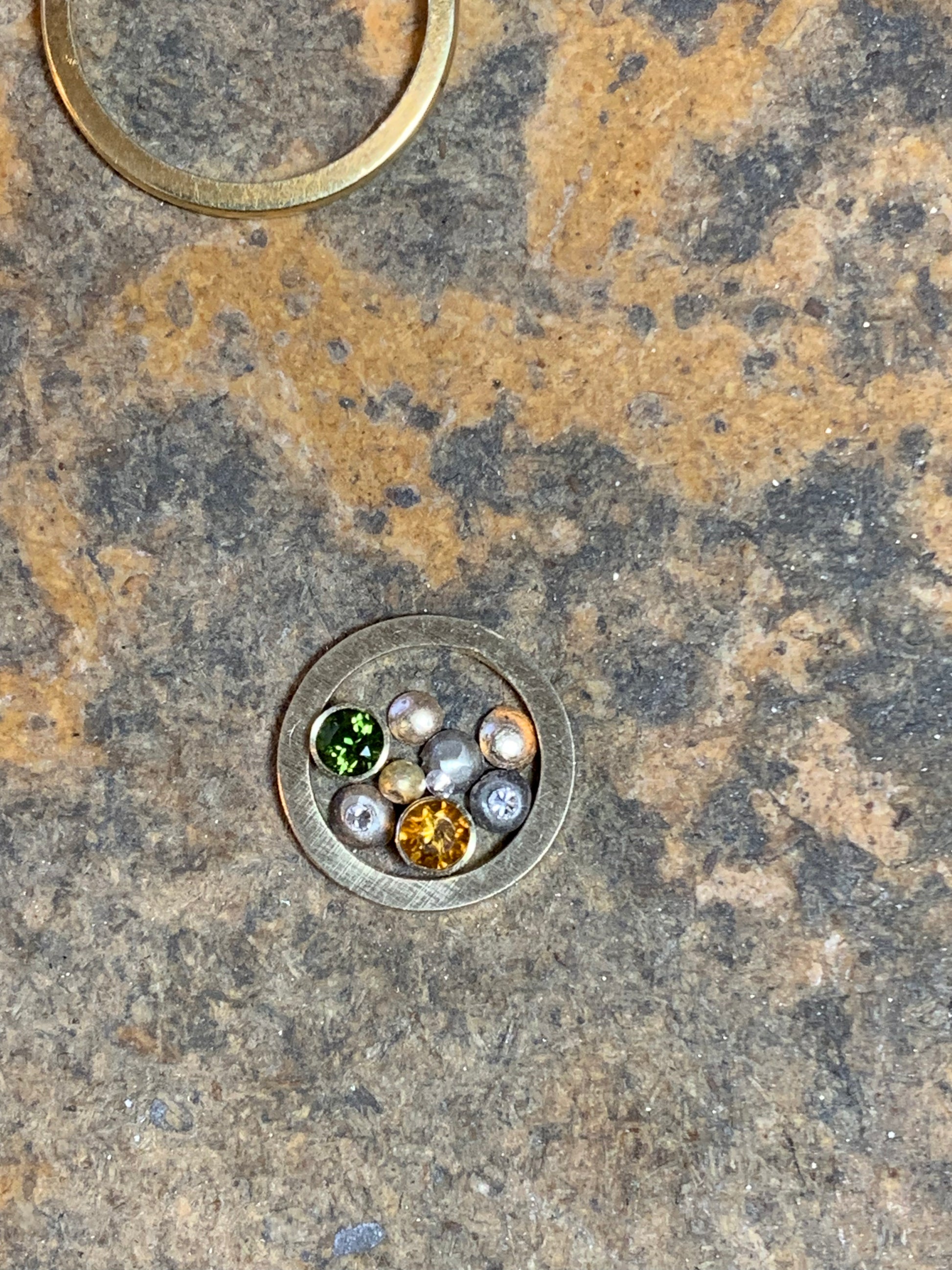 Bespoke Grandparents memorial necklace: Incorporating Laura's Grandmothers wedding band which floats un-touched or altered, and frames the design. In the centre is both her grandparents birthstones within the pebble design along with some diamond sparkle. At the top centre of the design is a lab-grown emerald floater which is Laura's birthstone in, 14kt yellow gold that can be worn on it's own or within the design.