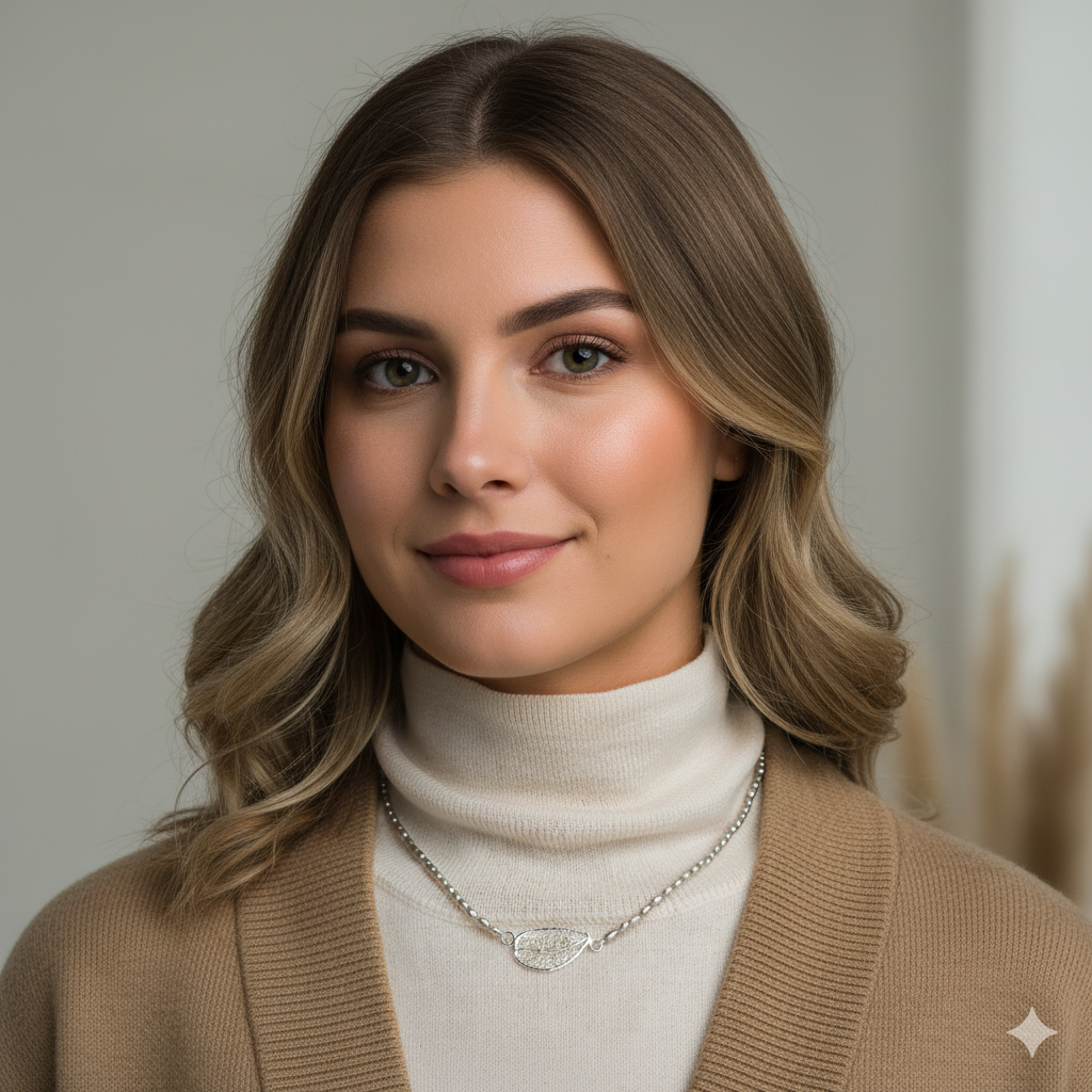 Fine silver crochet leaf, with sterling silver planish frame, on a strand of soft silvery rice peals.