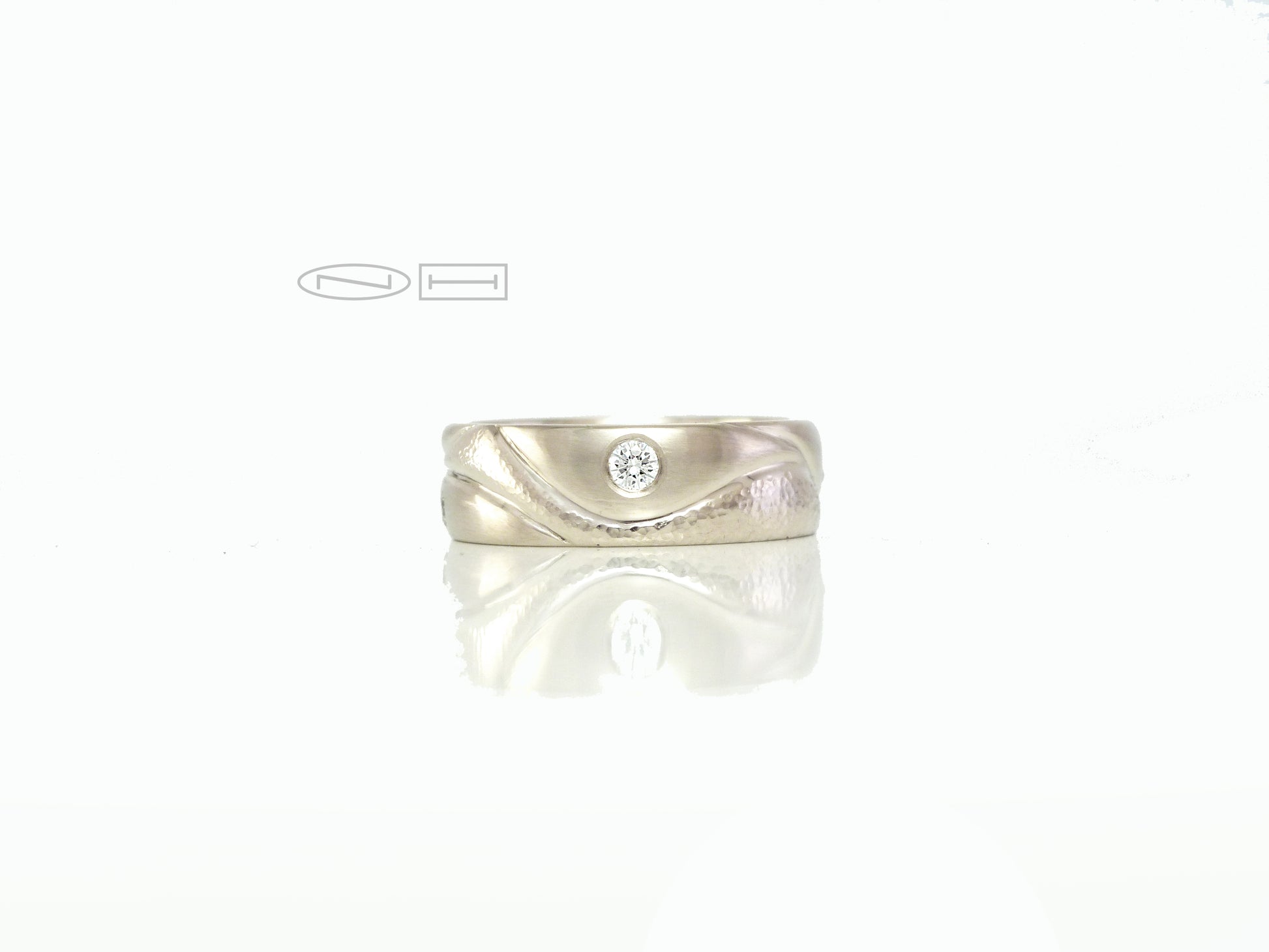Hills and valleys single stone, soft shaped band with flowing carved lines, and planish detailing, along with one gypsy set diamonds.