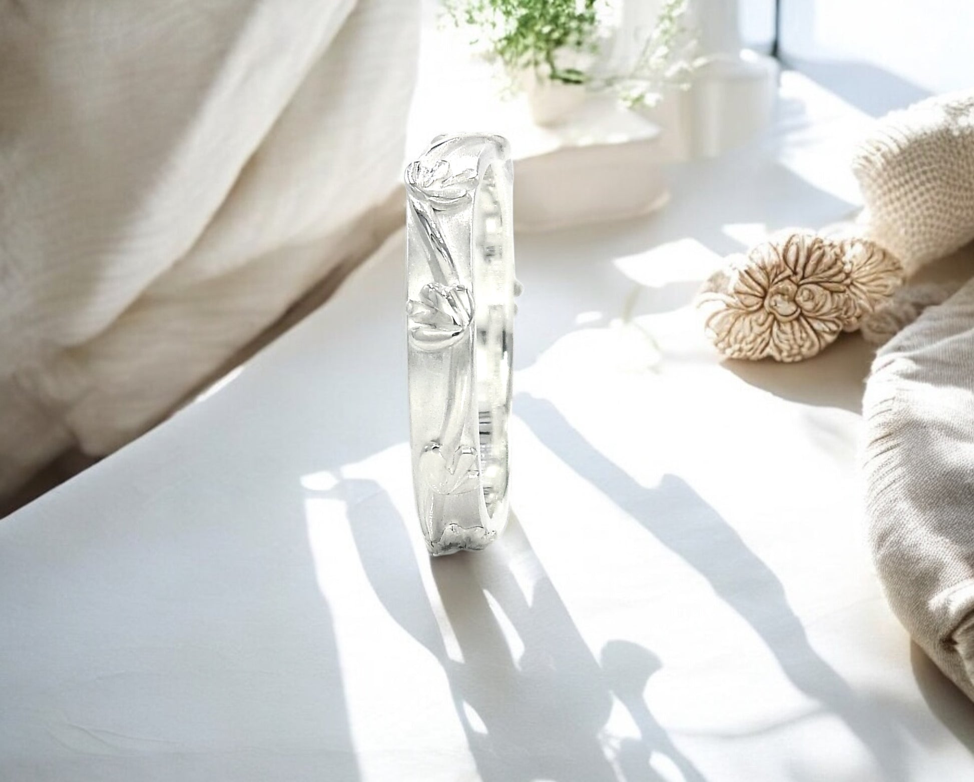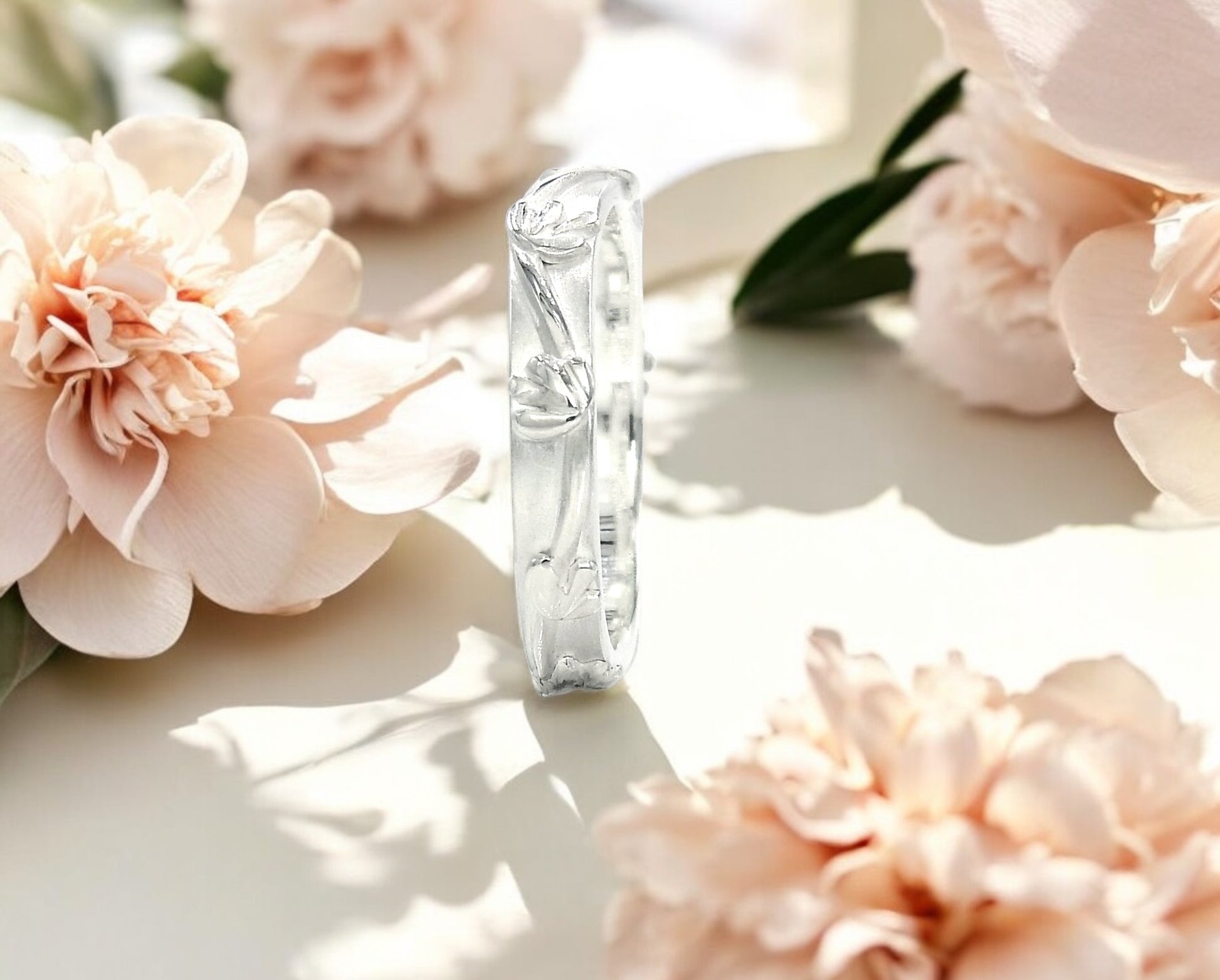 3mm band with hand cut blossoms scattered along a raised polished vine, accentuated with a matte finish background.