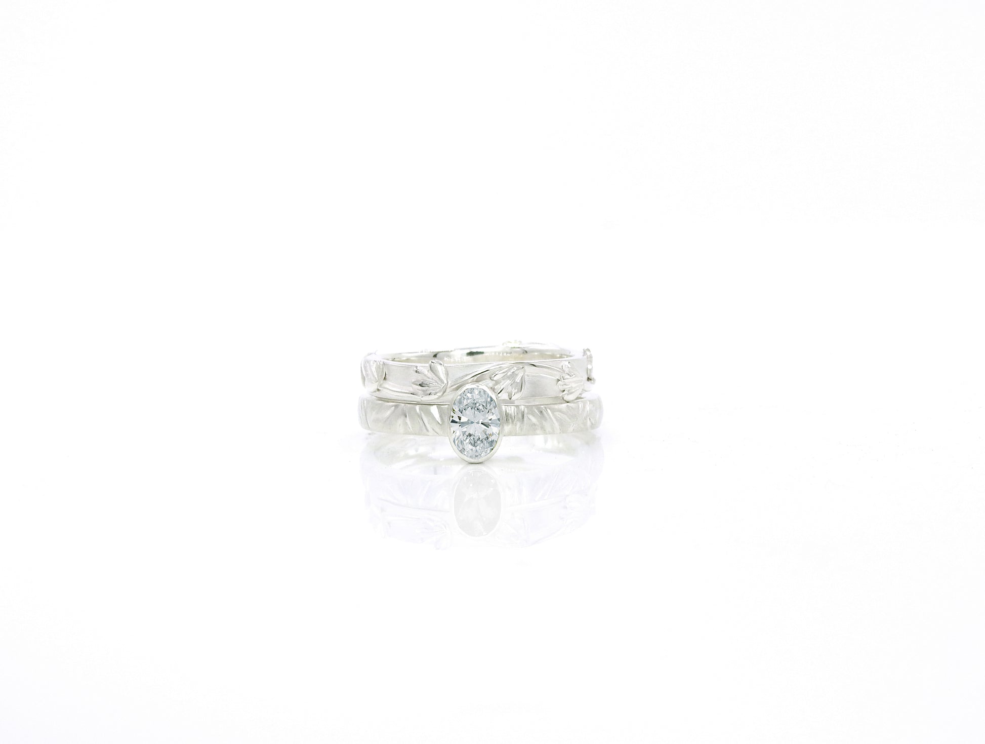 Inspired by nature into the woods band with oval bezel set diamond. Showing with from the garden, eden wedding band.