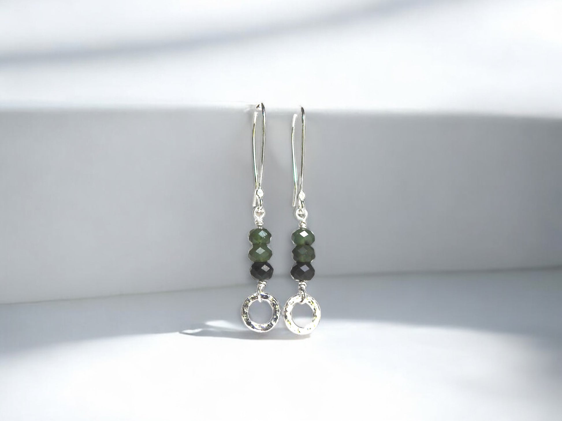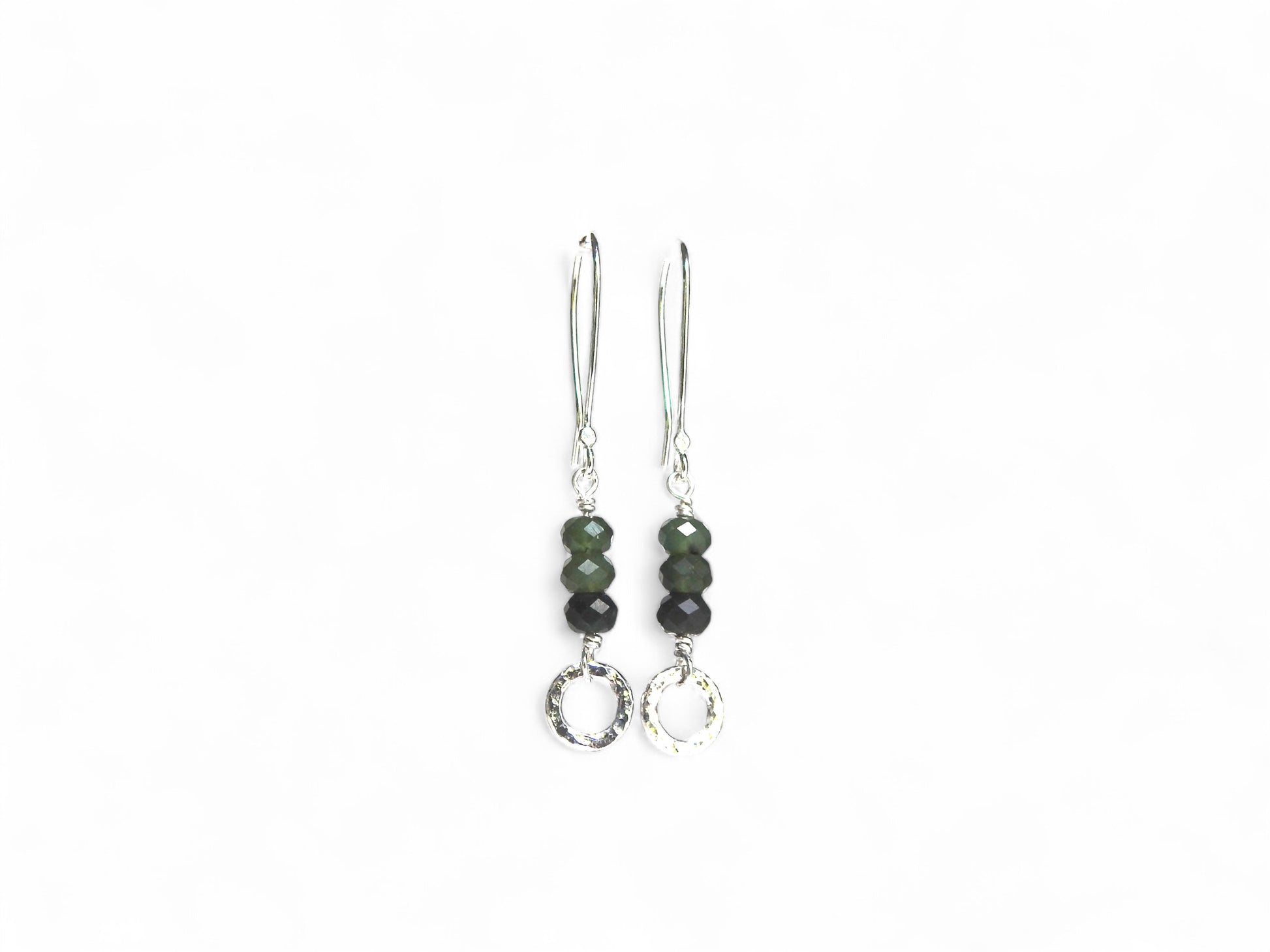 Simple everyday dangle earrings with a little planish sparkle and some lush green jade facetted beads.