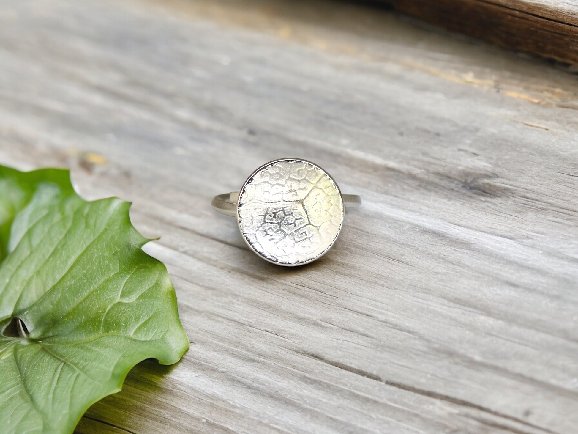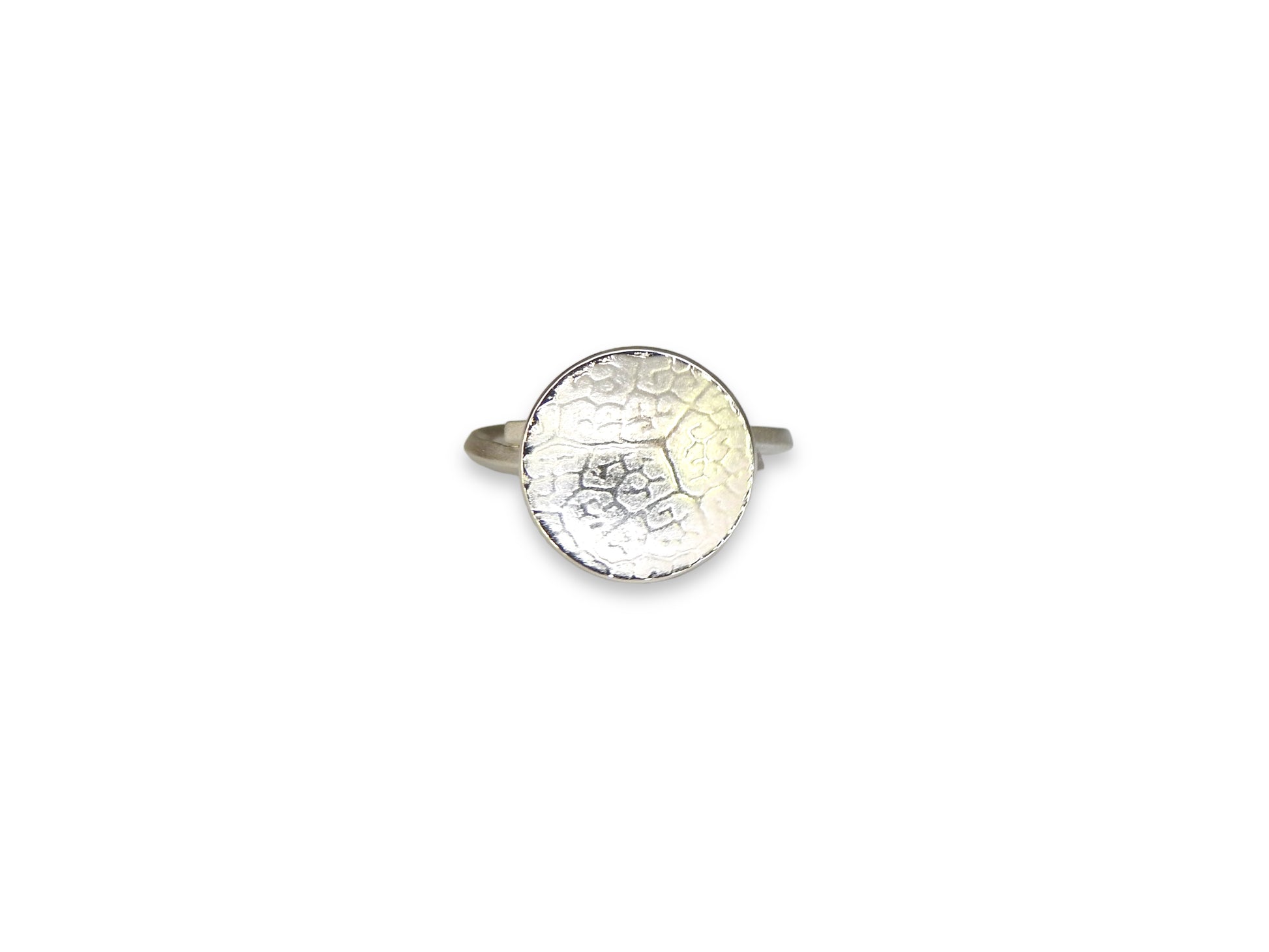 Concave roller printed circle bringing together a thin spiral ring representing the Oneing of life. Each ring is uniquely handmade and roller printing will vary. Image shown is what they will look like. Each ring comes with a mandala card and the reflection behind this simple everyday ring.