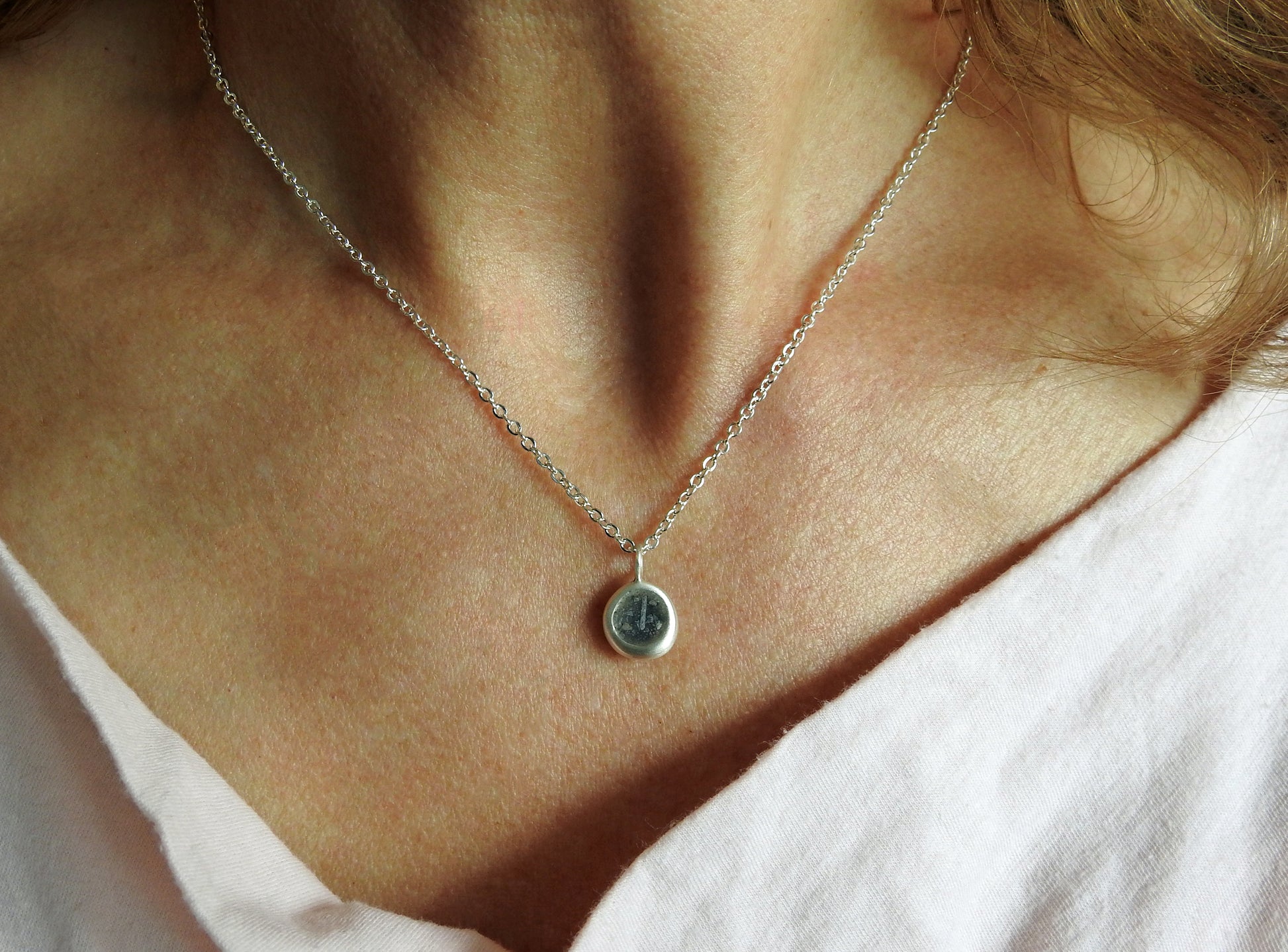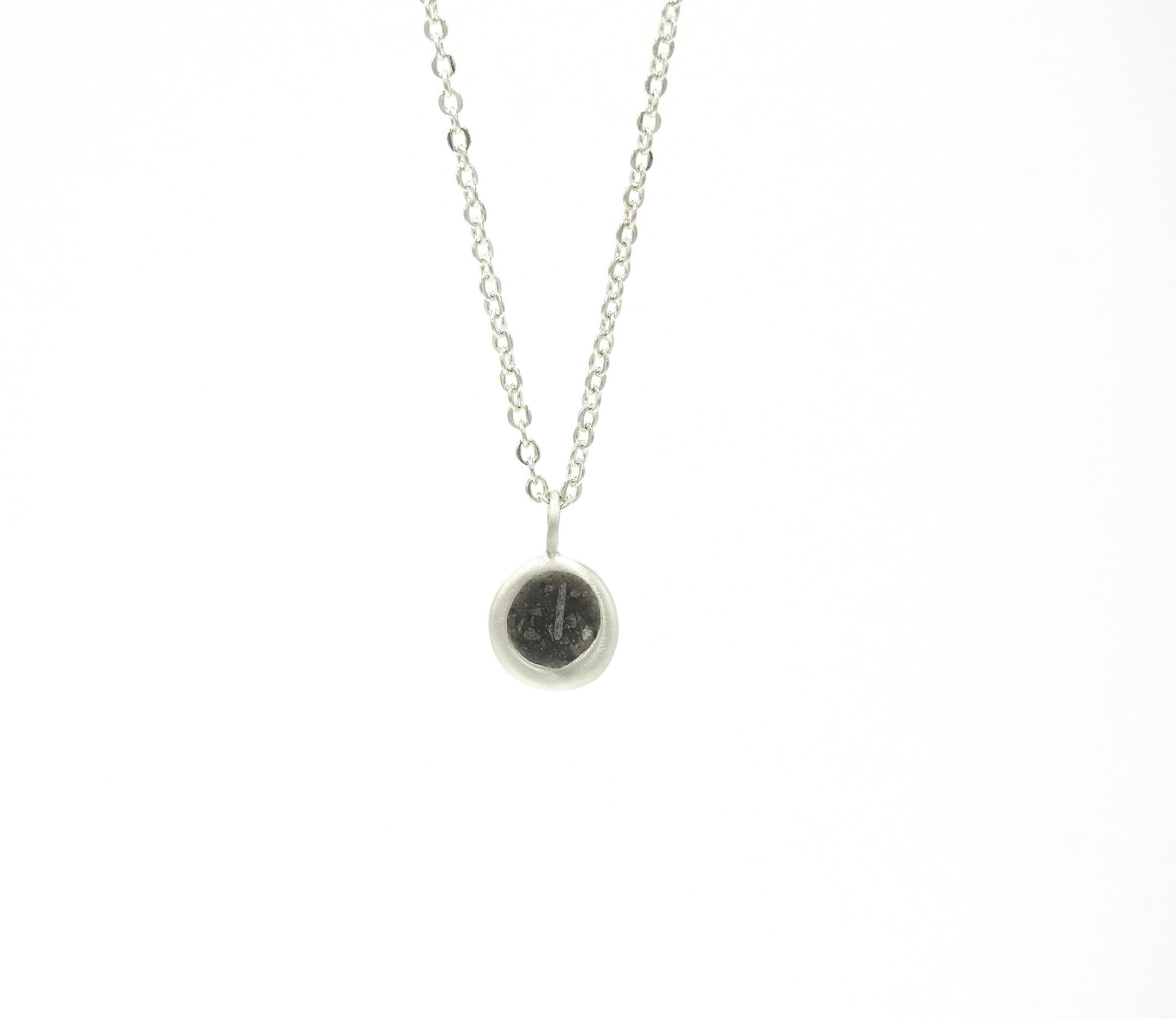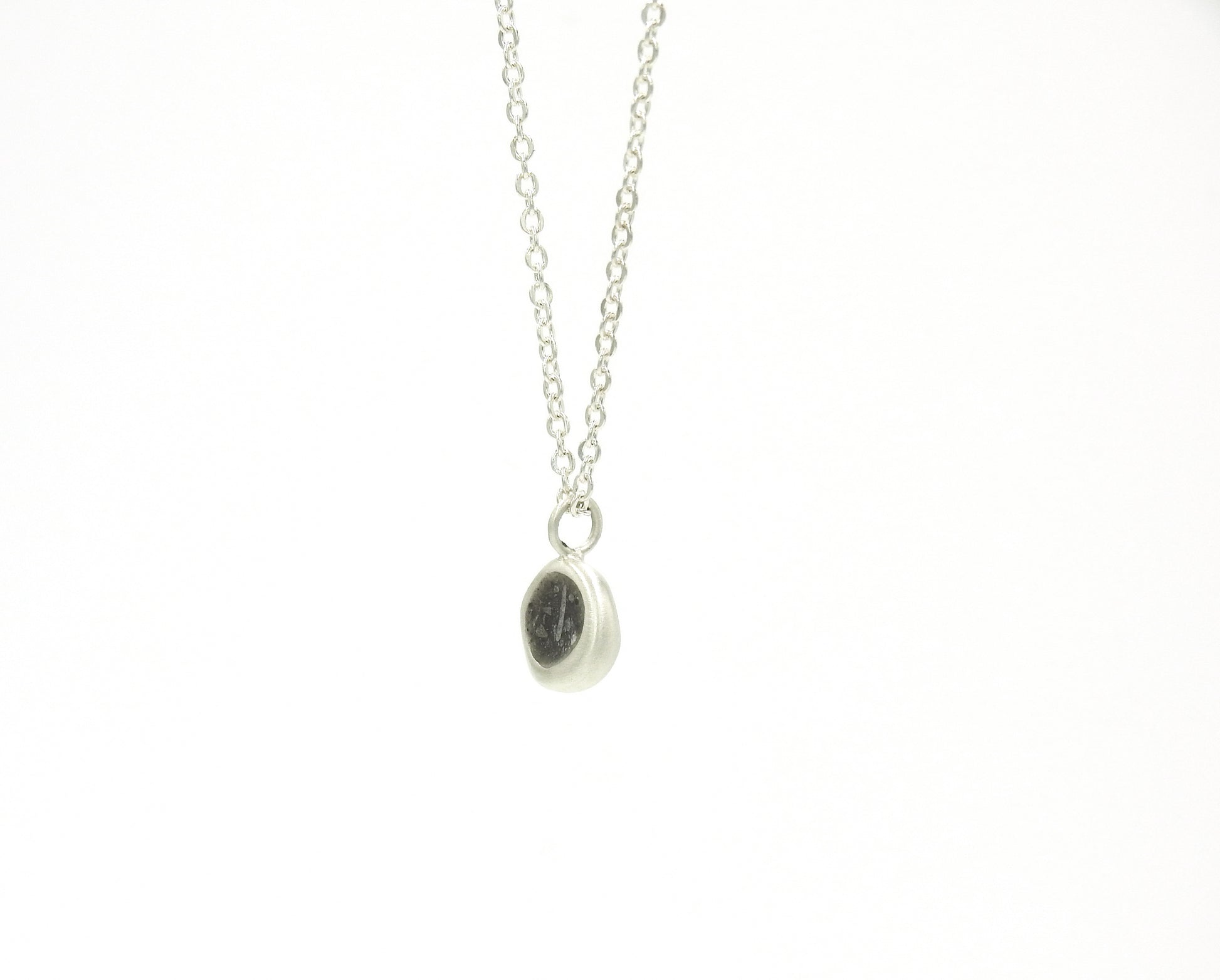 Sterling silver organic large pebble with limestone inlay on 16" cable chain with matte finish.