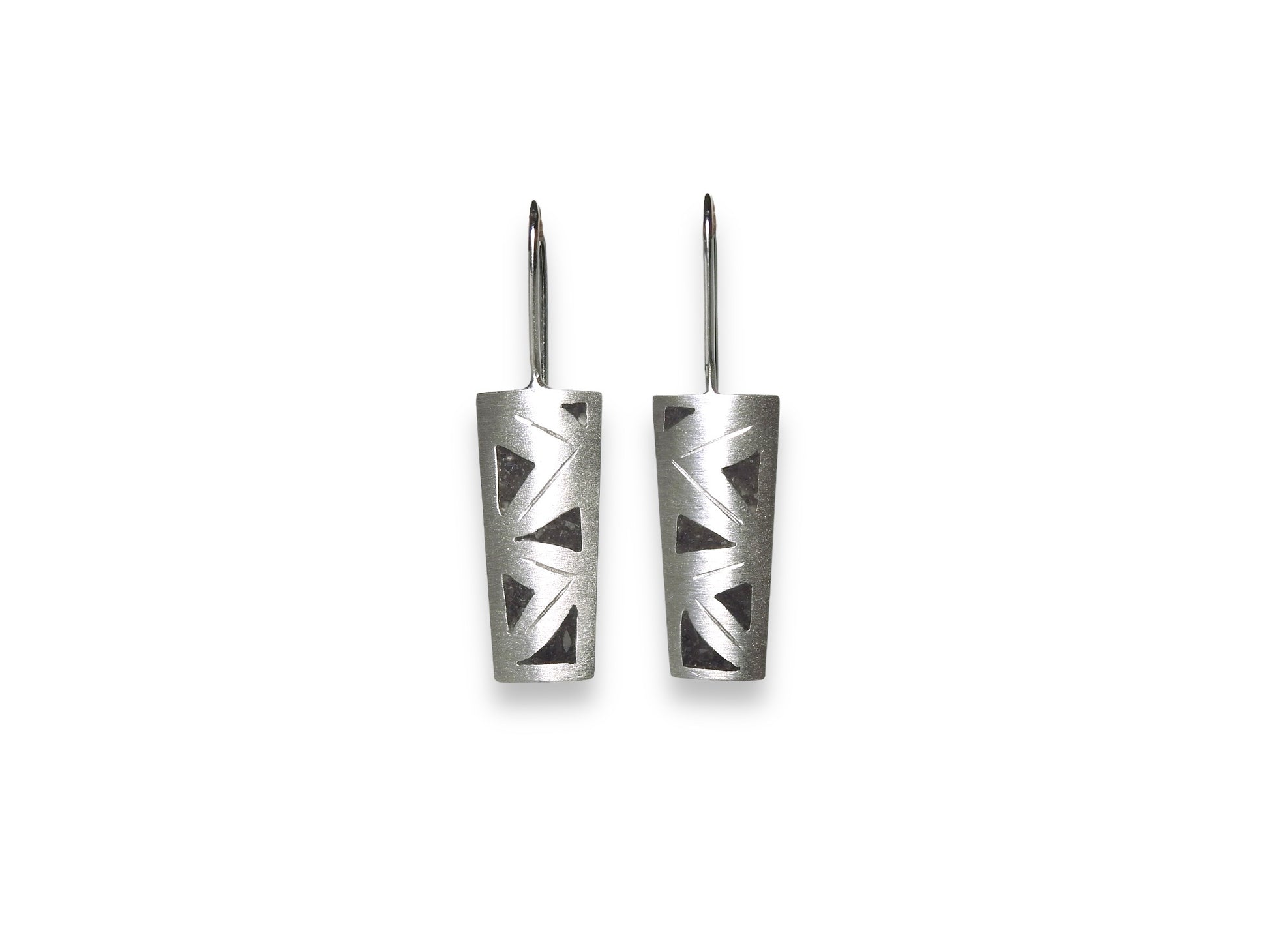 Growing in Kingston, limestone leaf pattern inlay ~ Sterling silver tapered rectangle earrings with pierced out leaf pattern and limestone inlay background. Playing on the positive/negative focus, open to see.