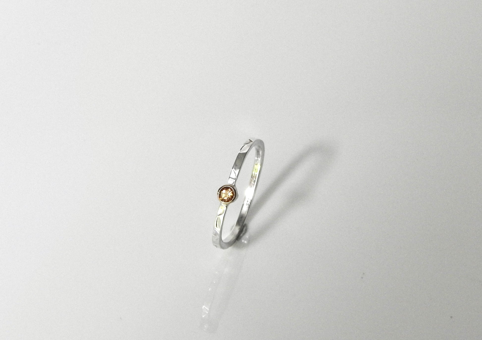 1.6mm hand stamped leaf pattern band with 14kt yellow gold bezelled 3mm round facetted citrine.