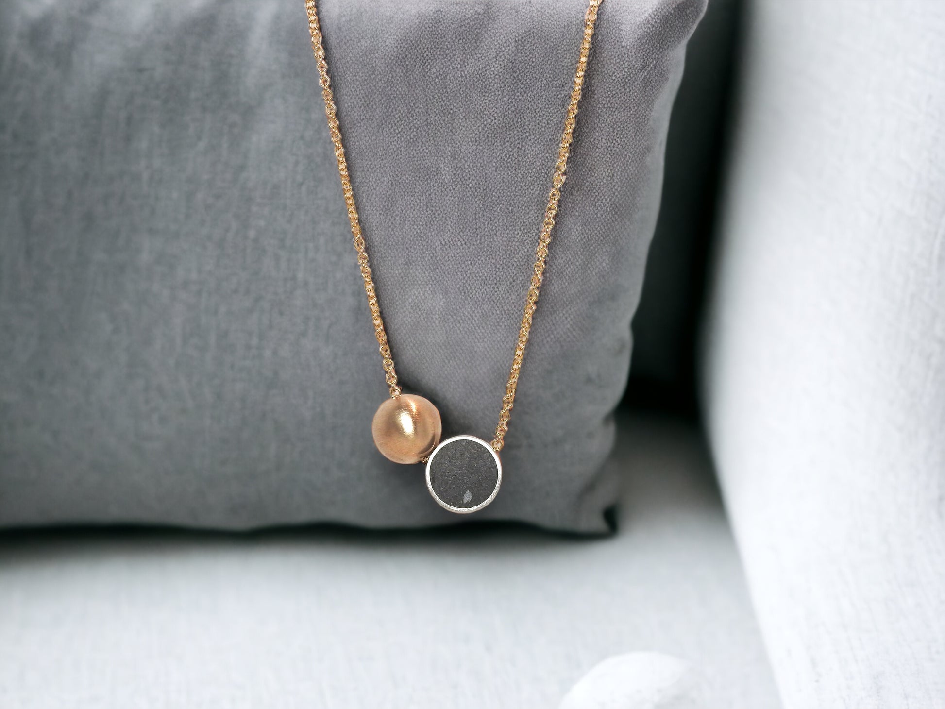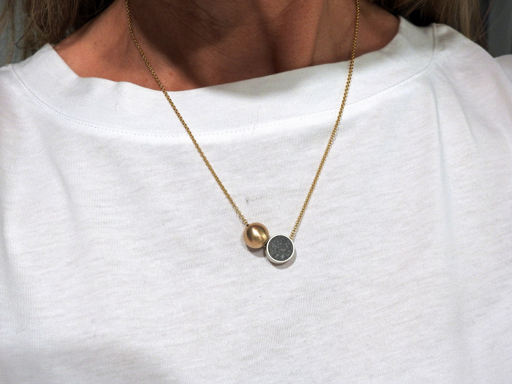 11 mm sterling silver limestone inlay floater with 10mm 14kt yellow gold ball, on a 18" 10kt yellow gold solid cable chain.
