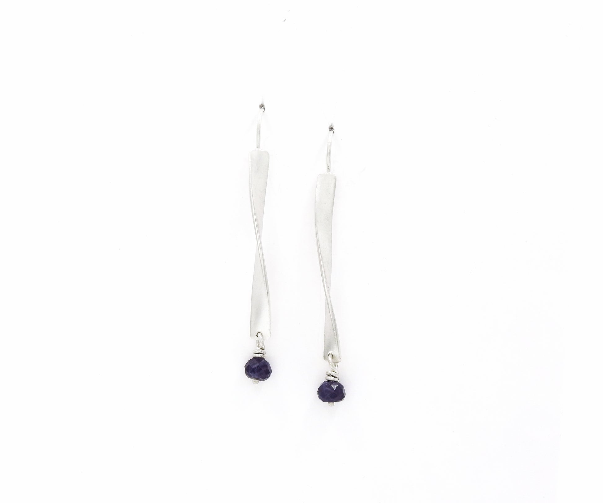 Sterling silver long twist earring with denim blue coloured Sapphire, faceted 4x6mm rondelle shape beads.