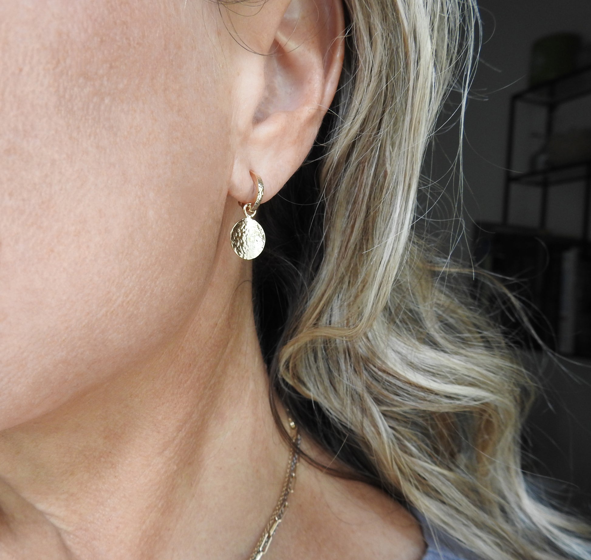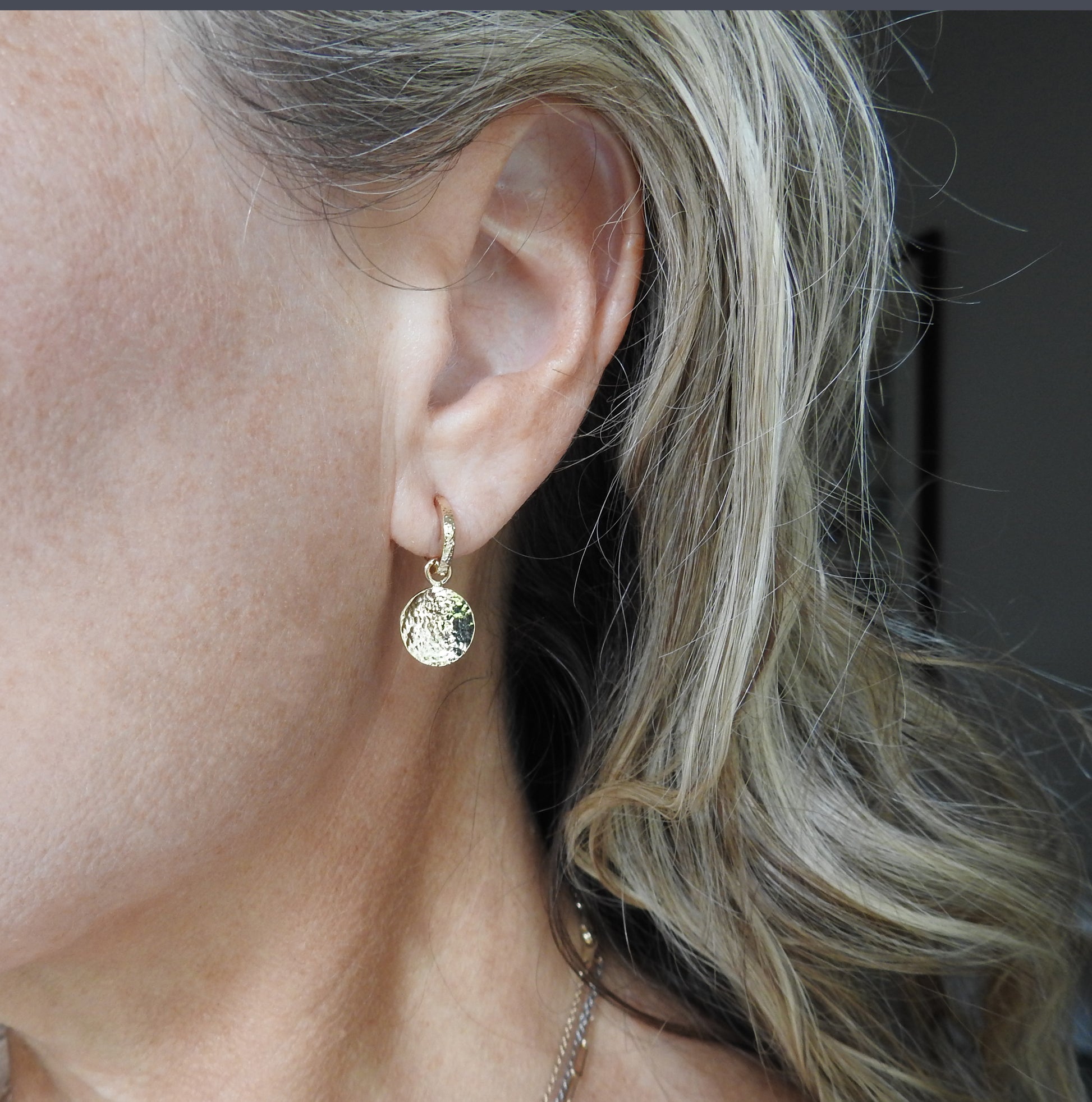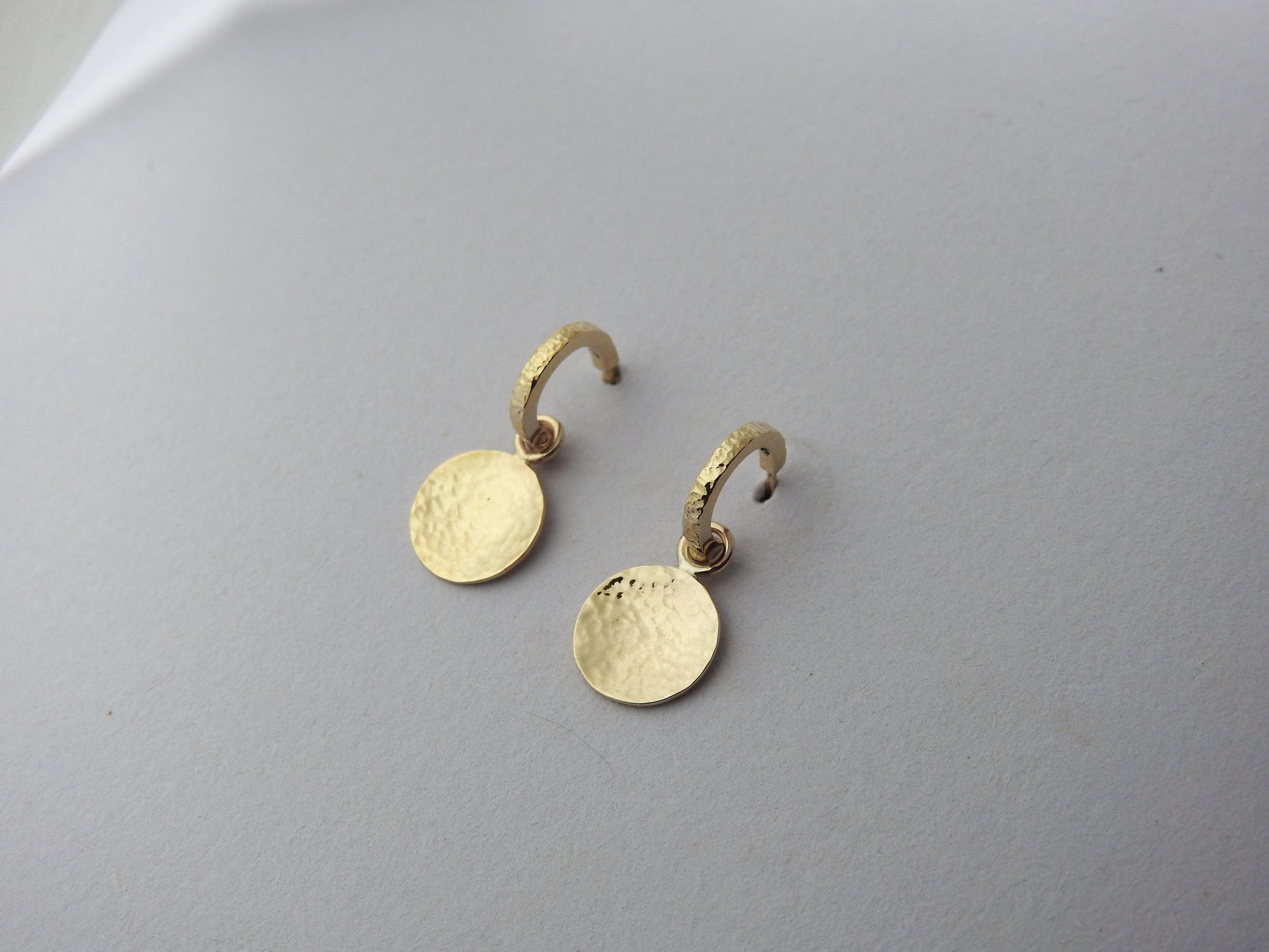 B E micro hoops 14kt yellow gold 1.5 mm square wire, approximate 9mm diameter available in matte, planish, or polish finish with high polish ball end to hold on your favourite dangle. Wear alone or with an added dangle, additional added dangles shown for purchase.