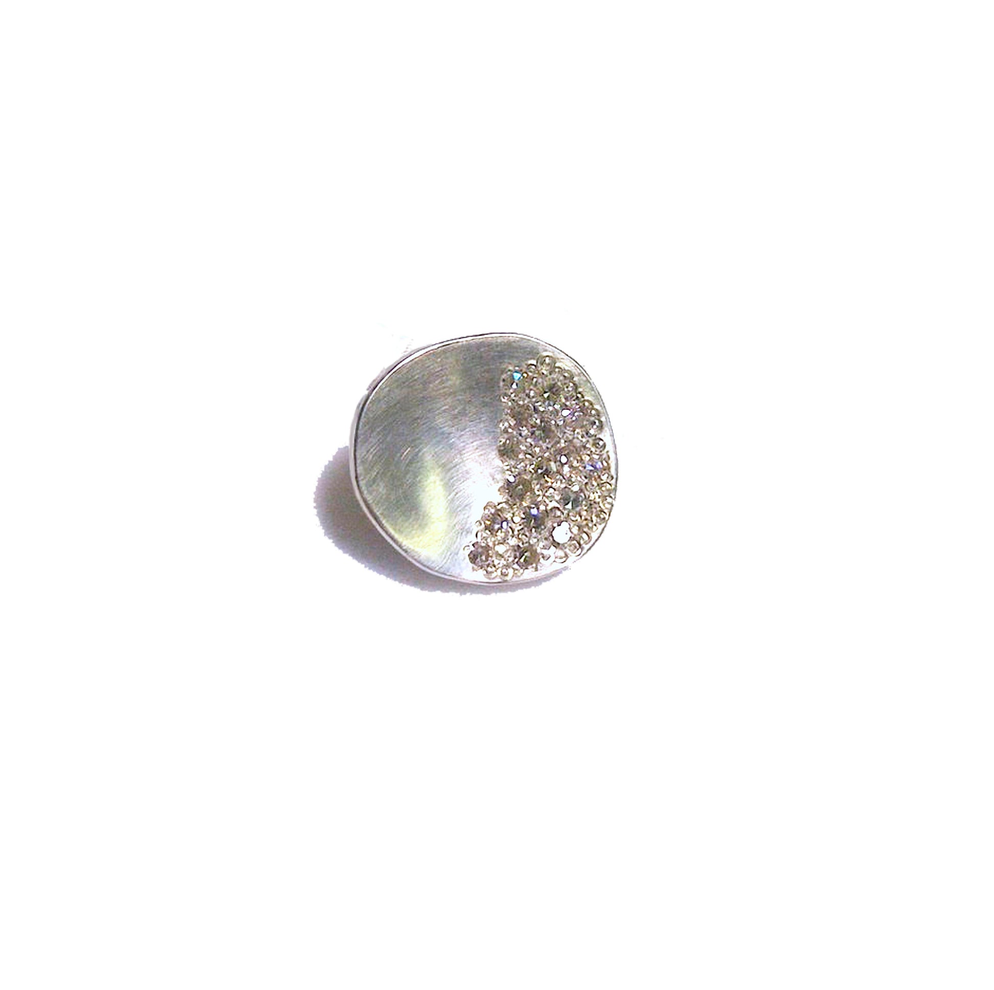 Approximately 20mm organic disc with 13 small diamonds bead set within a beaded sparkle section.