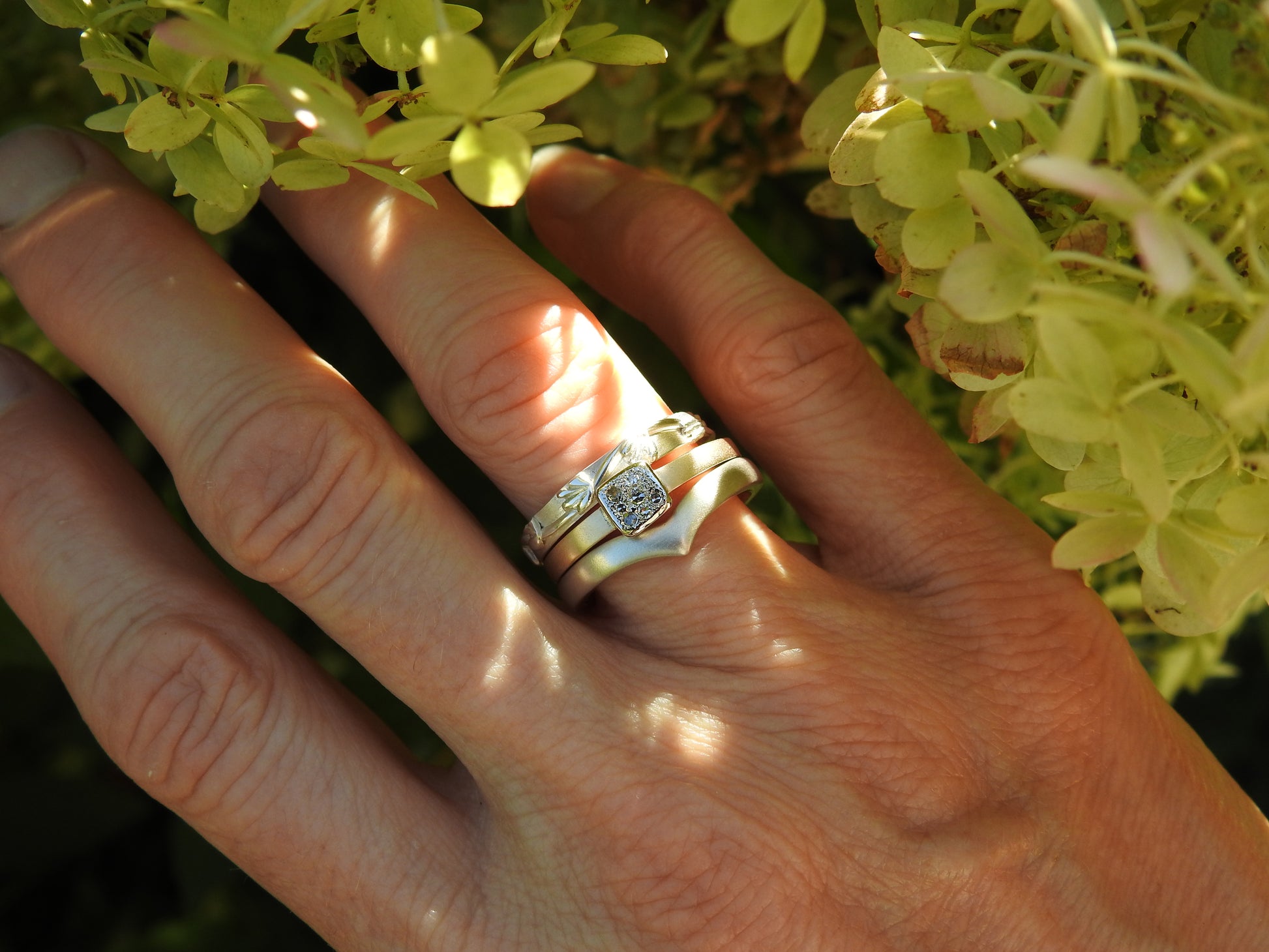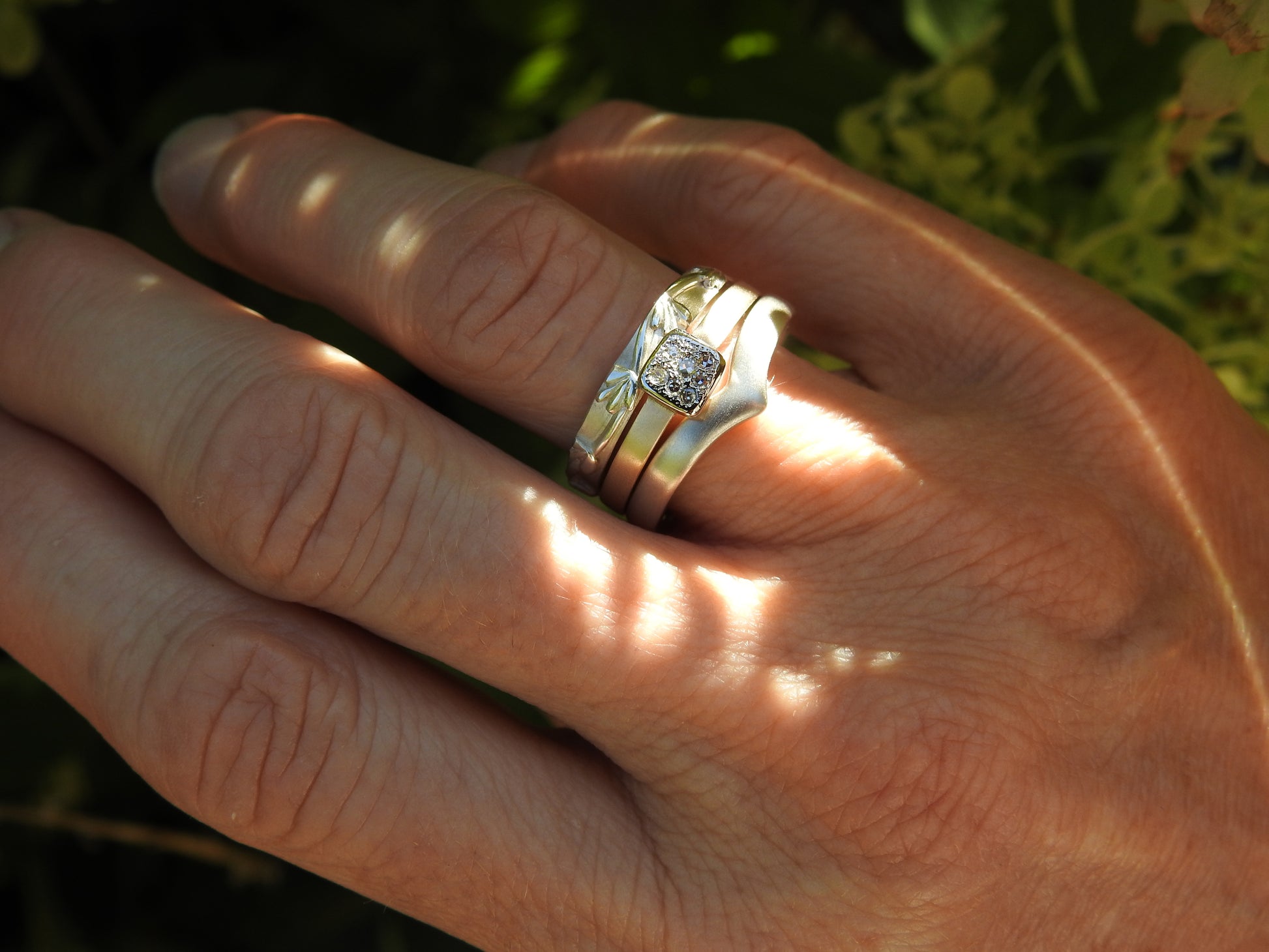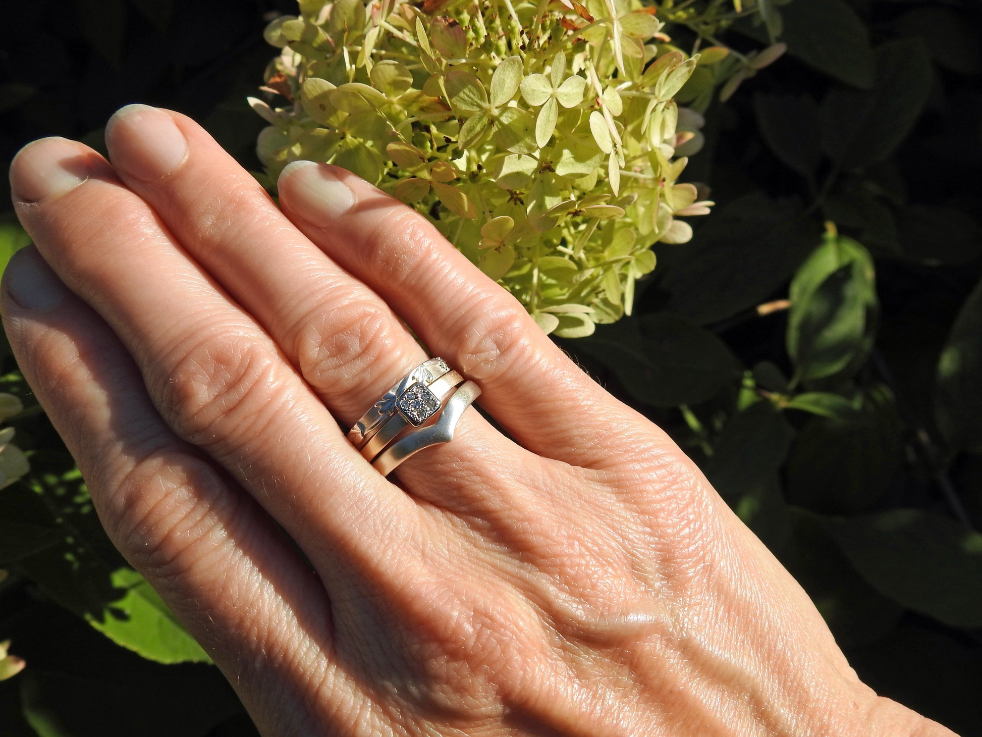Two tone organic square cluster diamond stacker ring with a 14kt yellow gold band and 14kt white gold organic square with 7 small diamonds varying in size.
