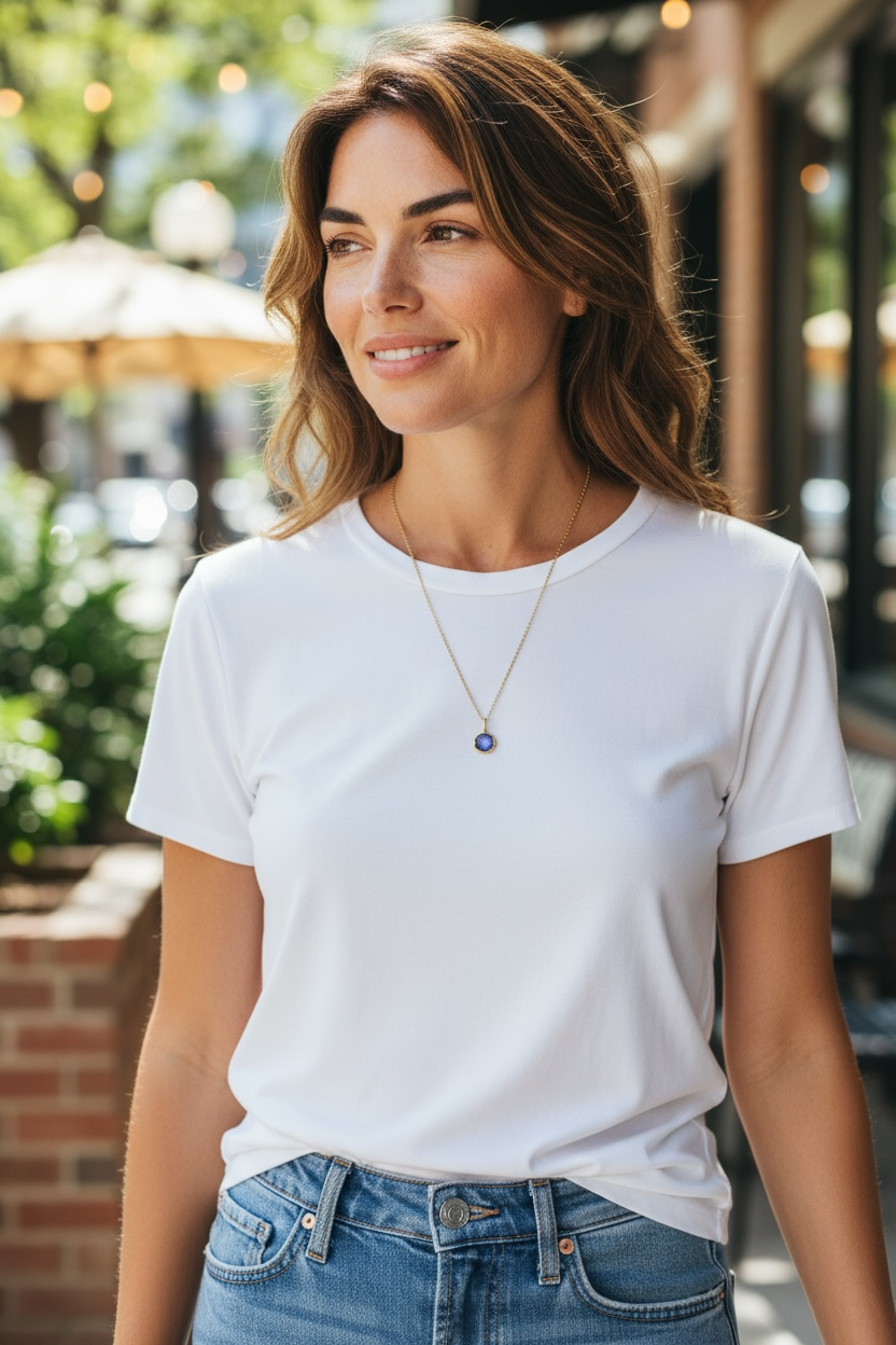 Framed and four point set bezel small oval cabochon. Available on 18", 20"or 24" 14kt yellow gold cable chain.