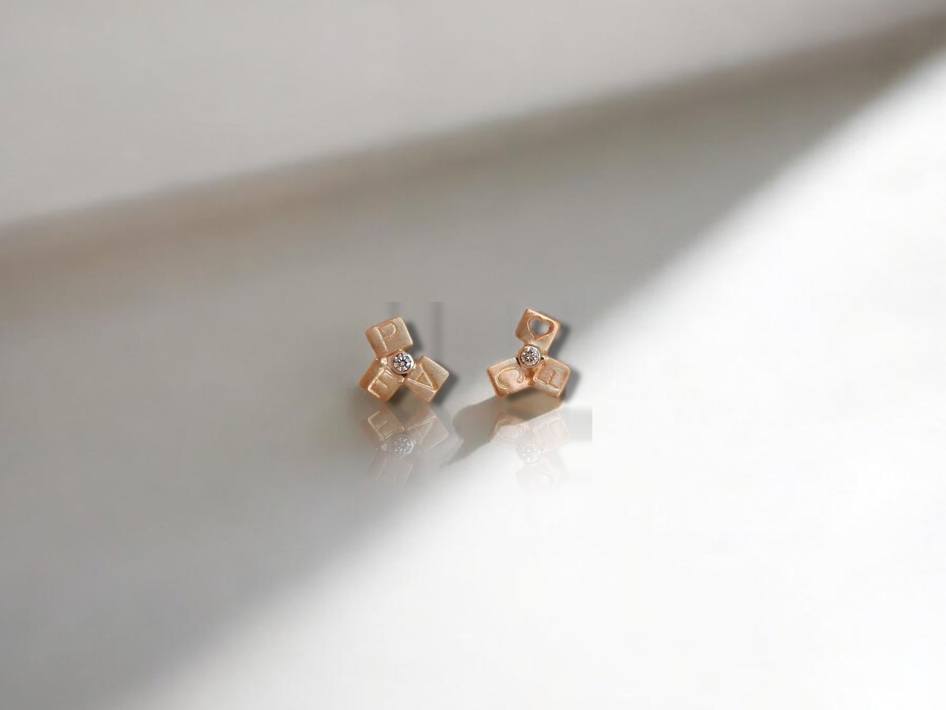 Gold PEACE studs hand stamped, and one pierced out heart, with bezel set CANADAMARK diamonds, heavy post, silicon backings for secure comfort, and wearability.