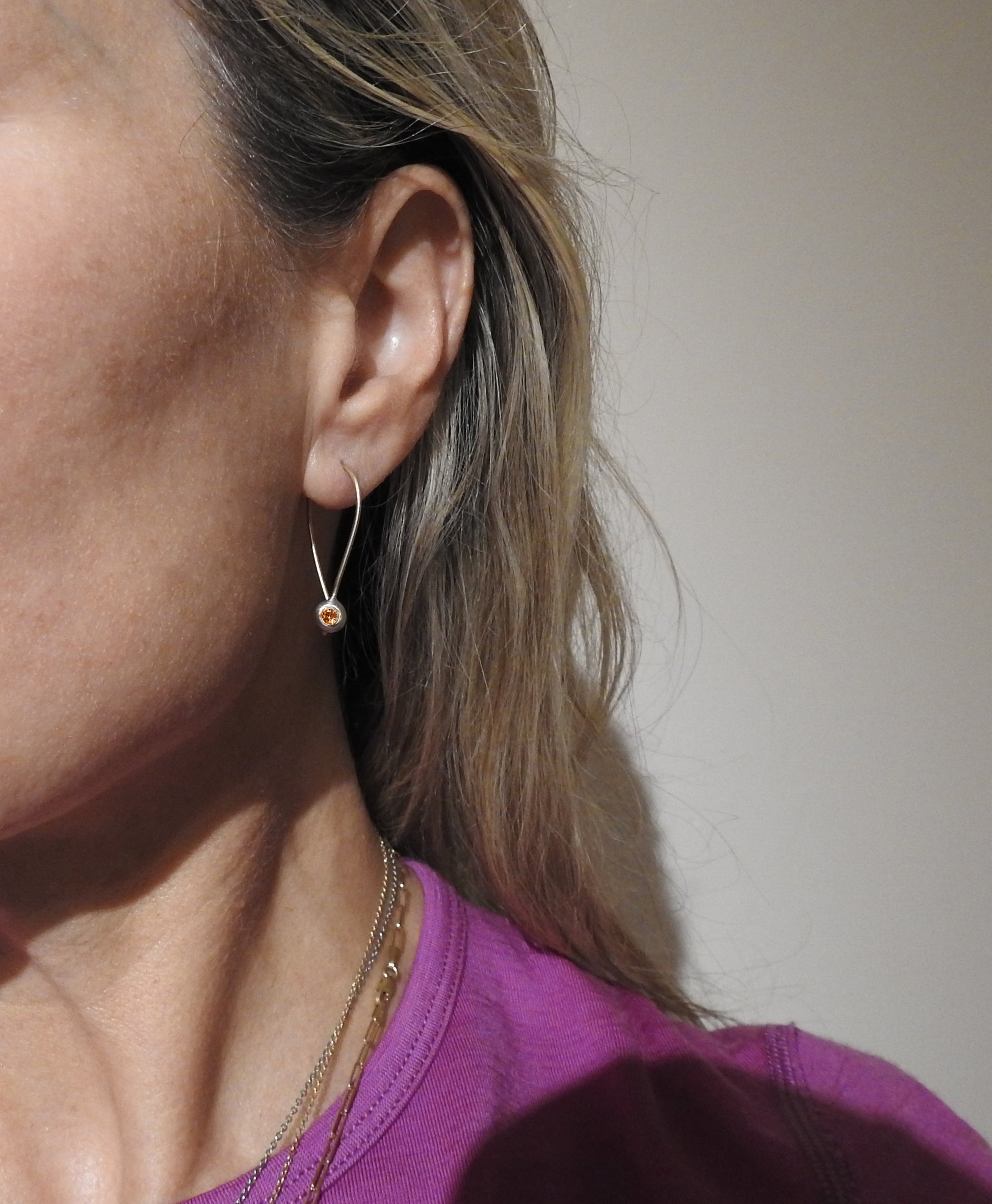 Two-tone pebble hoops: white gold pebbles, yellow gold bezels, and 14kt yellow gold ZEALmetal hoop style wires with closure, and brilliant glowing orange sapphires. These beautiful brilliant orange sapphires have become a hard gem to come by especially in the smaller sizes, but I was able to source them out lab-grown. Sapphires come in a full range of colours and most colours can be purchased in different sizes naturally and alternatively lab-grown are also an available choice.