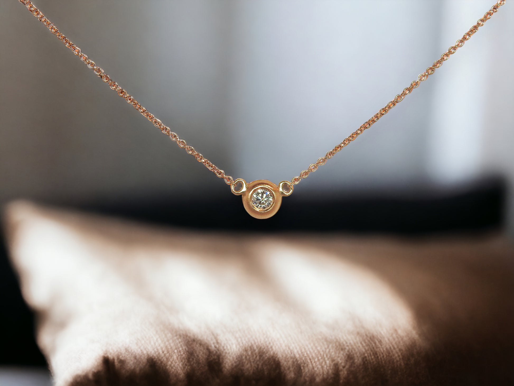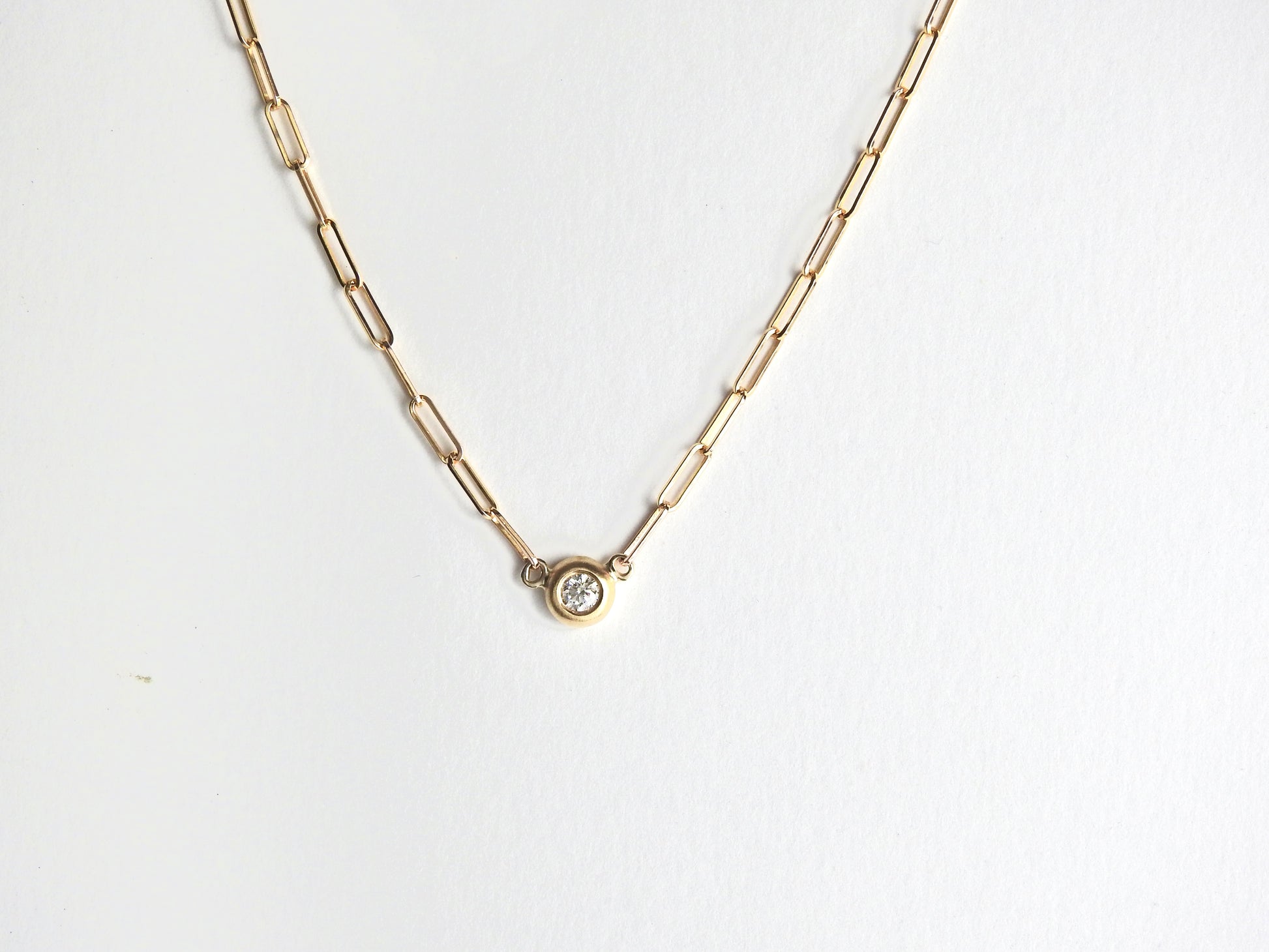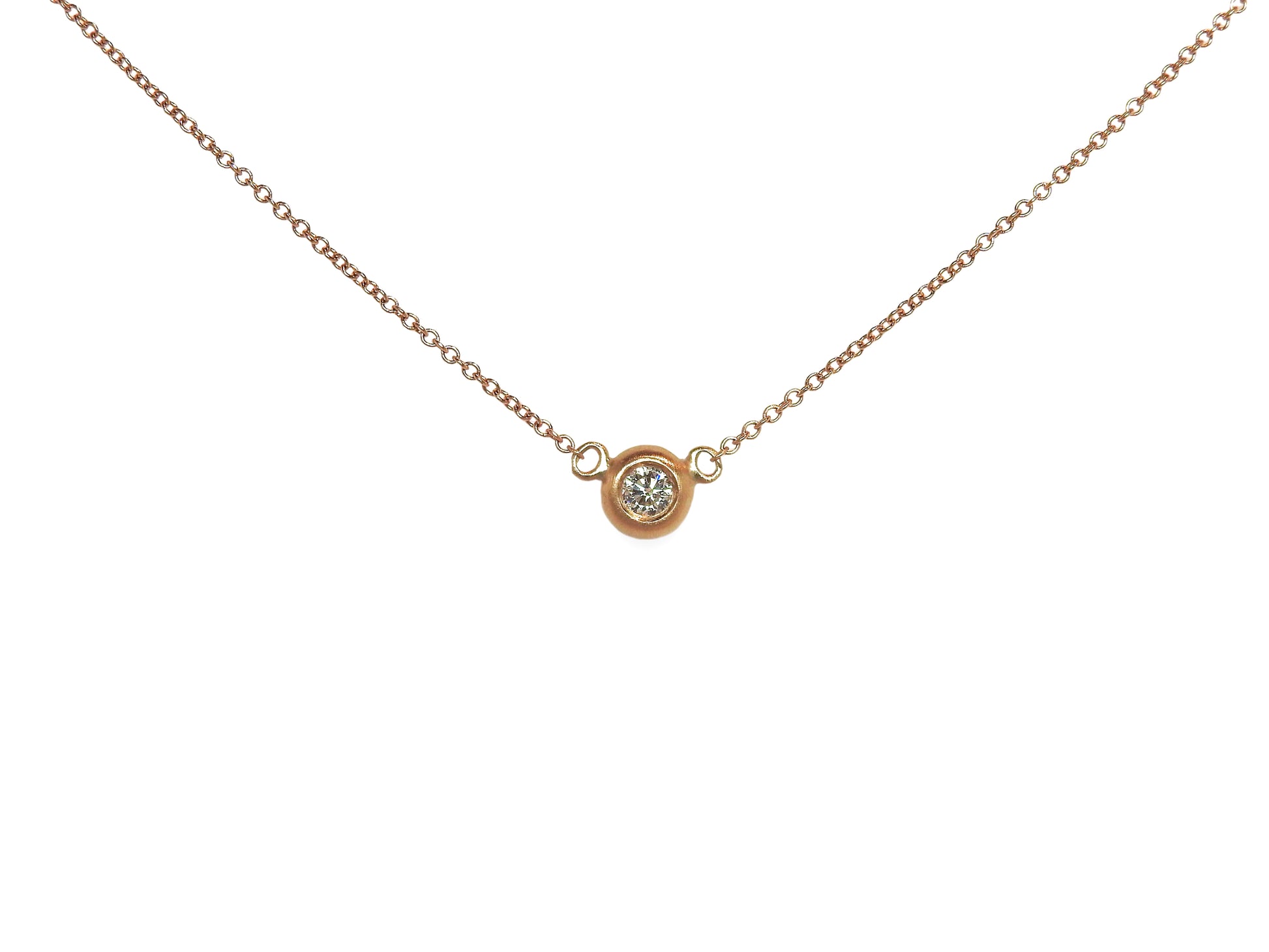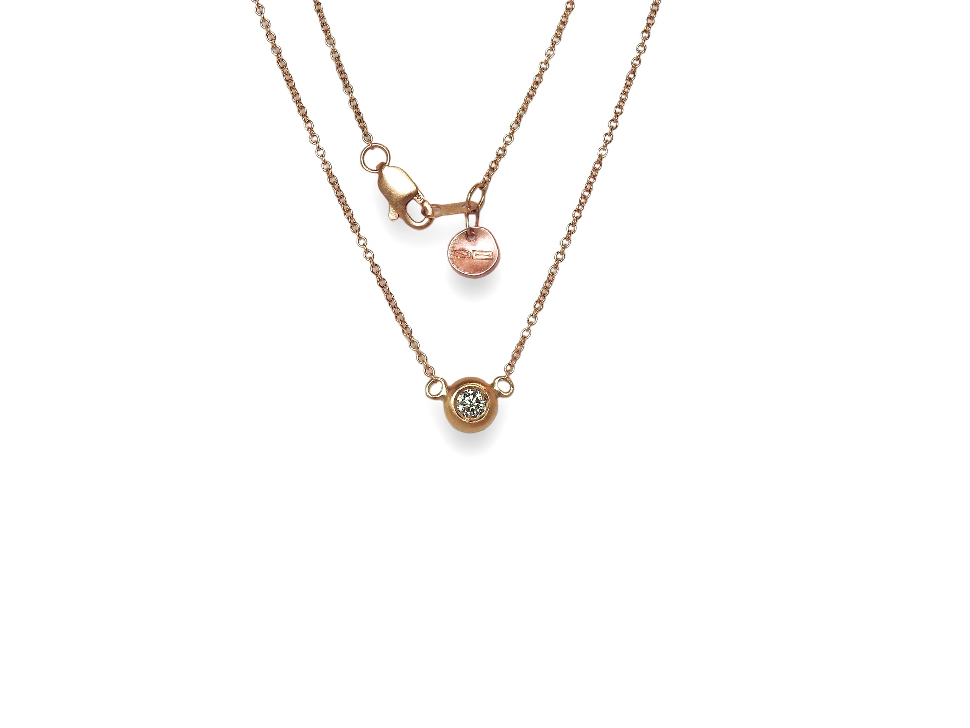 Organic pebble pendant with .15pter diamond, on 14kty 16" cable chain, with organic disc red gold trademark tag.