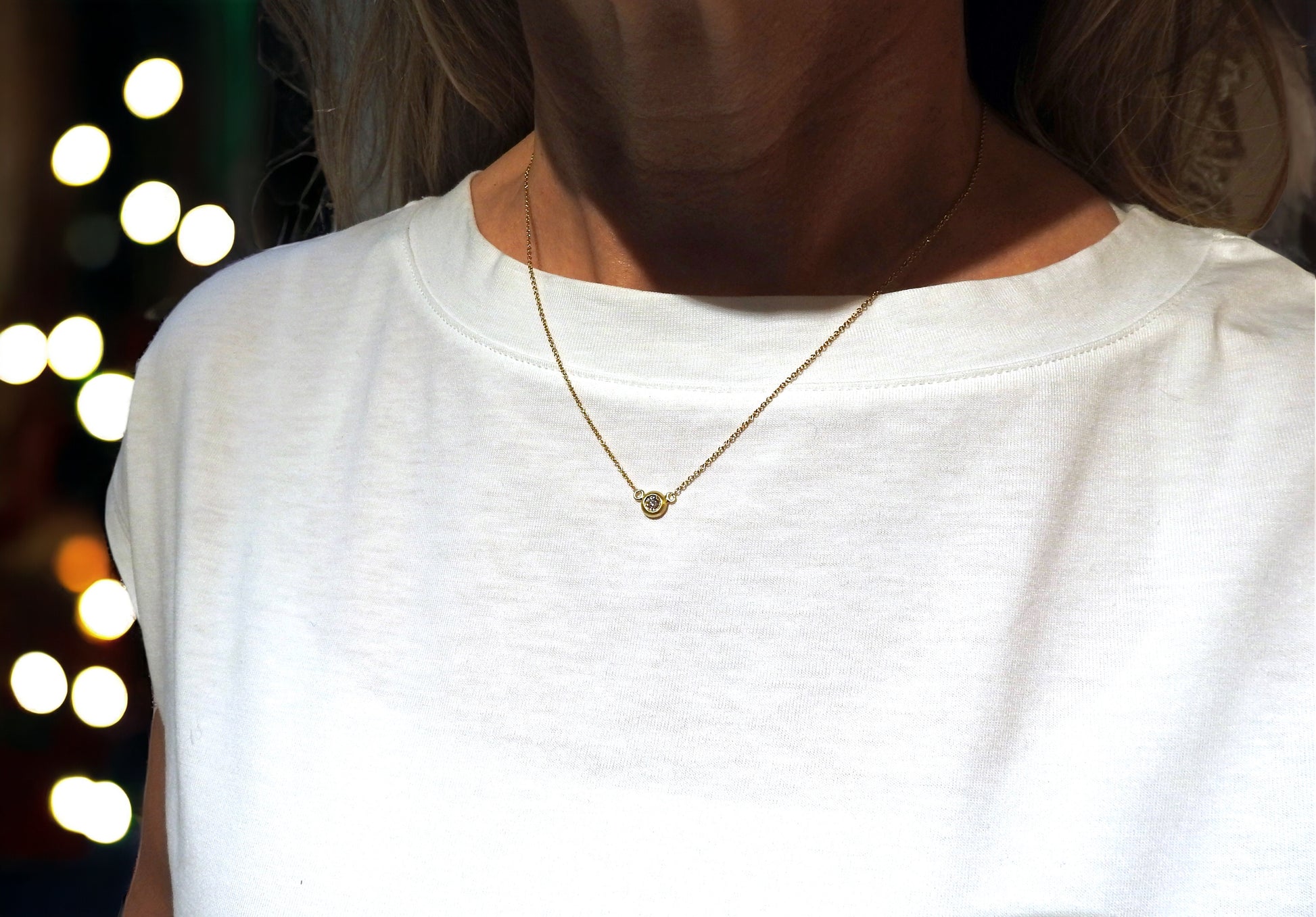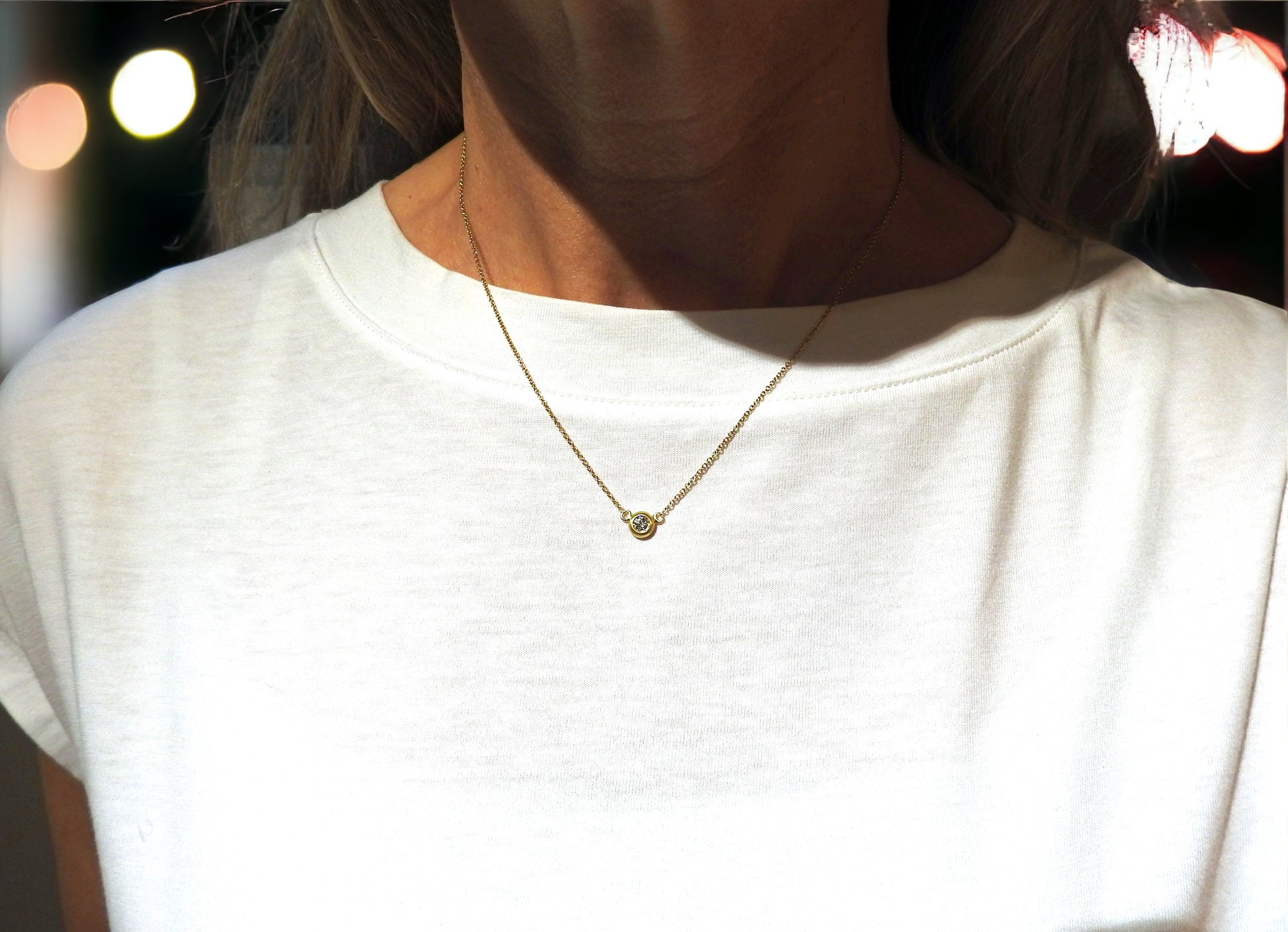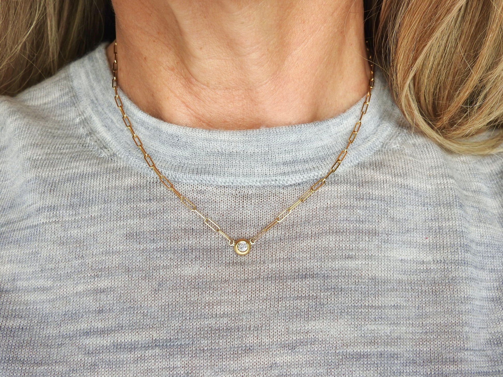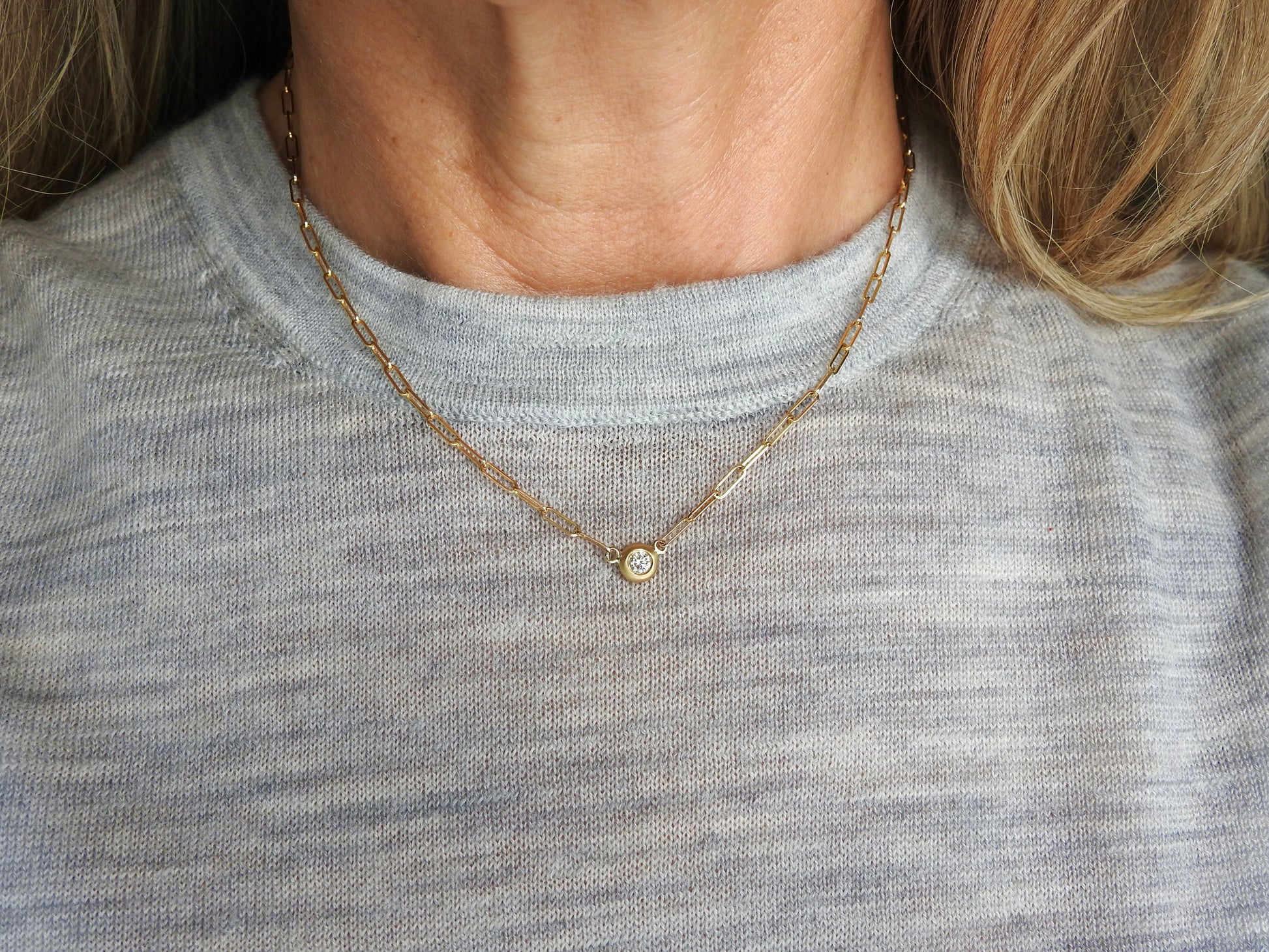Organic pebble pendant with .15pter diamond, on 14kty 16" cable chain, with organic disc red gold trademark tag.