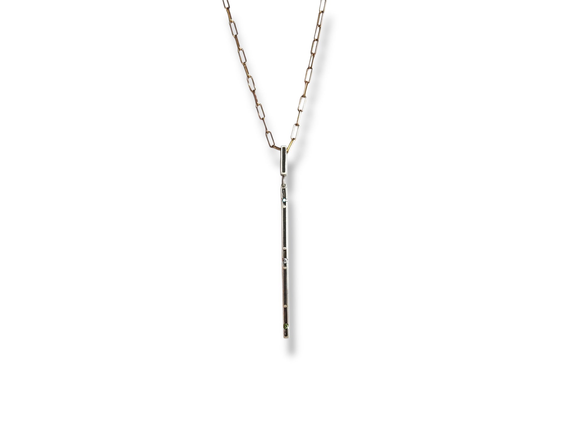 Pencil Limestone inlay with 3 diamonds - Sterlings silver dangle pendant with limestone inlay, 1x .3pt apple green diamond, 1x .3pt white diamond and 1x.2pt blue diamond. Dangling from a simple rectangle limestone inlay bail.
