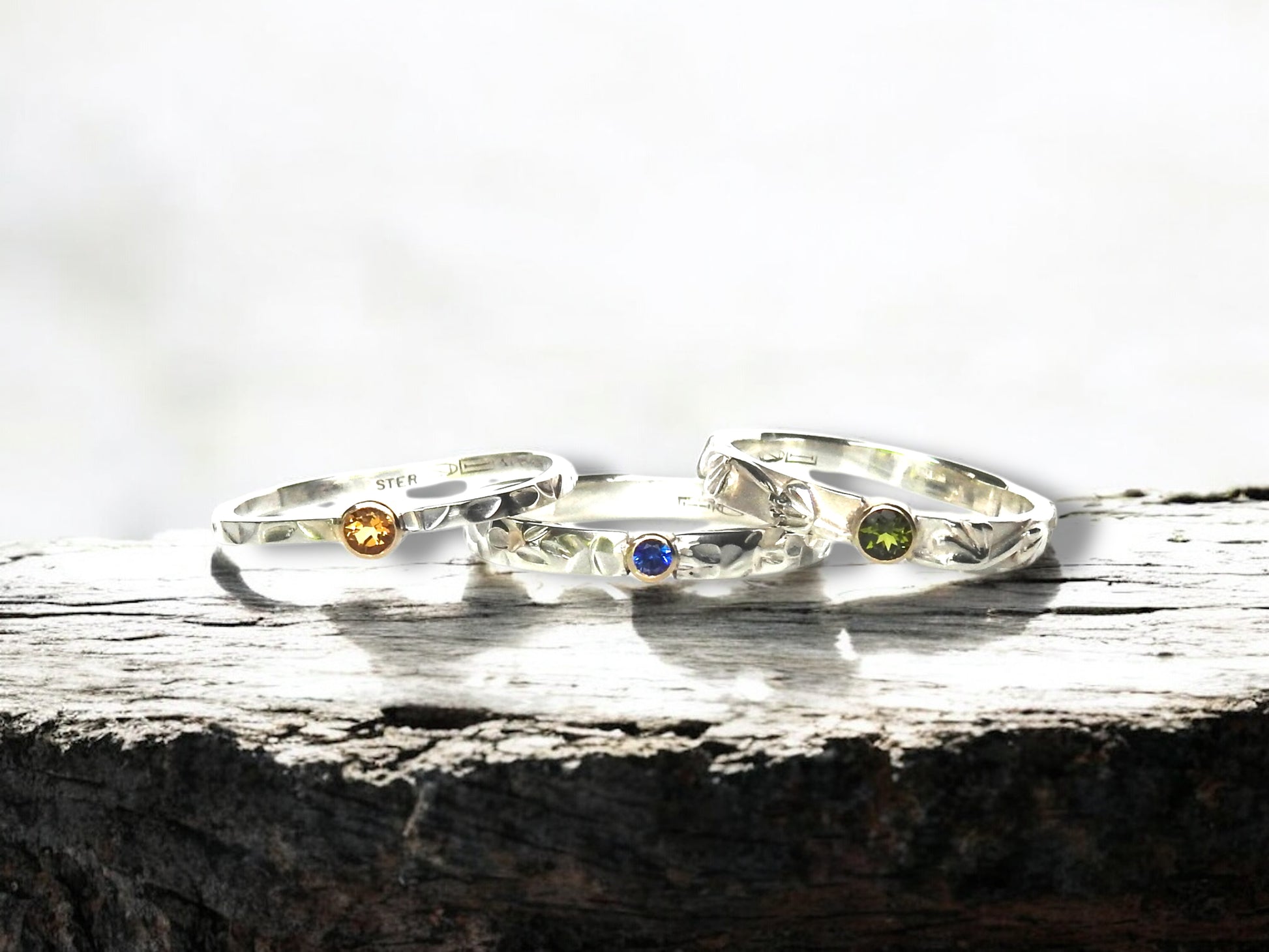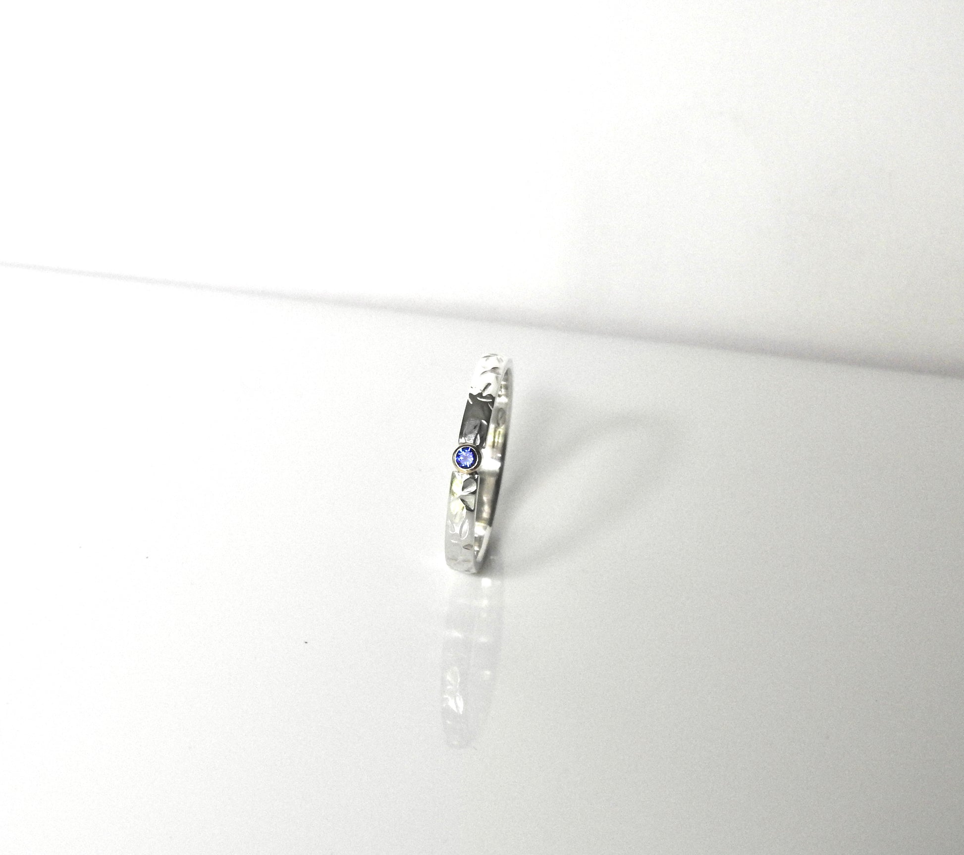 2mm uniquely hand stamped with petal/ butterfly wing pattern, 14kt yellow gold bezel and 2.25mm blue sapphire.