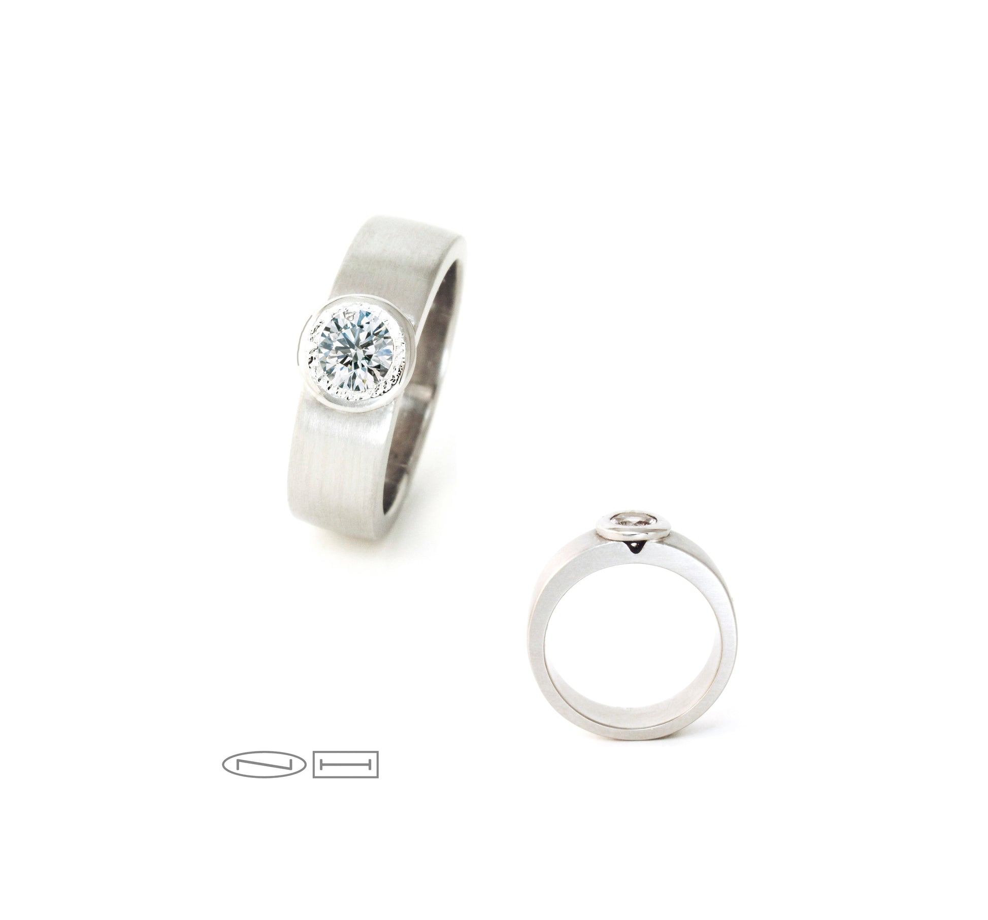 Simple classic planish bezel diamond ring on wide squared matte band.