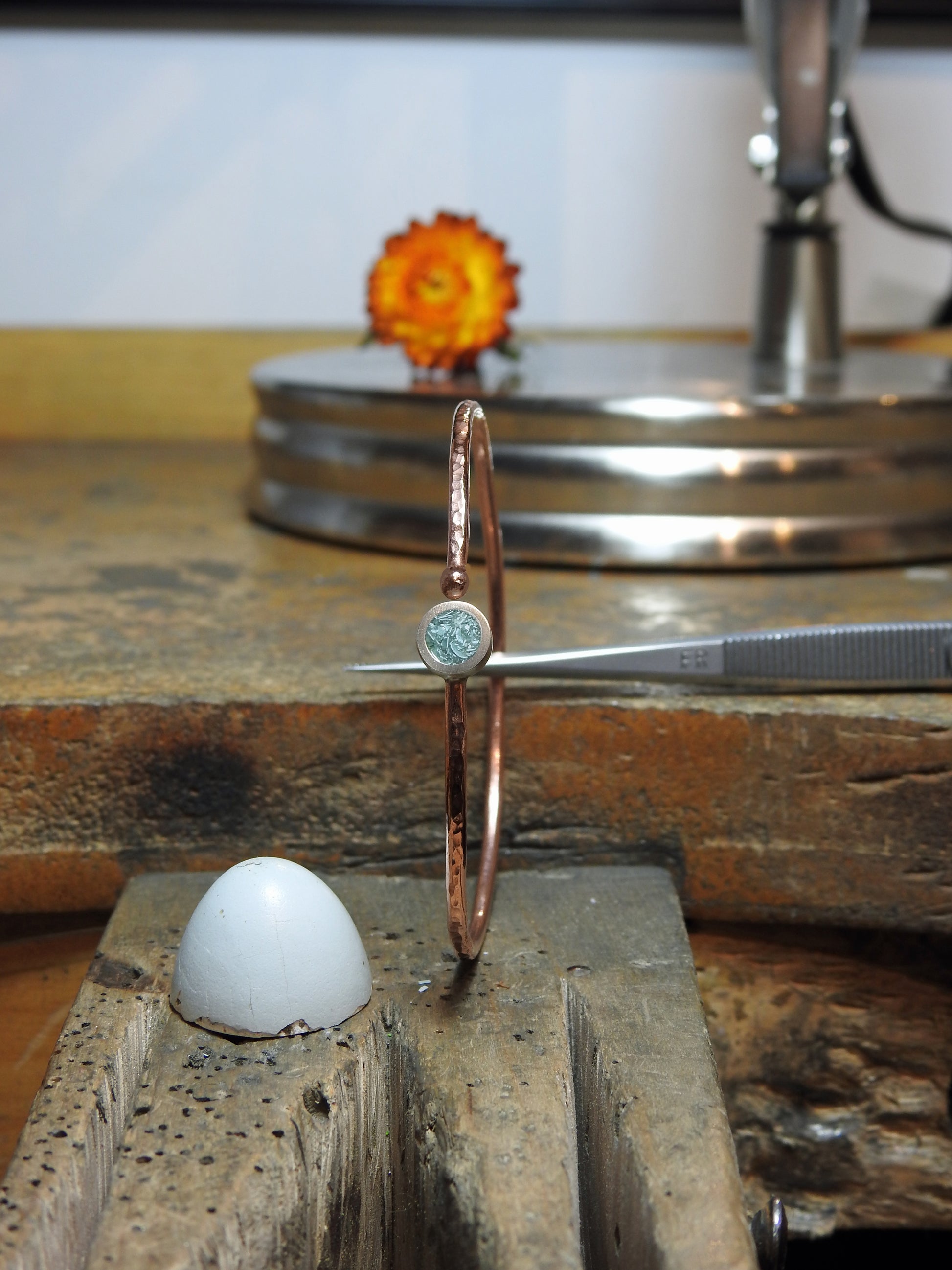 A little spring .... planished copper bangle with sterling silver bezel inlayed with robin’s eggshell. 7.5mm round silver frame with robin's eggshell inlay on a 2mm round copper planished bangle.