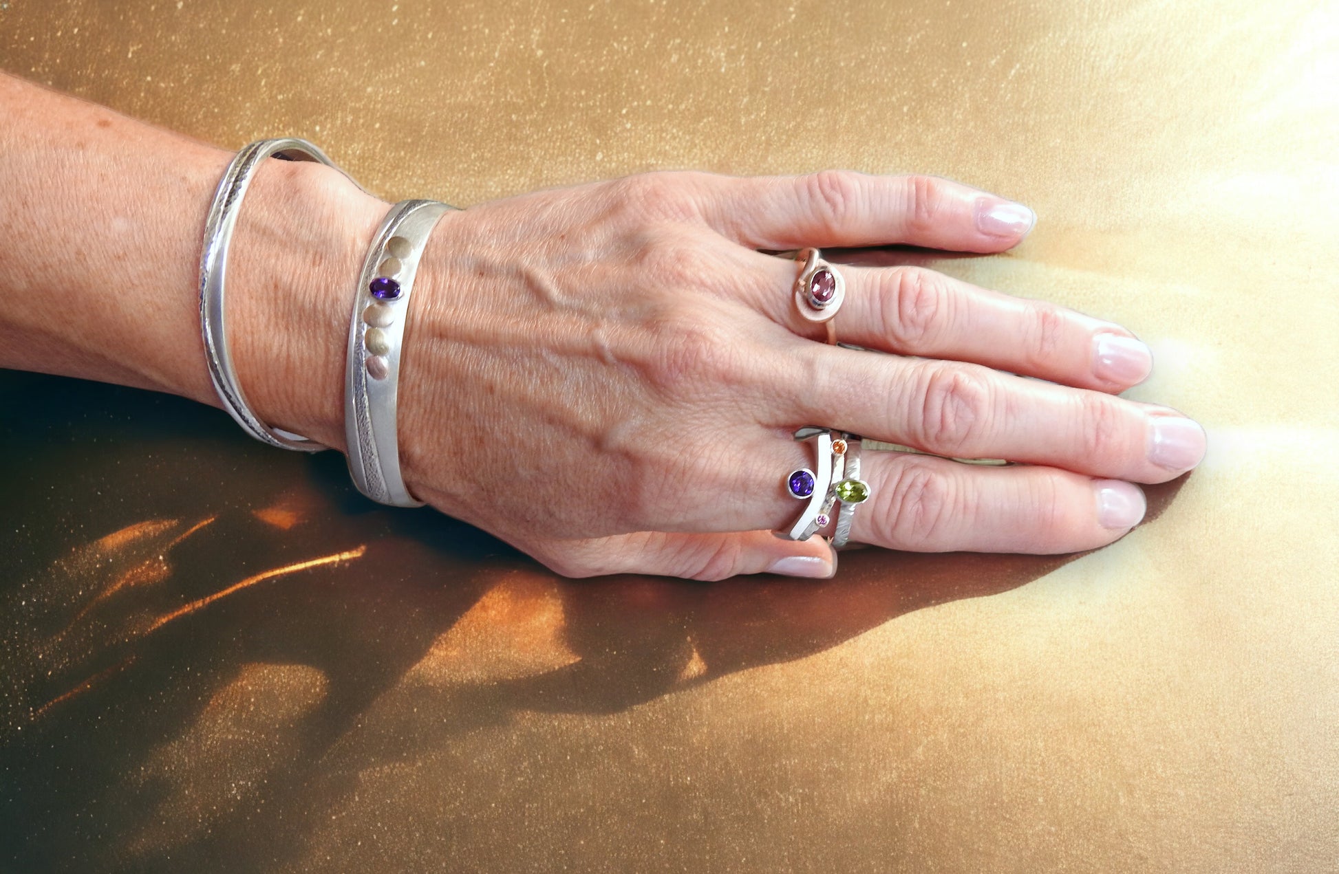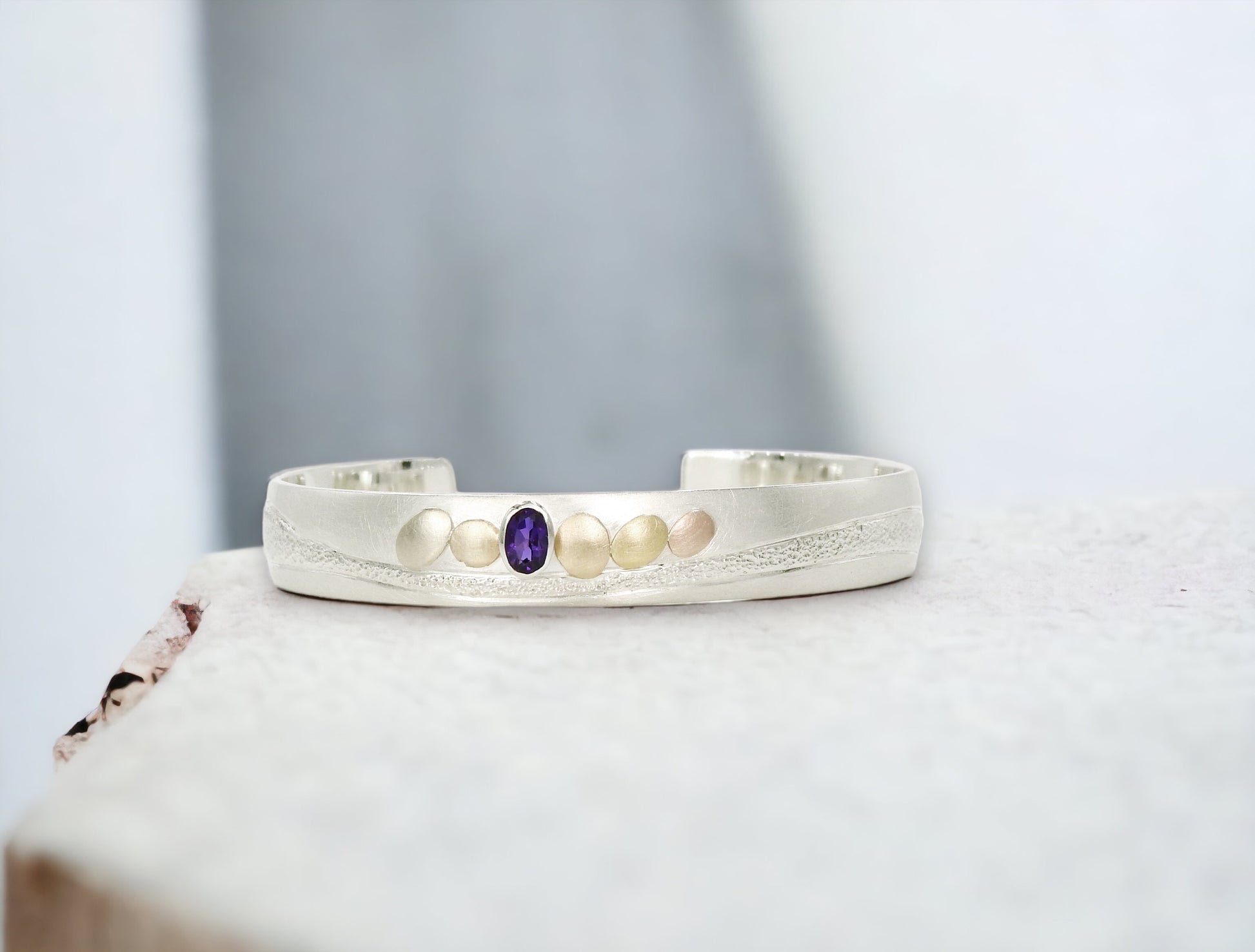 Shoreline to eternity ~ in sterling silver with 14kt yellow and red gold pebbles and 18kt yellow gold pebble, with 6x4mm oval facetted amethyst set in sterling silver bezel, hand carving and planish detailing.