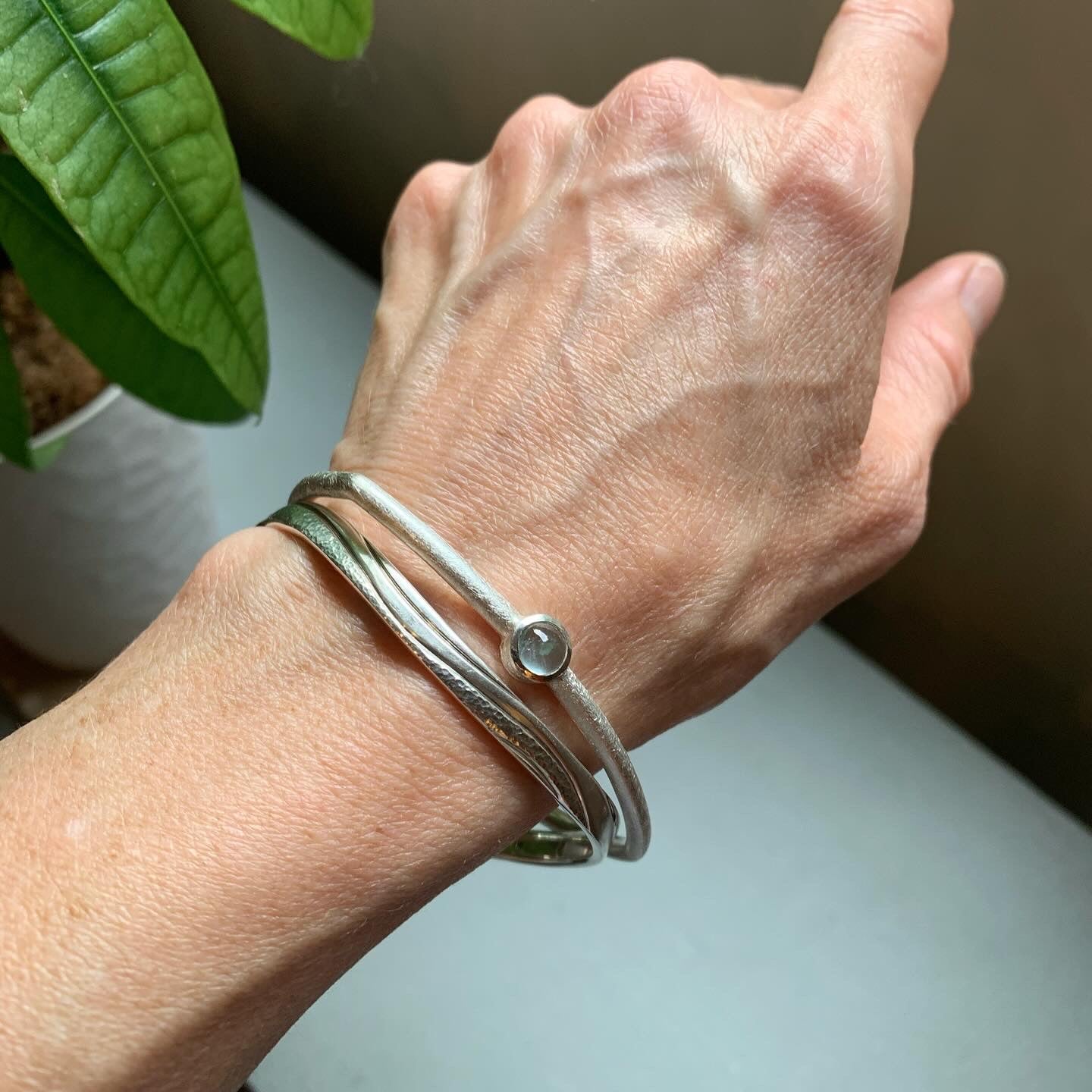 3.2mm soft triangle bangle with 6mm round aquamarine cab bezelled, high polish bezel with matte finish bangle.