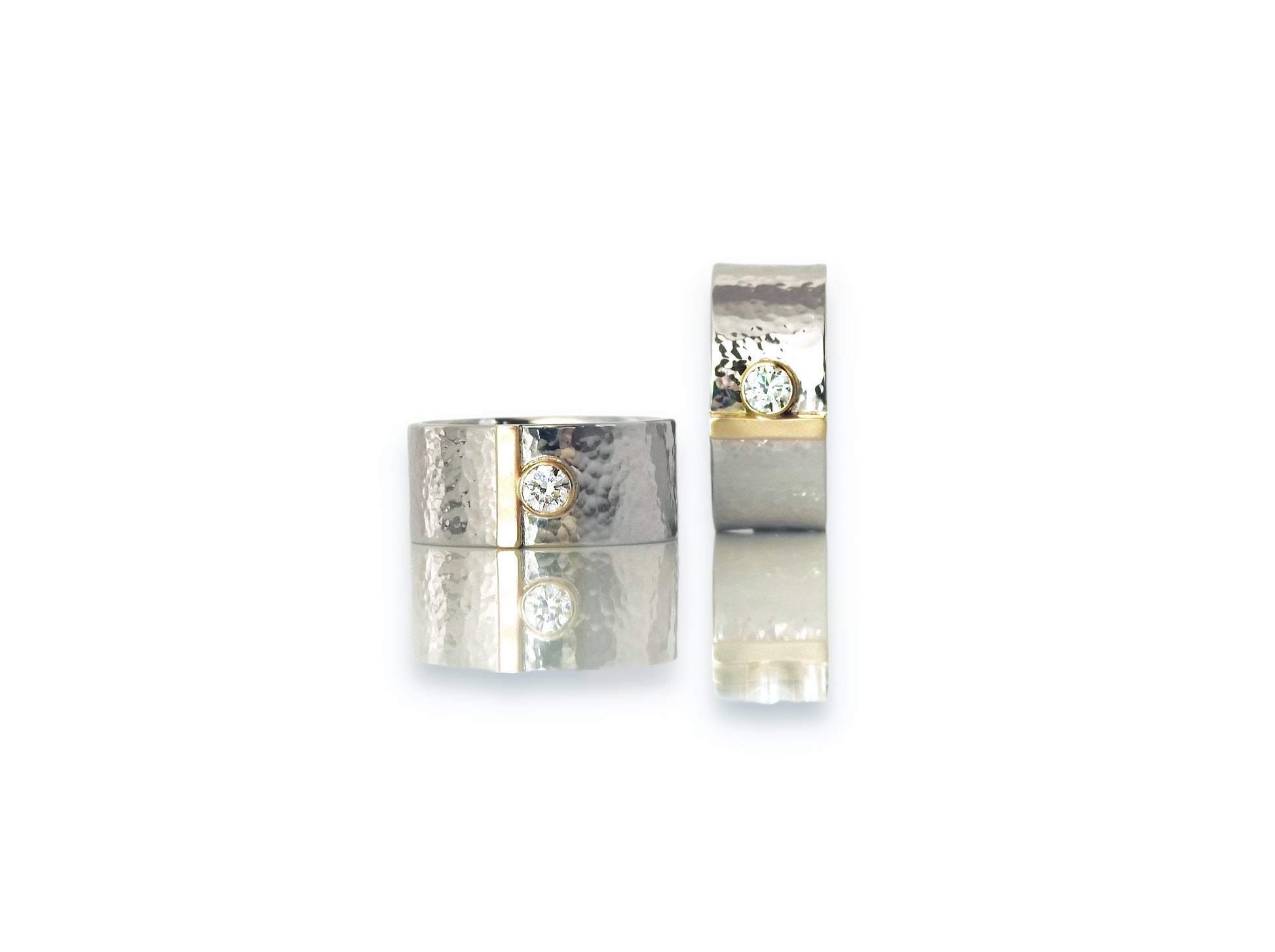 Bespoke 14kt white gold planish textured bands each with a VS; F+; FULL CUT; LAB GROWN DIAMOND set in a 14kt yellow gold bezel, and accent bar.