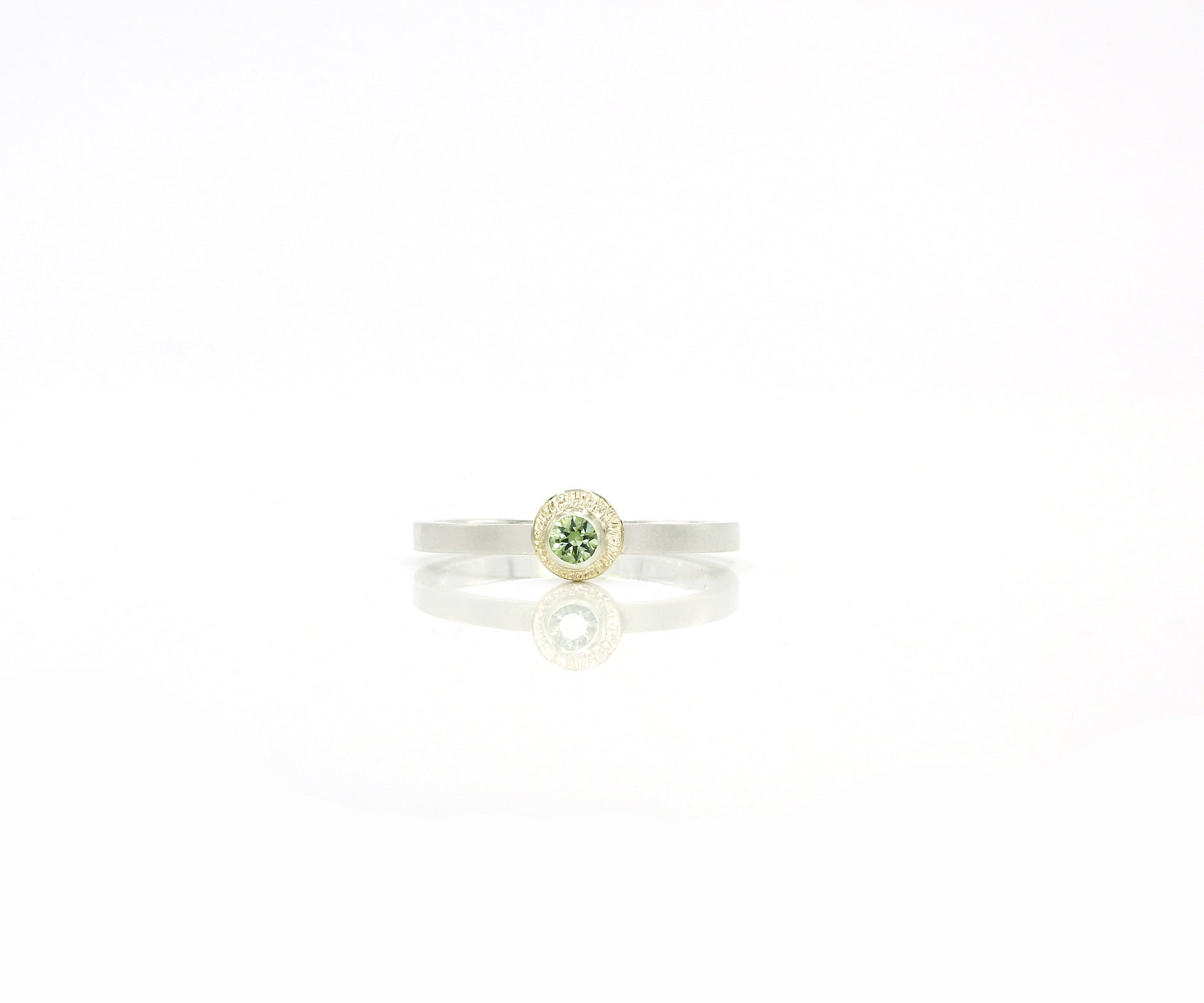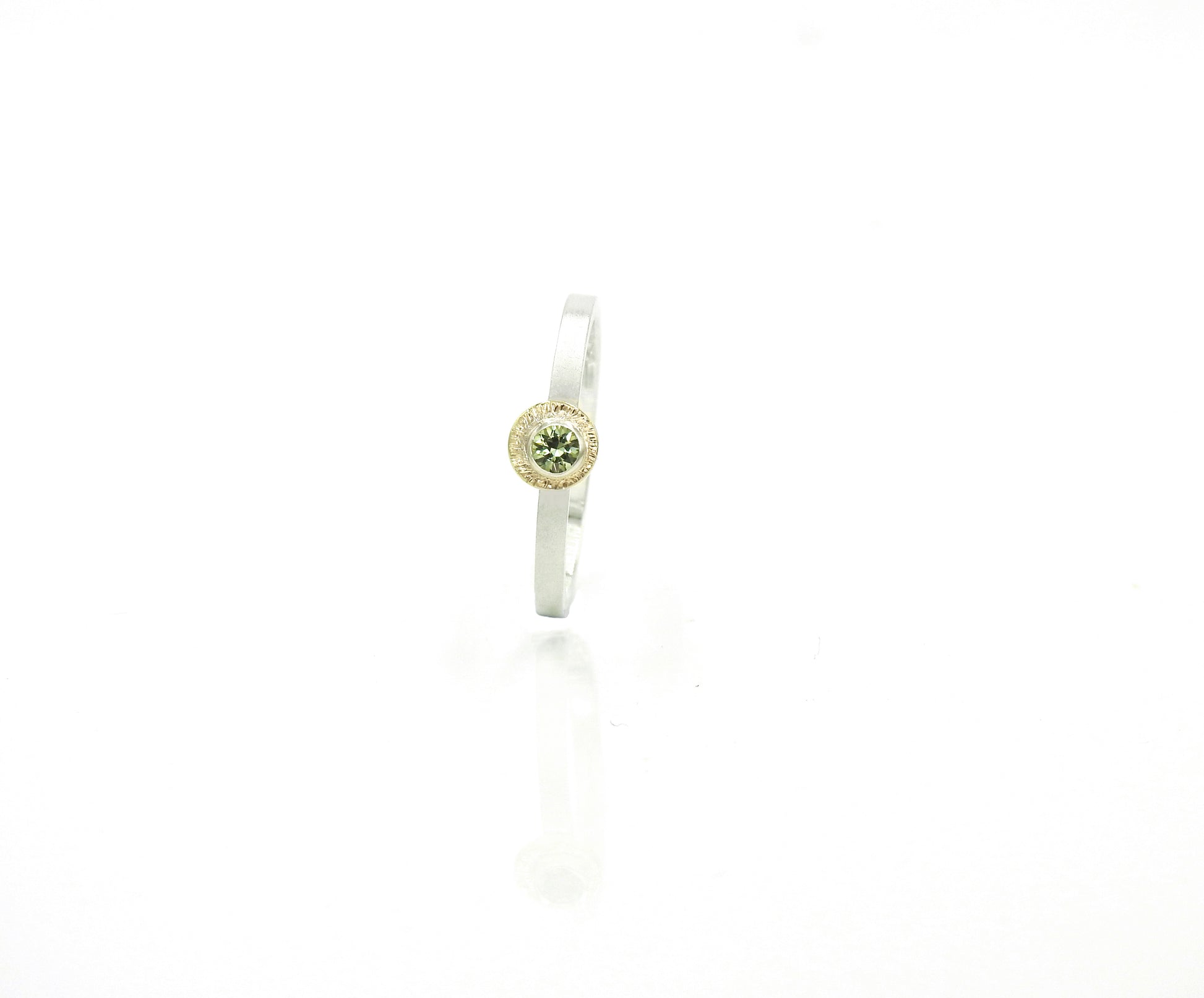 My new Aditi (Sanskrit: अदिति = "boundless”[a] or "innocence",[3] is a Vedic goddess in Hinduism, the personification of the infinite) stackers the first one is Surya (Sūrya) is a Sanskrit word that means the Sun). 14kt Yellow gold sun, with a 14kty gold bezel and off set round facetted 3mm green sapphire, on a 2mm 14kt white gold stacker band.