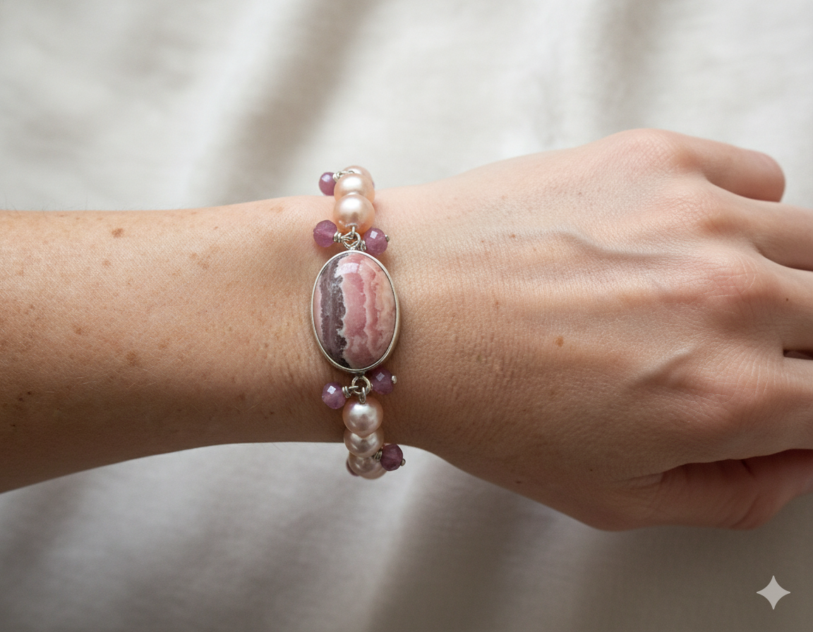 Rhodochrosite oval cab approximately 25mm x 17mm, set in a sterling silver bezel with 8.5-9.5mm round natural coloured cultured pink pearls, sterling silver tied facetted rondel shaped beads and 12mm sterling silver lobster clasp.