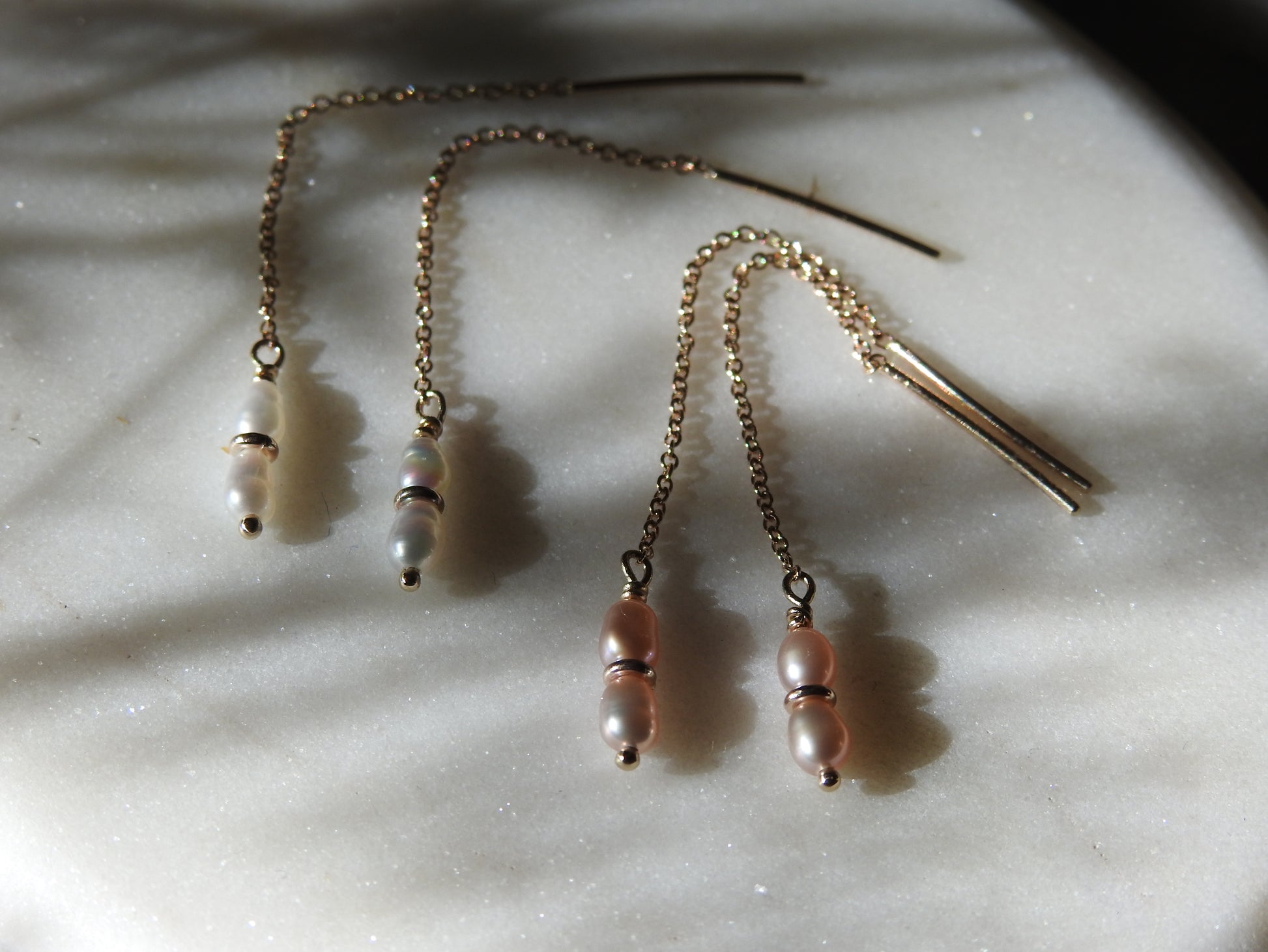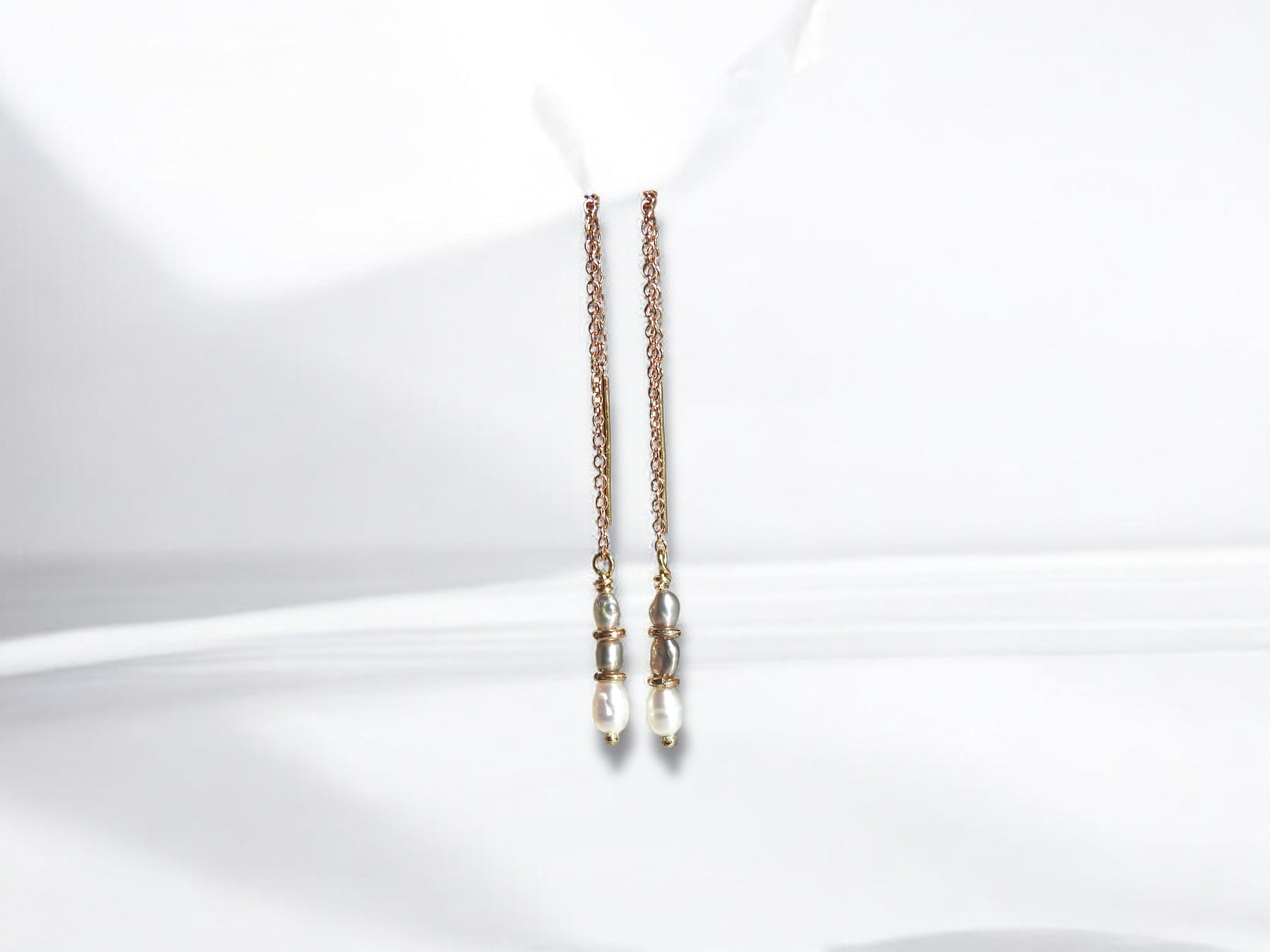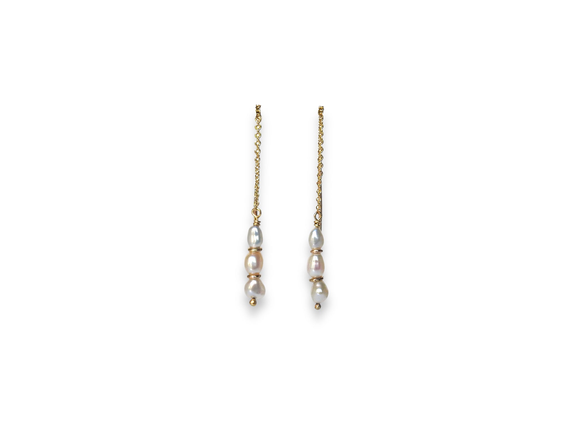 : Threaded cable chain earrings with tied rice pearls, with gold accent beads in-between.