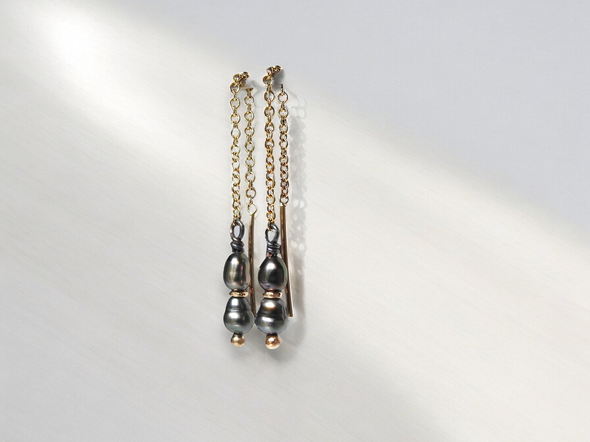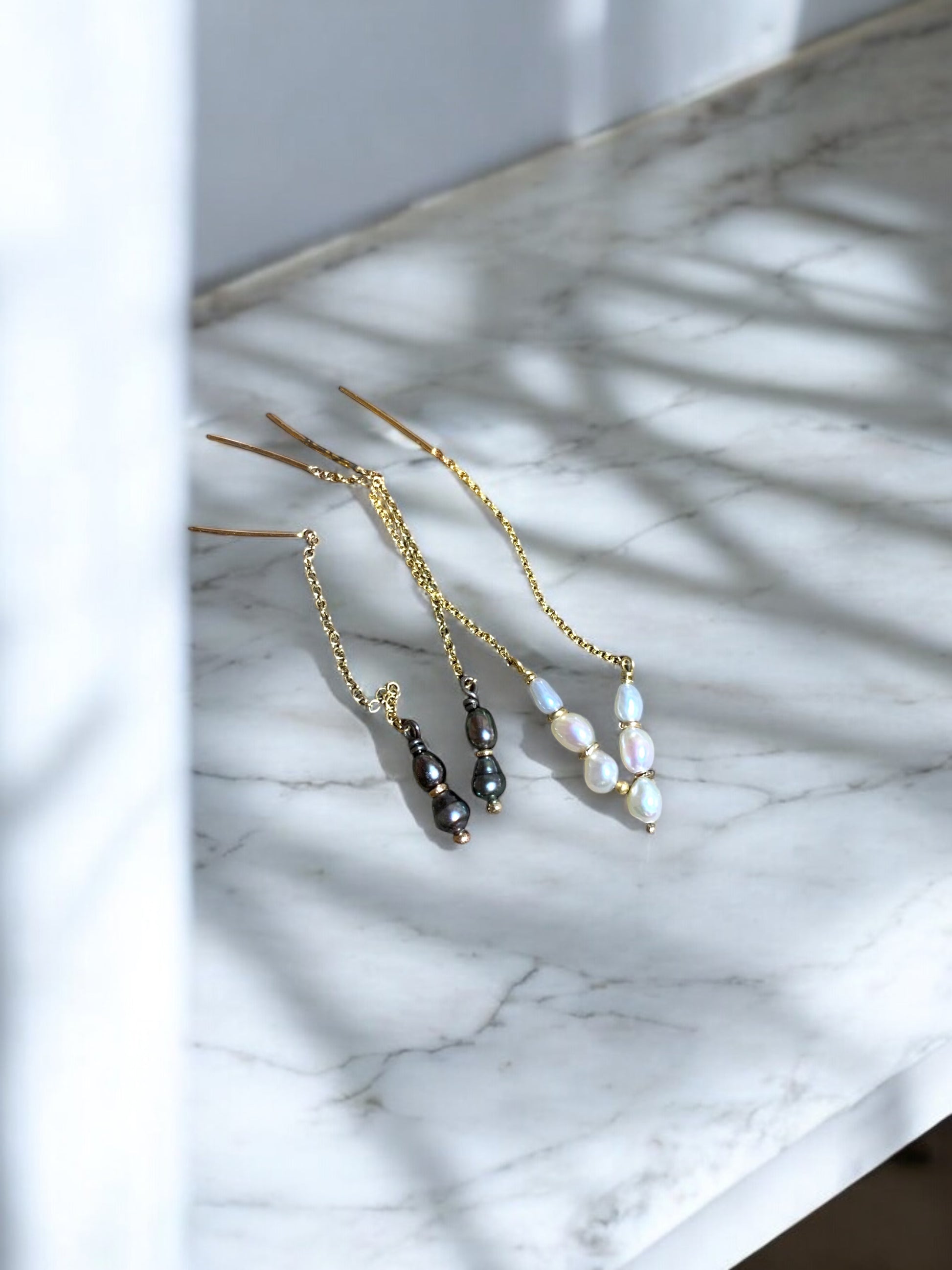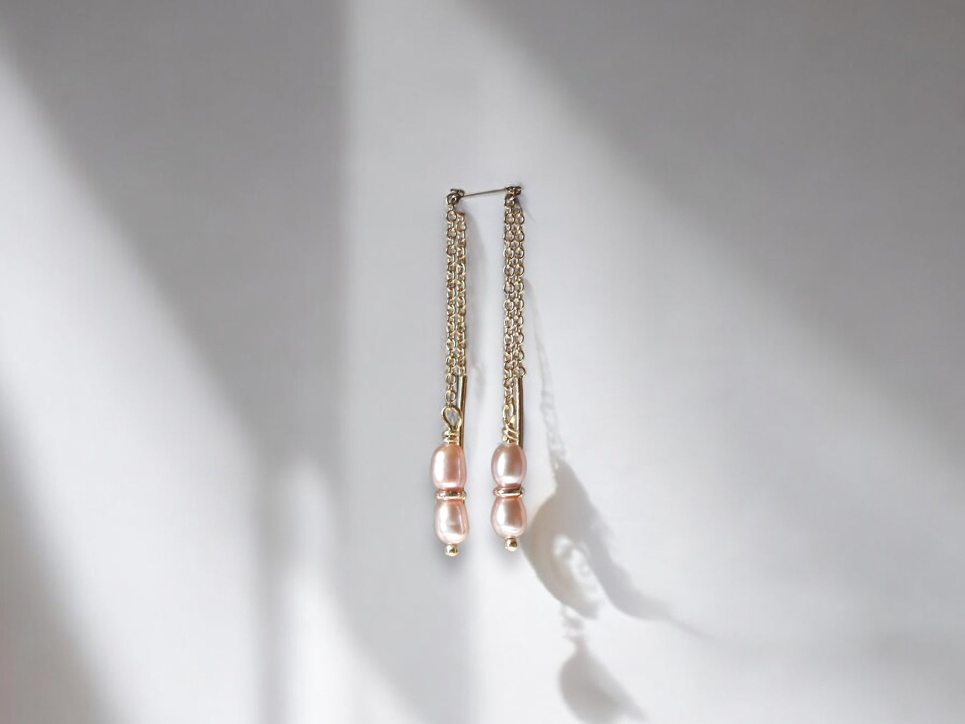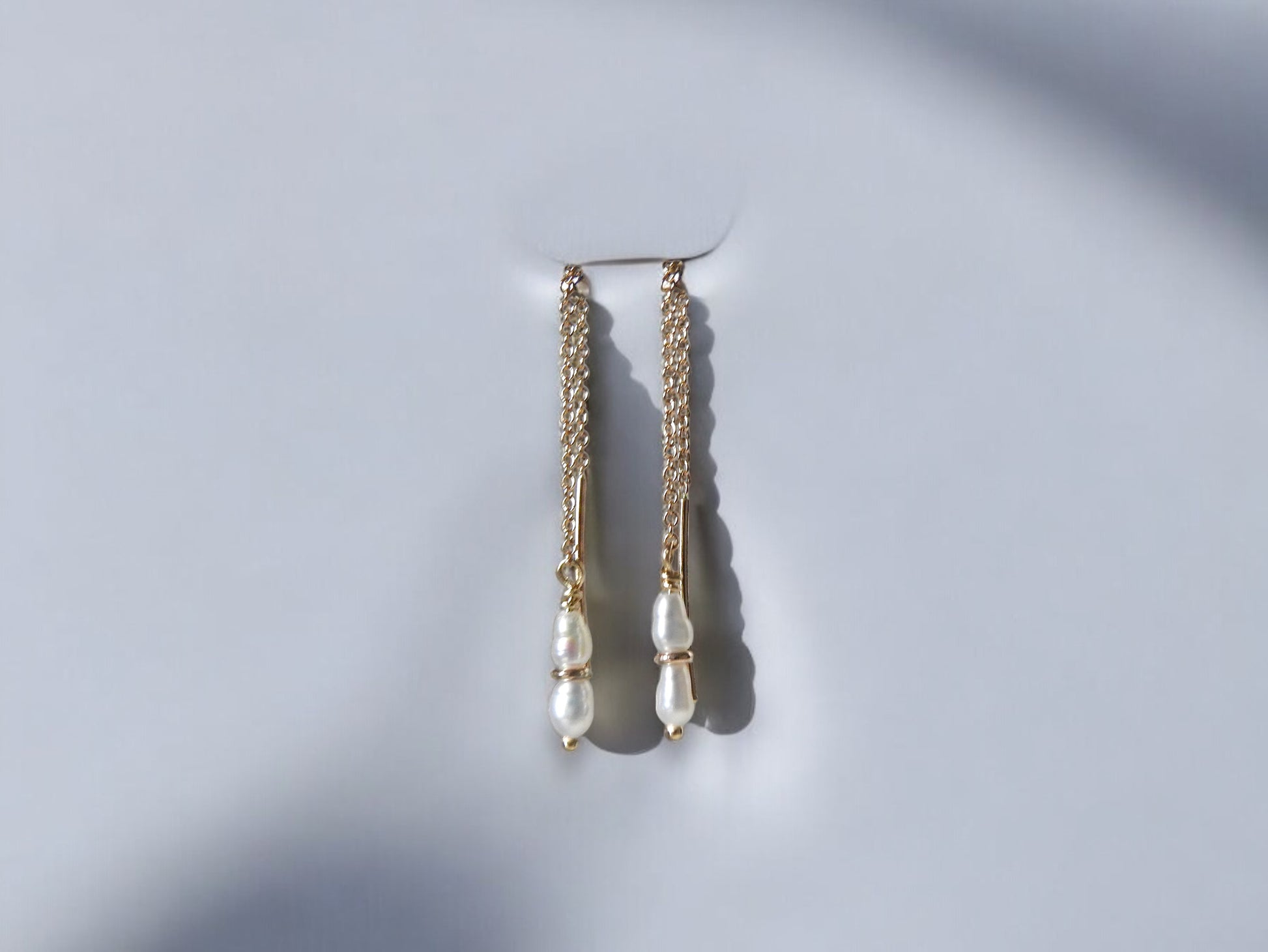 : Threaded cable chain earrings with tied rice pearls, with gold accent beads in-between.