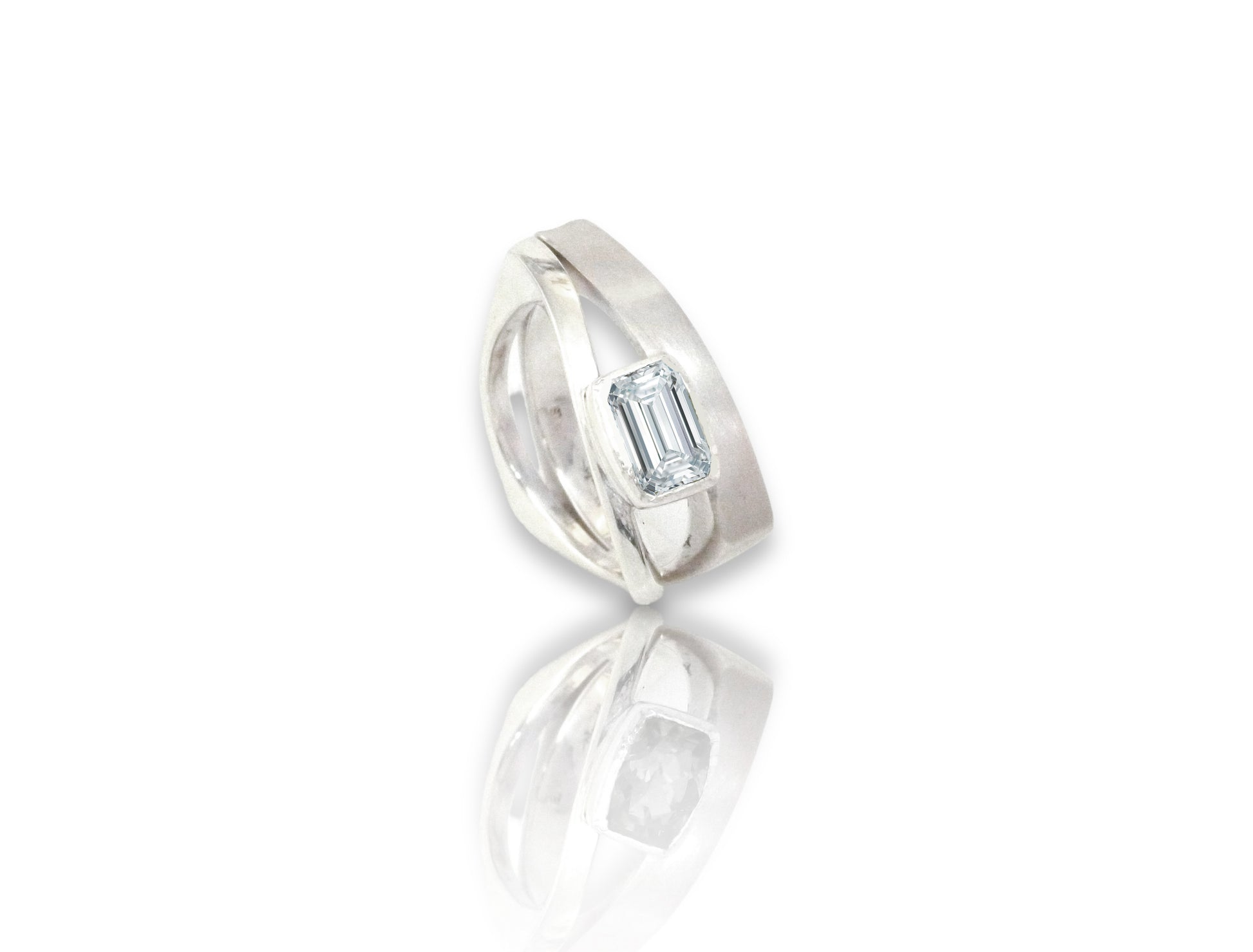 Unique triangular ring with openness, and flow, with floating bezel set emerald cut diamond.