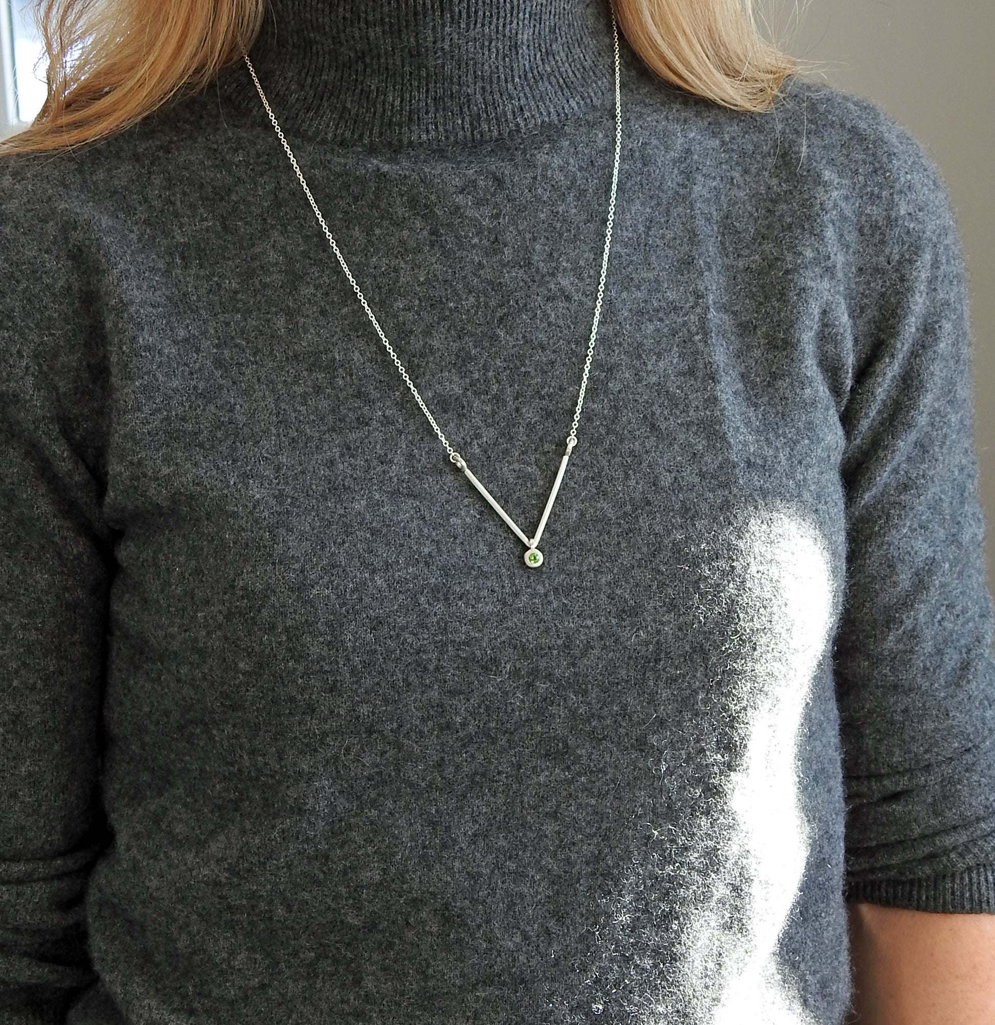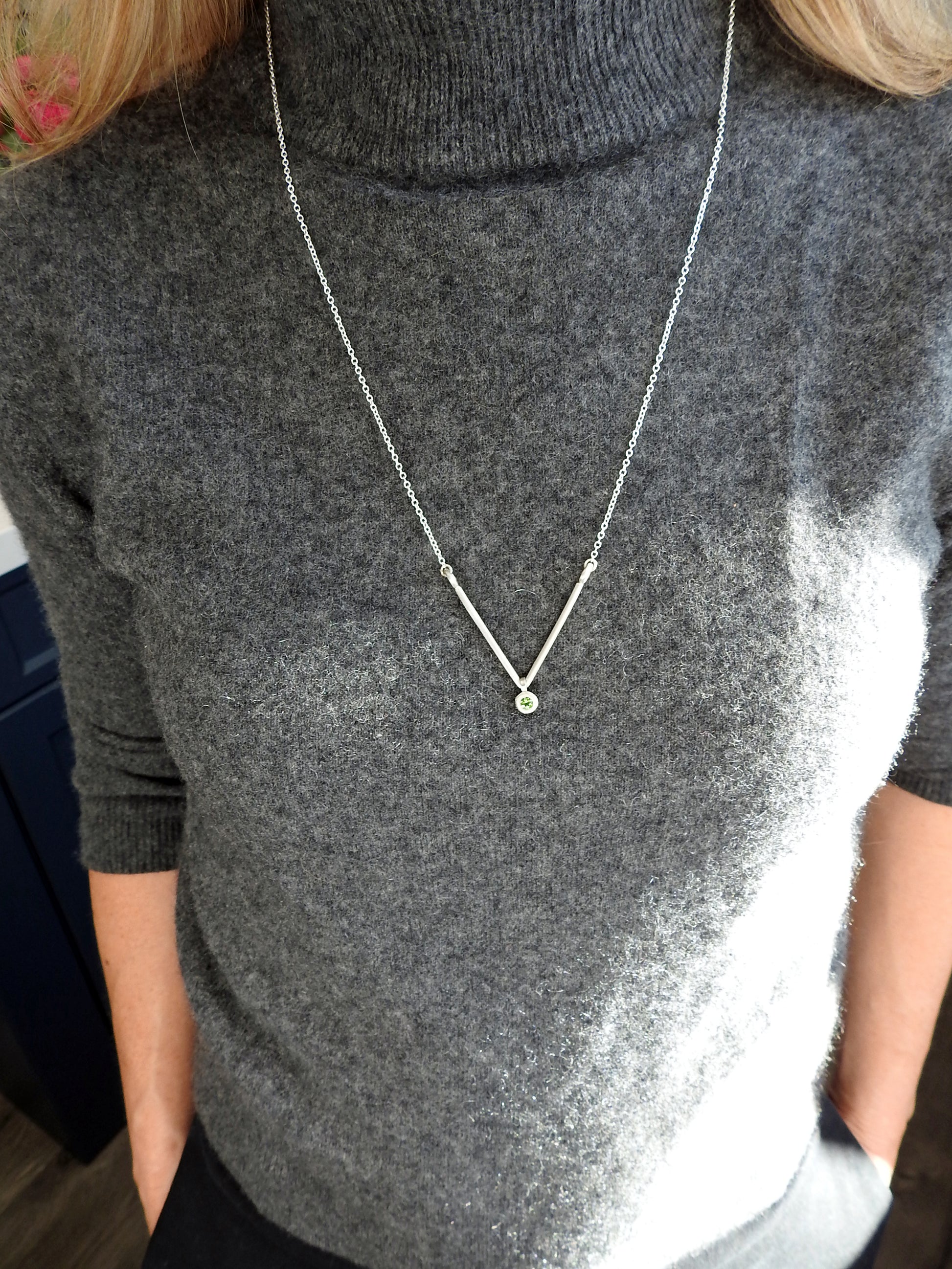 Tsavorite power, 3.5mm round facetted tsavorite garnet set in a sterling silver organic water cast pebble, hanging from a triangle with a matte finish.