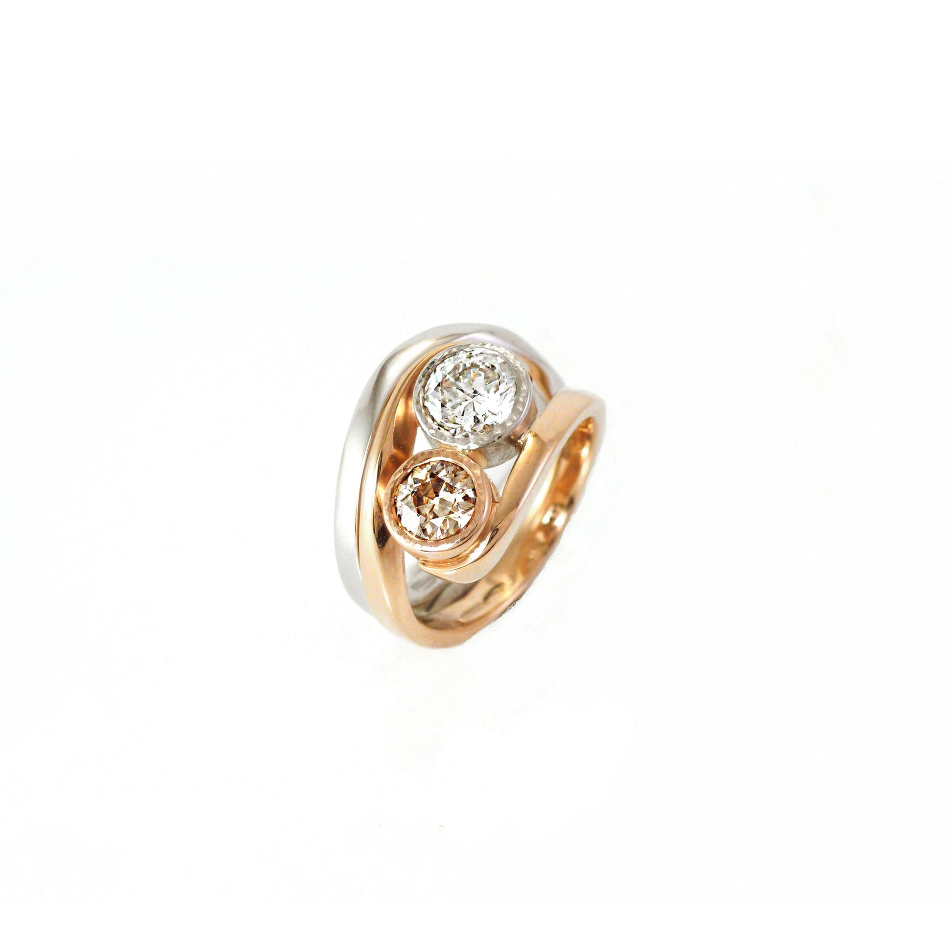 18kt white and yellow gold organically you wrapped ring, embracing two brilliant cut diamonds, one larger round brilliant cut diamond, and one slightly smaller cognac brilliant cut diamond.