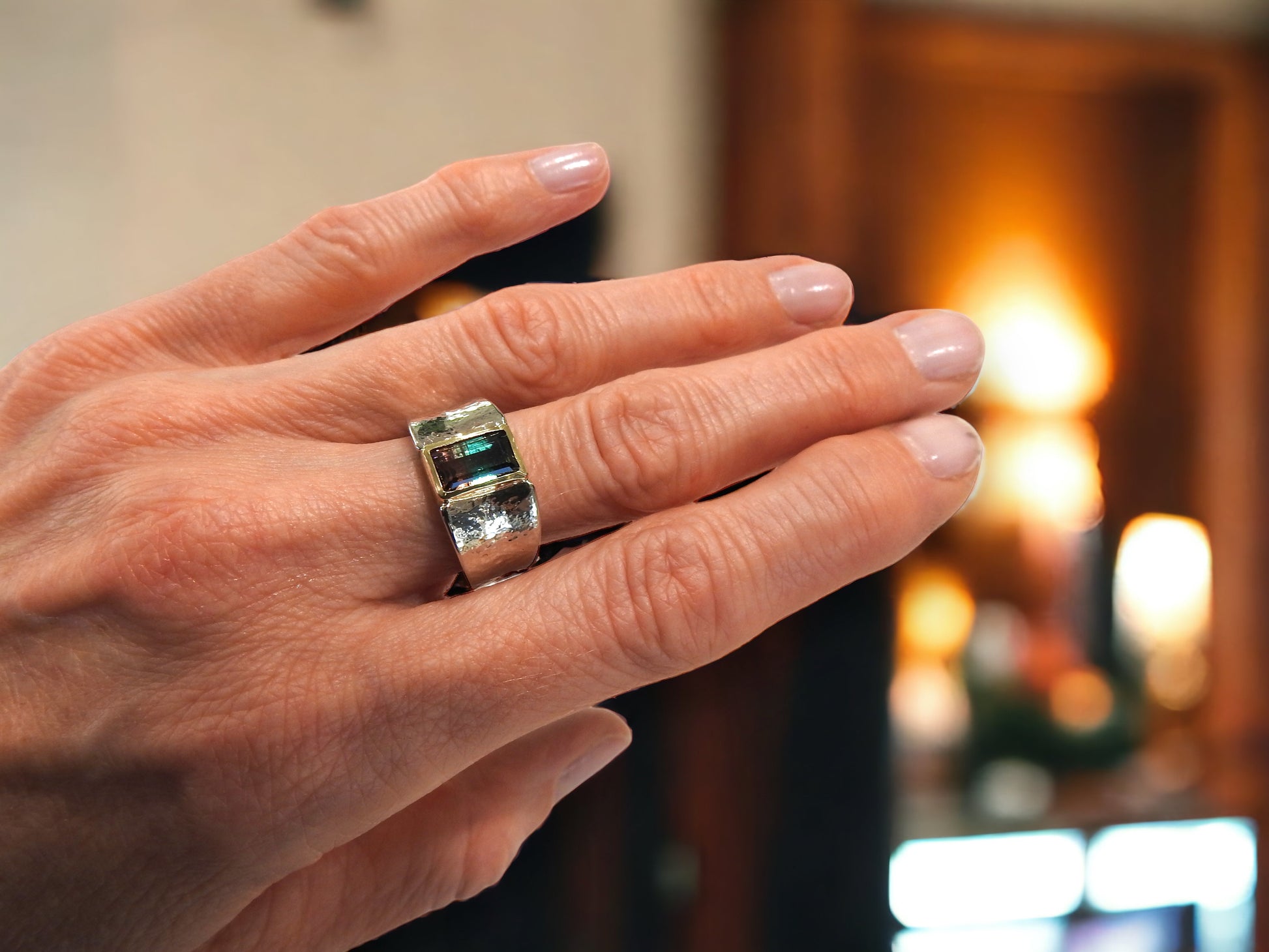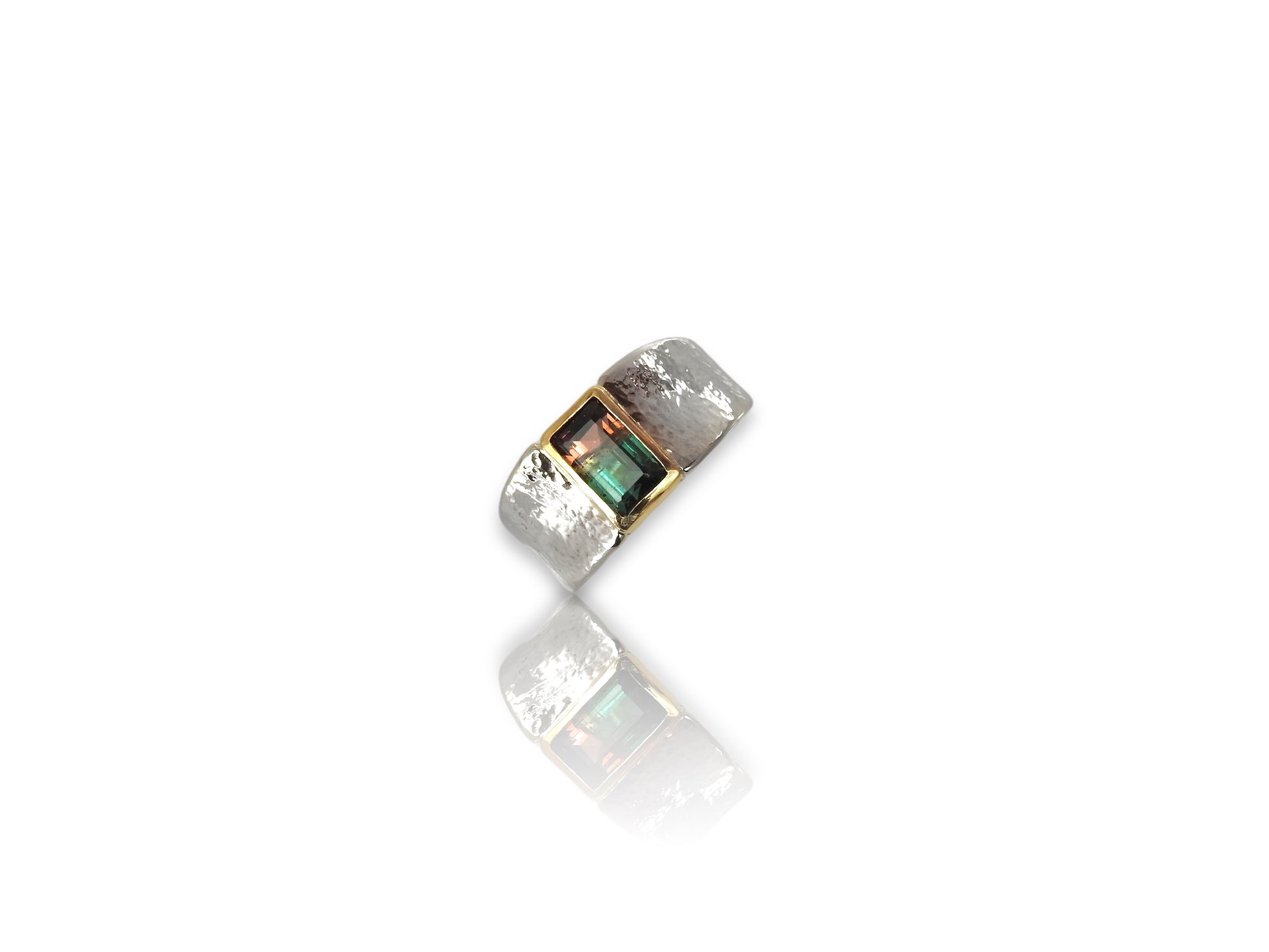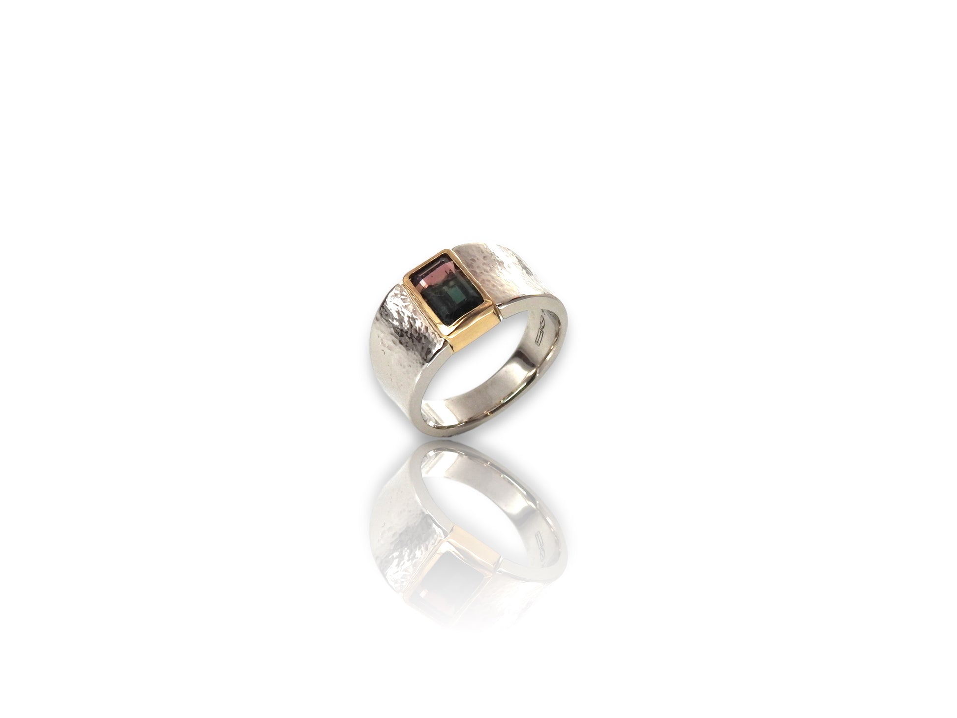 Bespoke ring: watermelon tourmaline 18kt yellow gold bezel with 14kt white gold tapered, concave soft planished band.