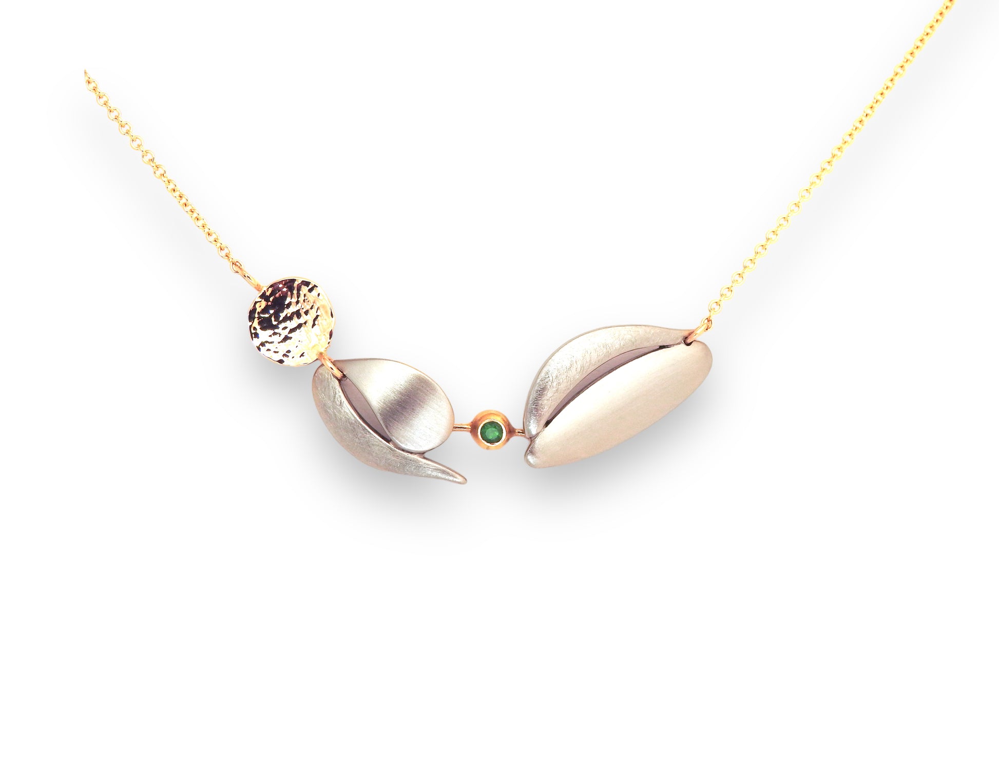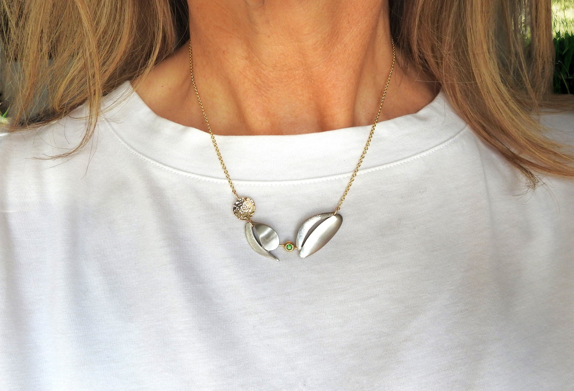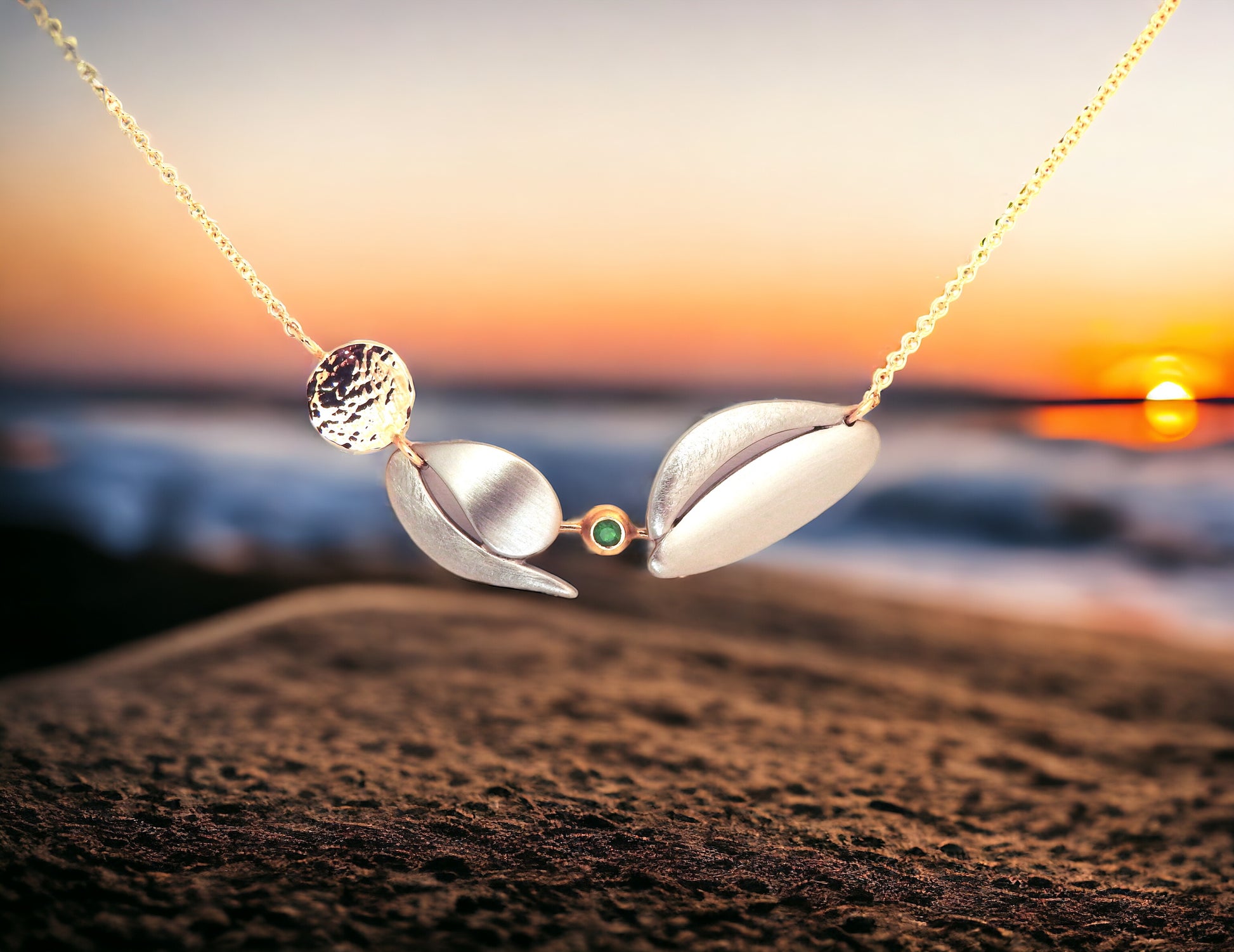 Soft organic landscape shapes in stainless steel with a planished 14kt yellow gold sun, and a 14kt yellow gold emerald bezel centre link all hanging on a 10kt yellow gold cable chain 16" long