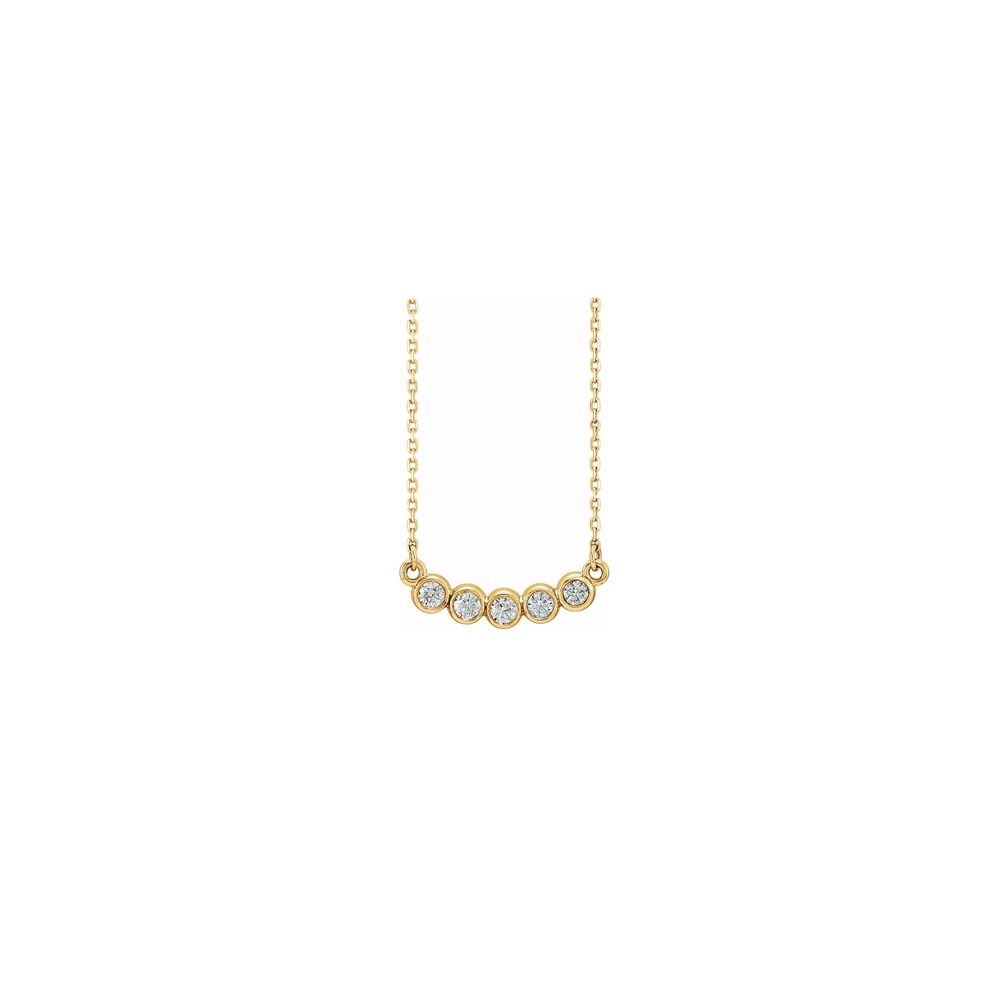 Classic 14kt white gold bezel 5 stone curve pendant on 1mm cable chain.